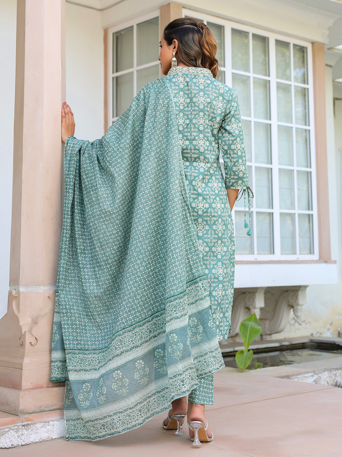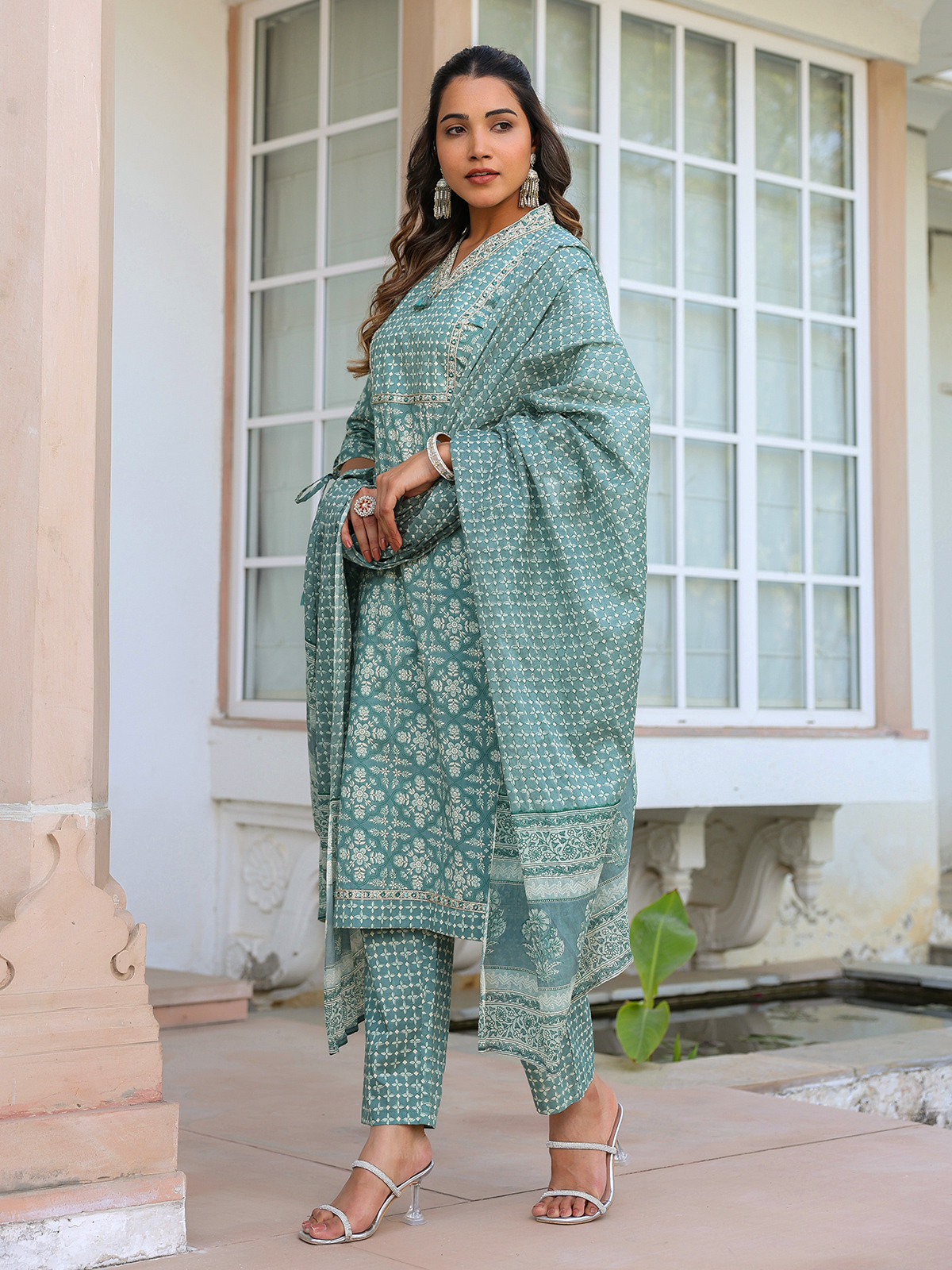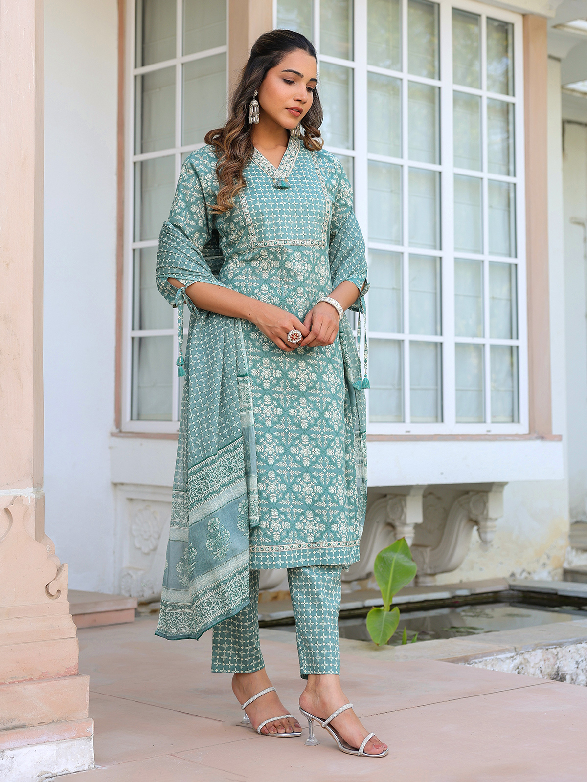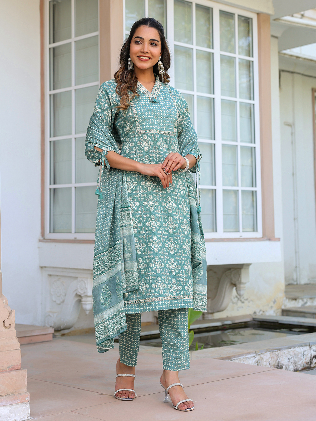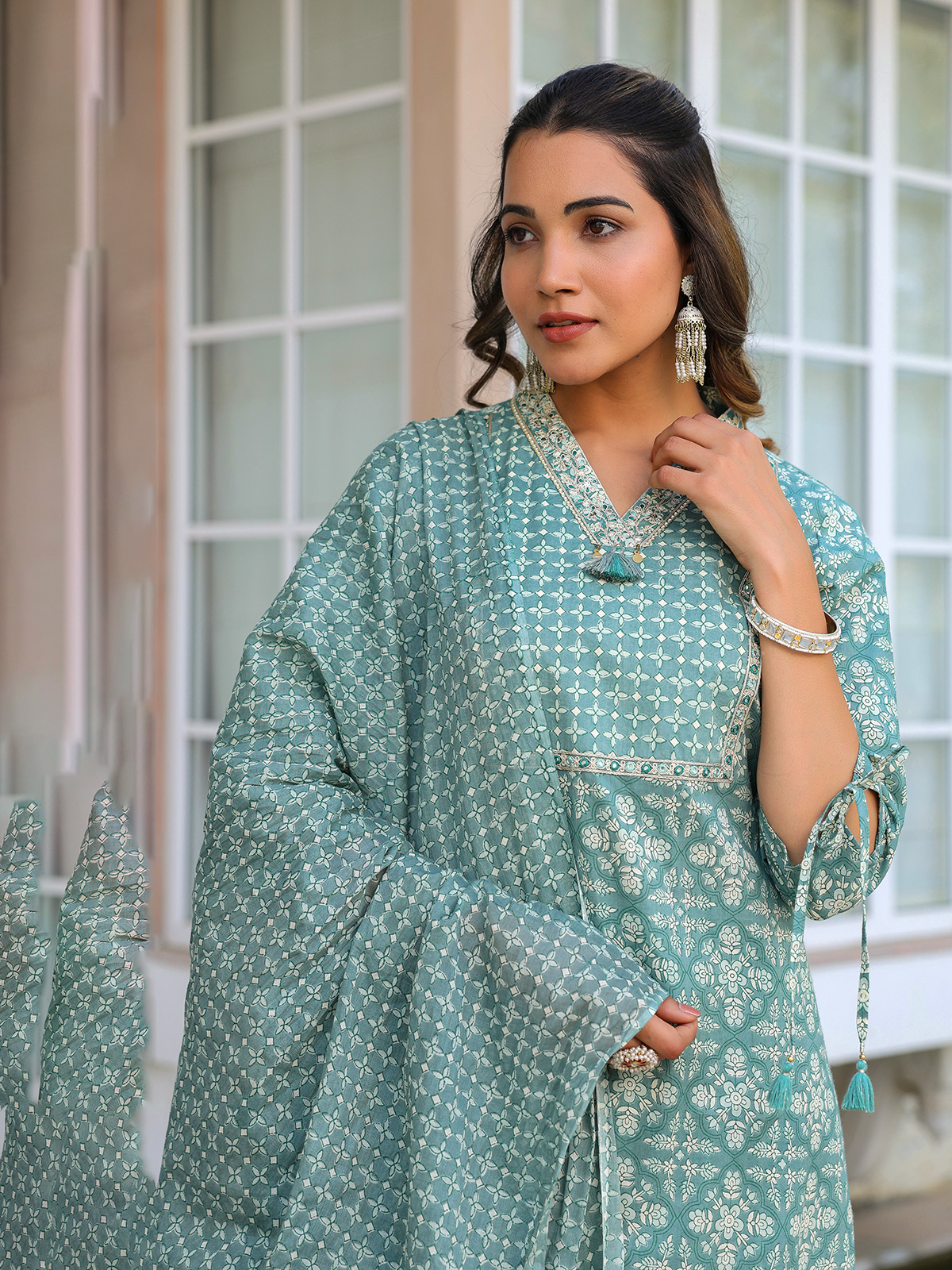 Showcasing subtle elegance, this dusty blue cotton kurti set offers a calm and graceful festive look. Styled with a V neckline and quarter sleeves, adorned with printed patterns along with resham and sequins detailing. Perfect for festive occasions, it comes with a pant and a printed dupatta for a soft and sophisticated appearance.