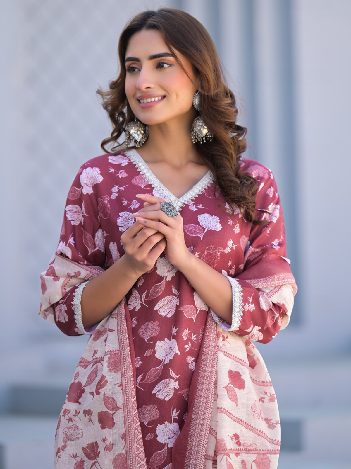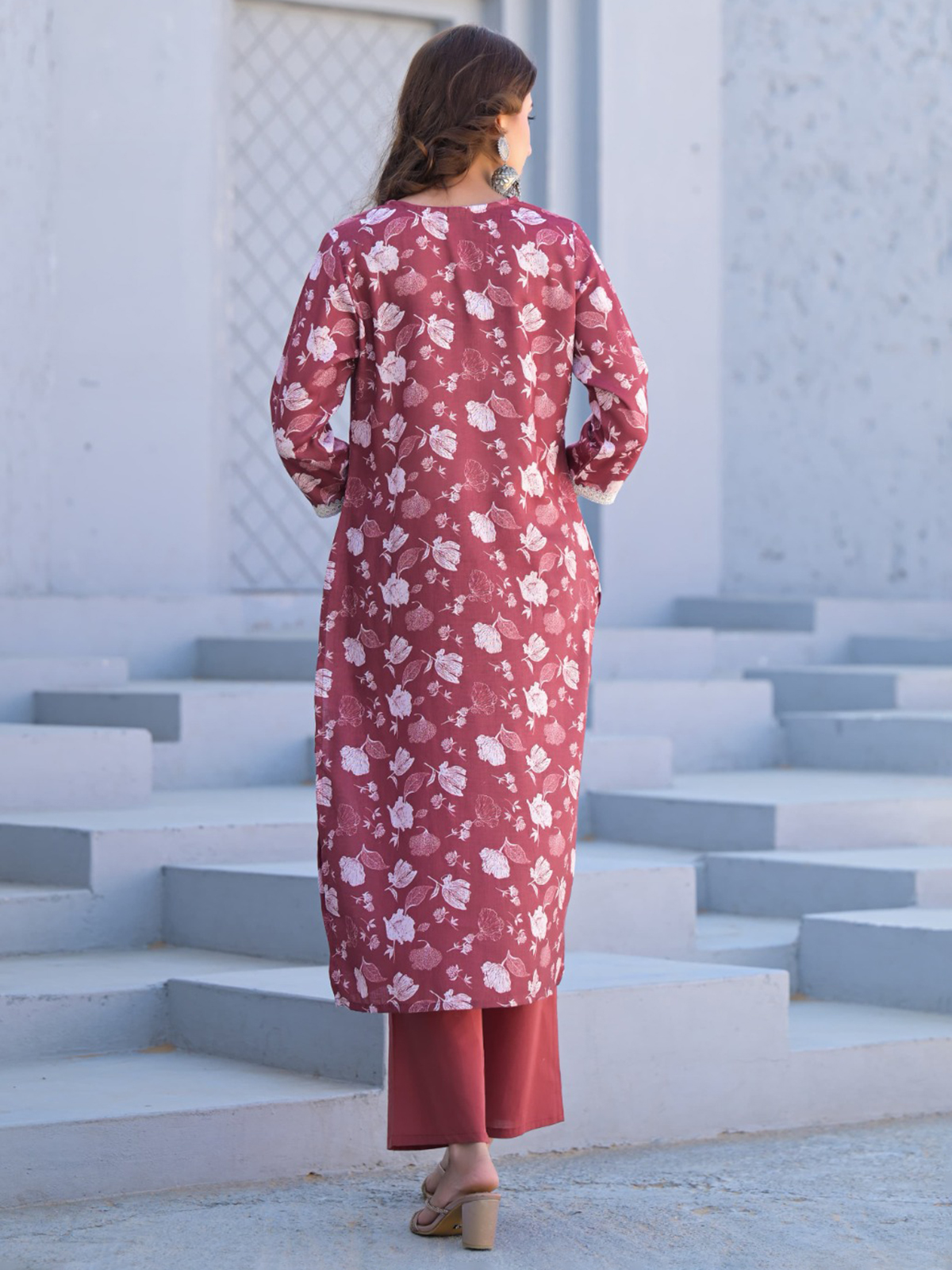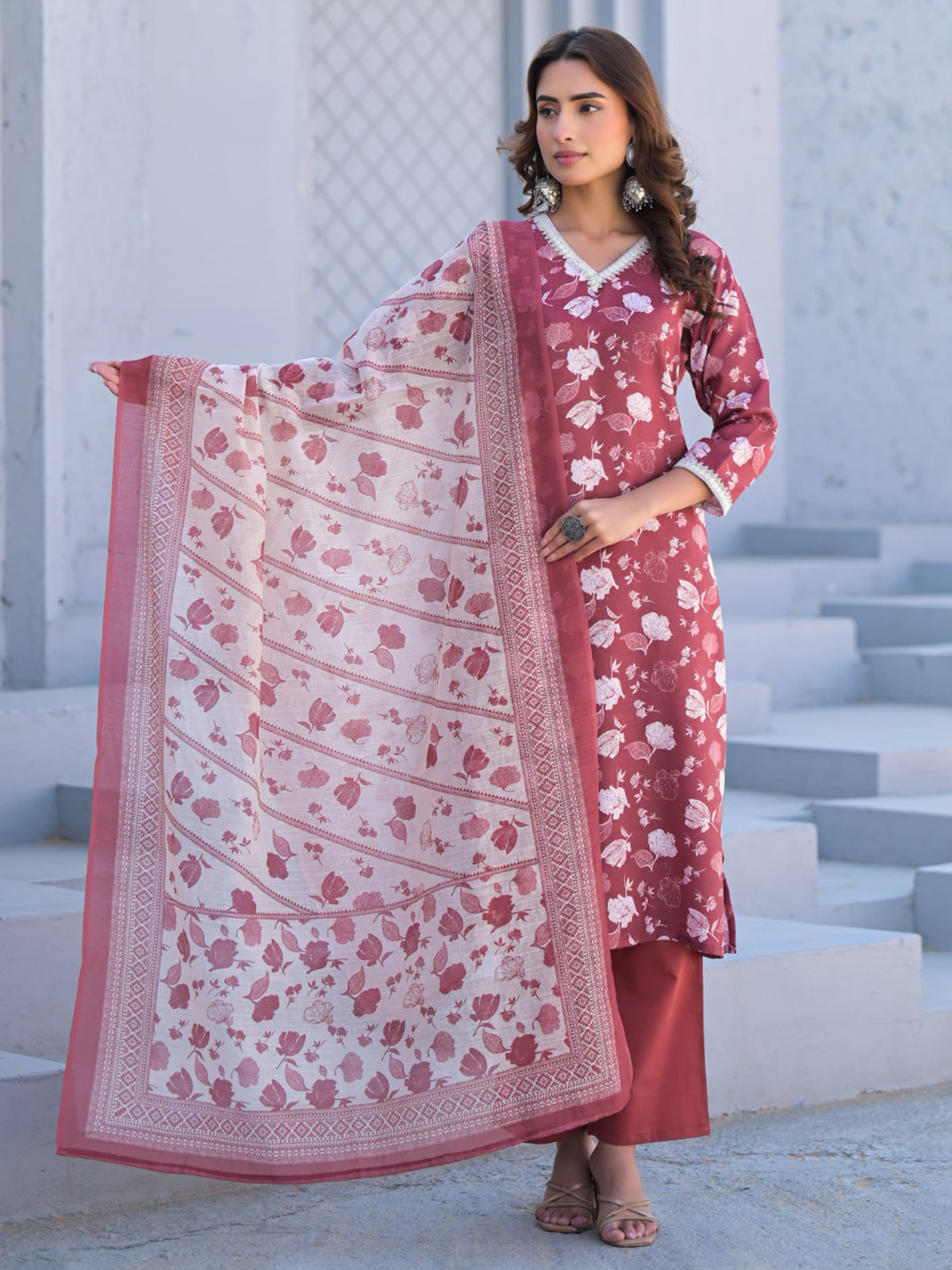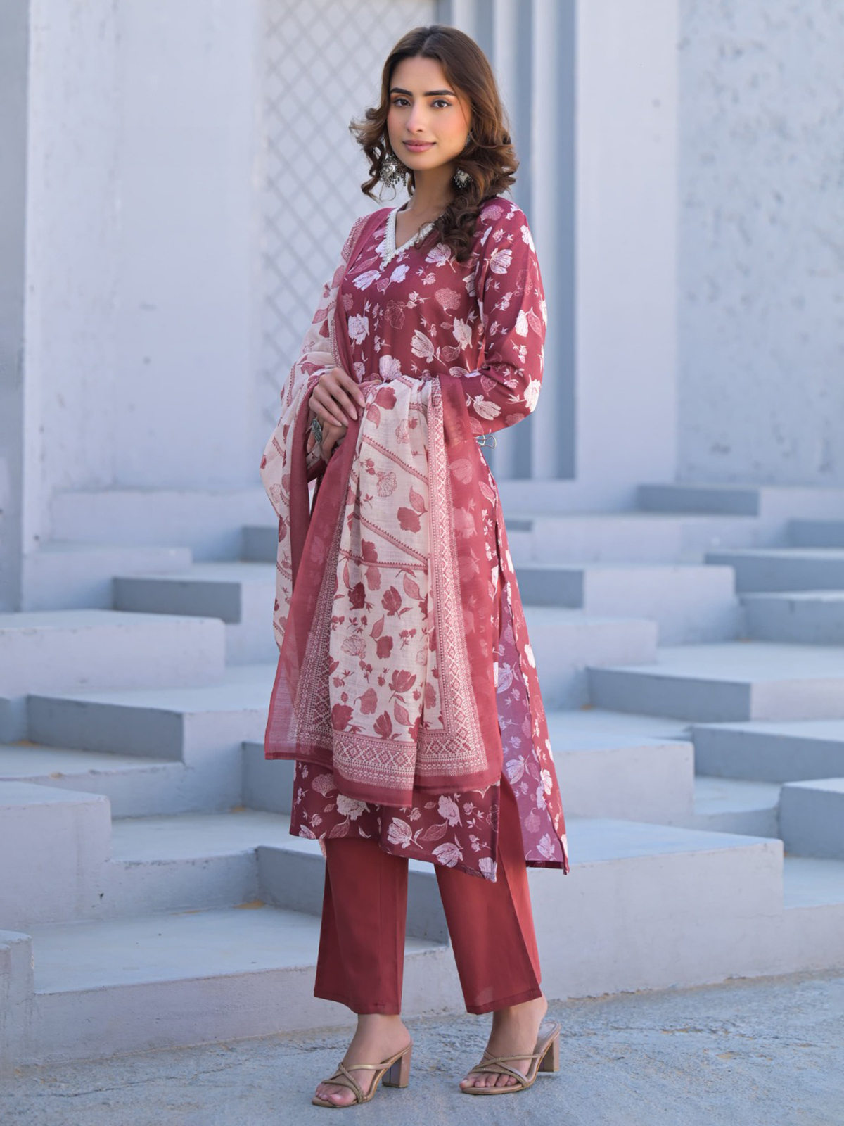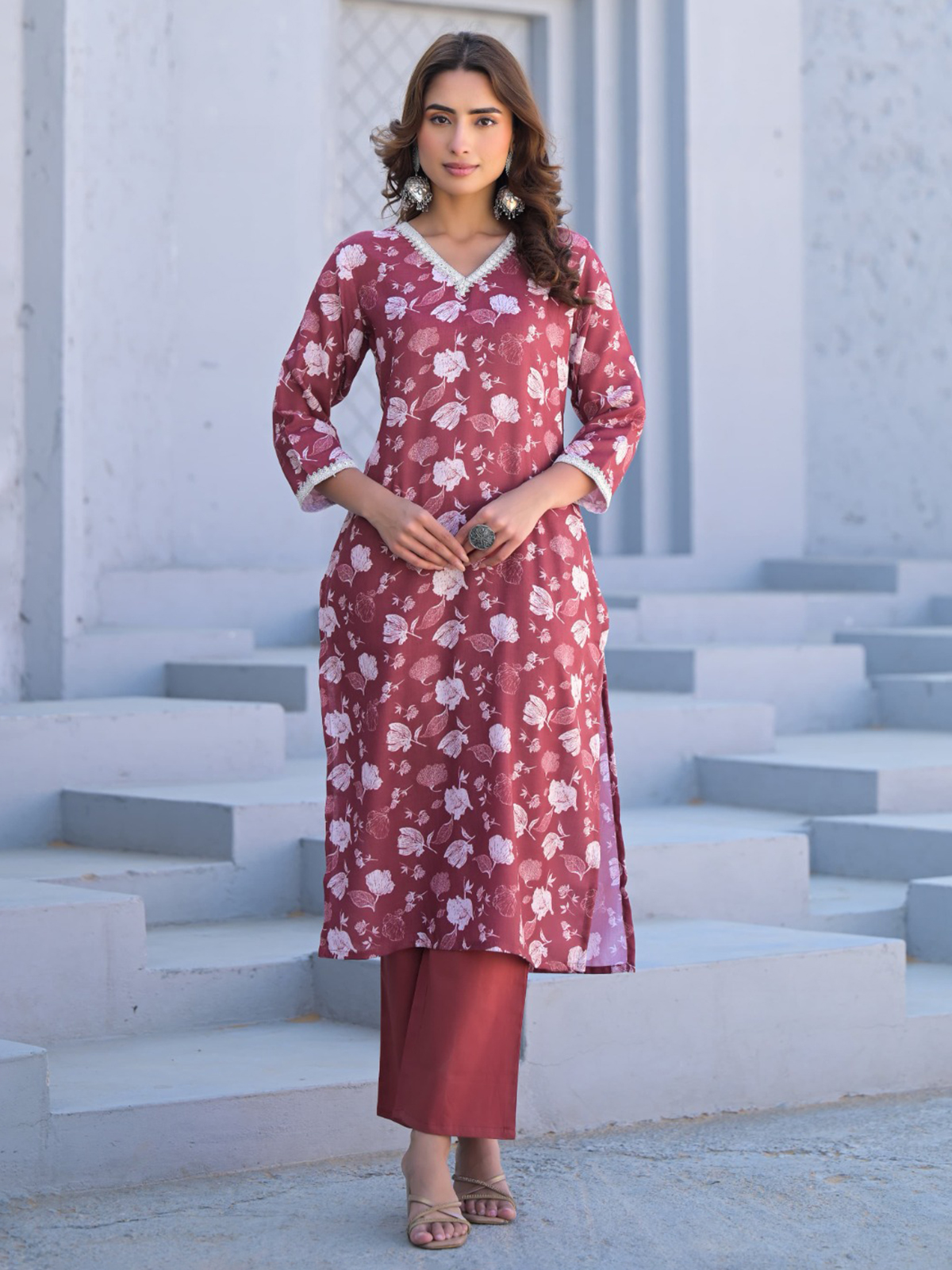 This brown printed cotton silk kurti set combines comfort and elegance, making it a perfect choice for any occasion. The soft cotton silk fabric offers a luxurious feel, while the intricate print adds a touch of charm. The V-neck and quarter sleeves provide a flattering fit, ensuring both comfort and style throughout the day.
