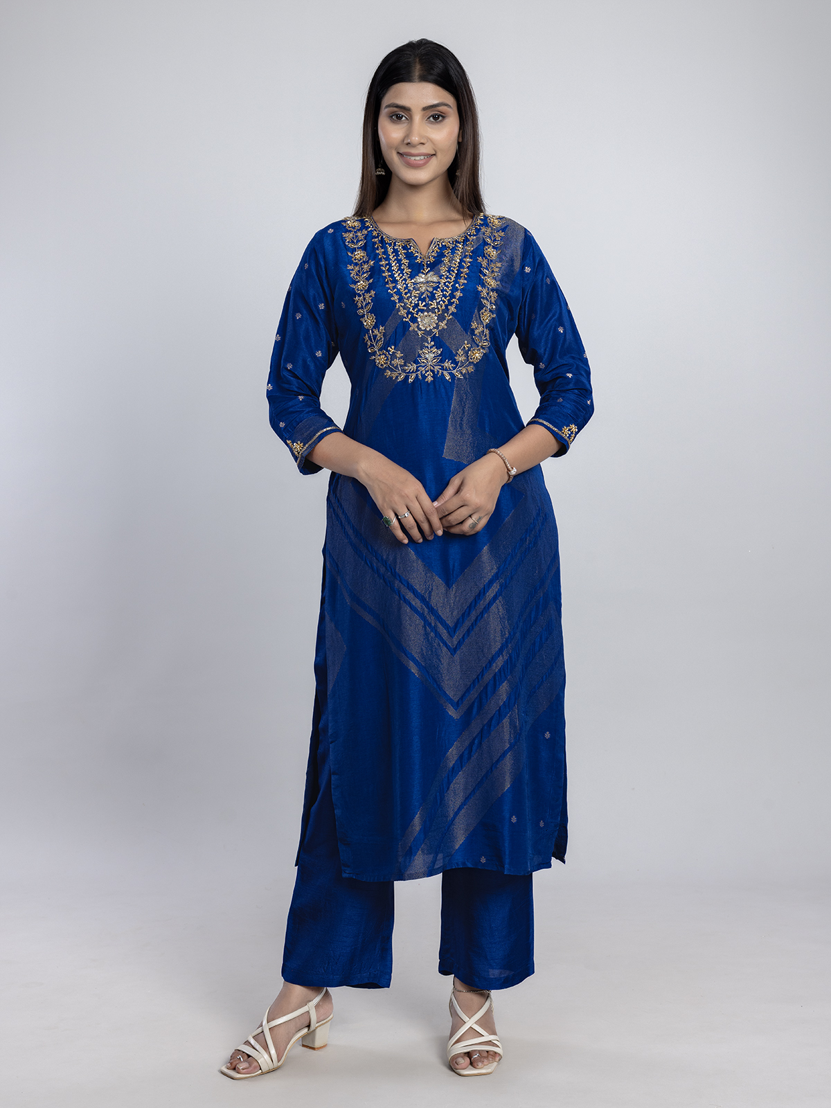 Shine bright in this elegant blue silk kurti set crafted with stunning sequins, resham, beads, and cutdana embellishments. Styled with quarter sleeves and matching pants, it exudes festive elegance and timeless appeal. Ideal for parties or celebrations, this ensemble perfectly balances luxury, comfort, and contemporary style.