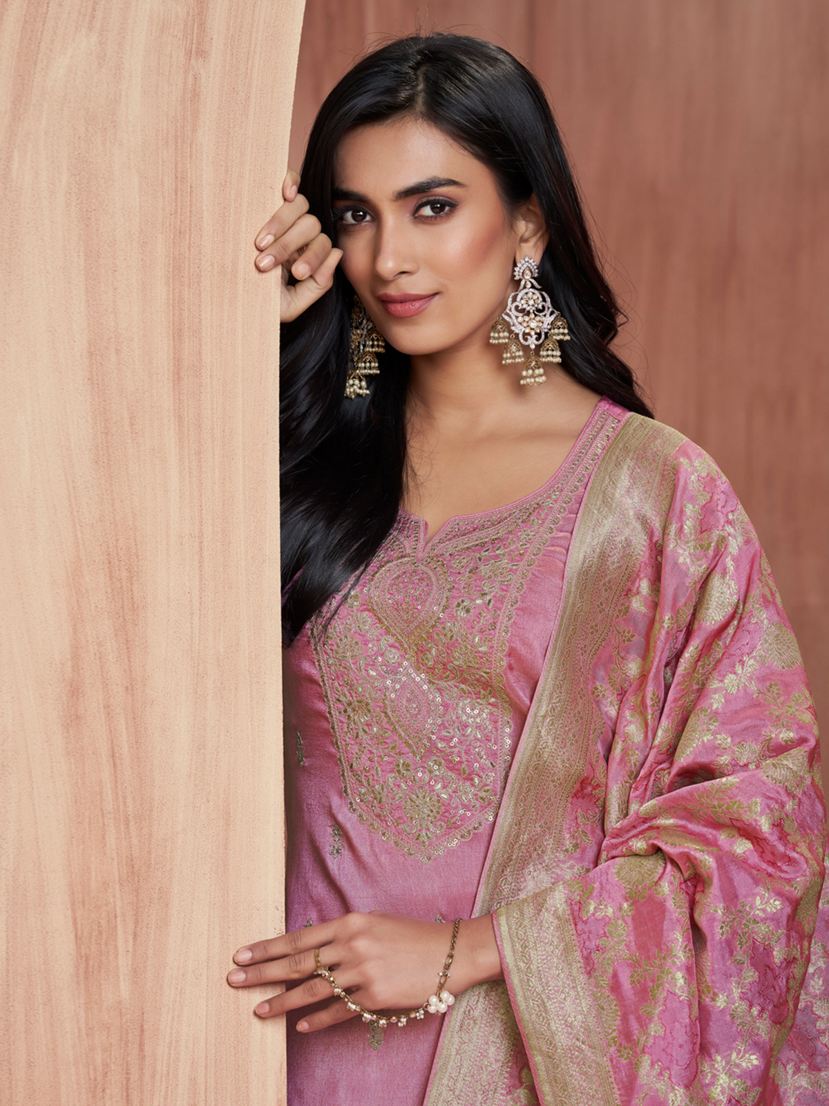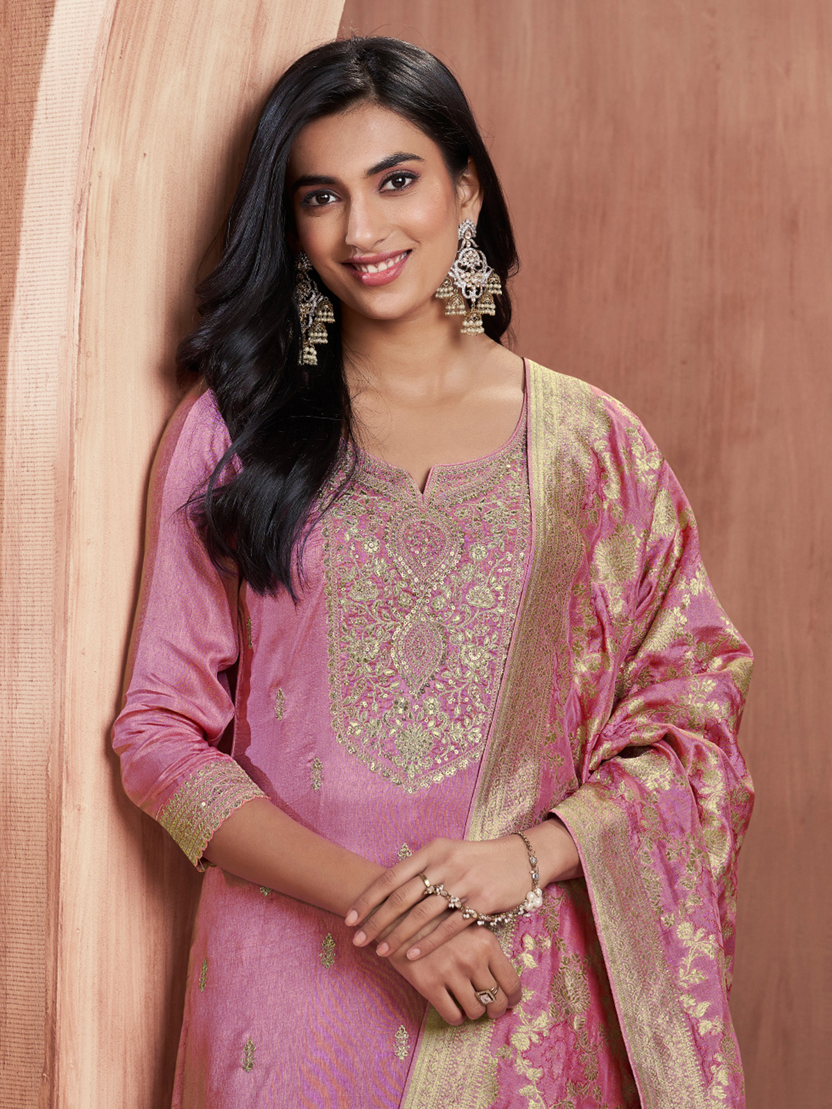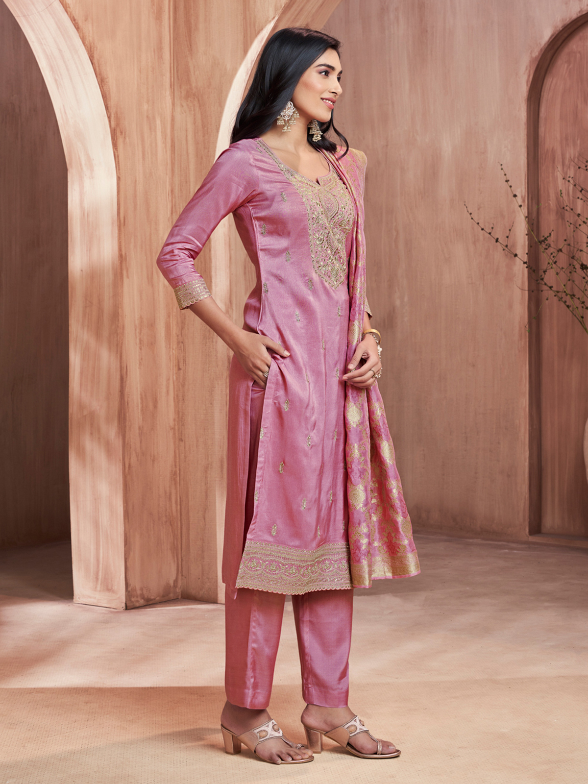 Embrace soft sophistication in this light pink silk kurti set, designed for graceful festive moments. Styled with a round neckline and quarter sleeves, it features detailed zari, resham, and sequin embellishments. Paired with a pant and matching dupatta, it’s ideal for festive and Eid occasions.