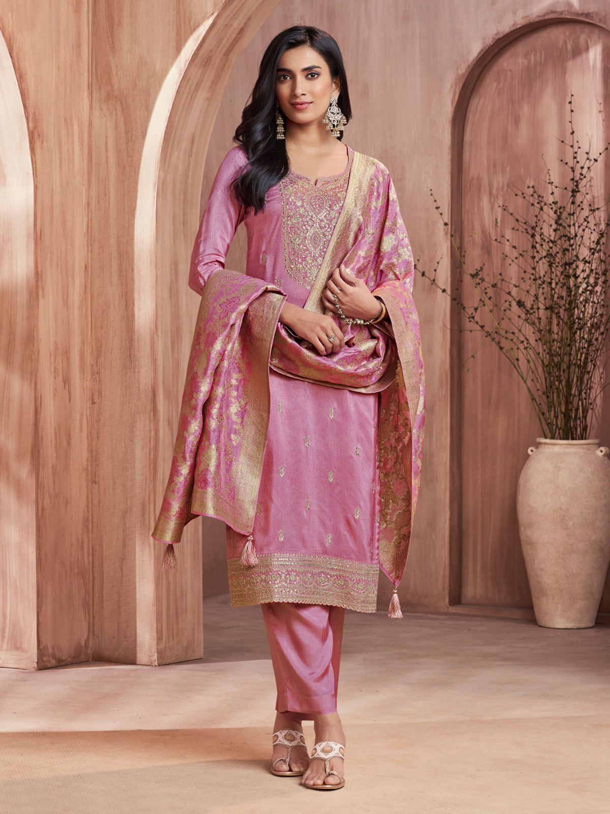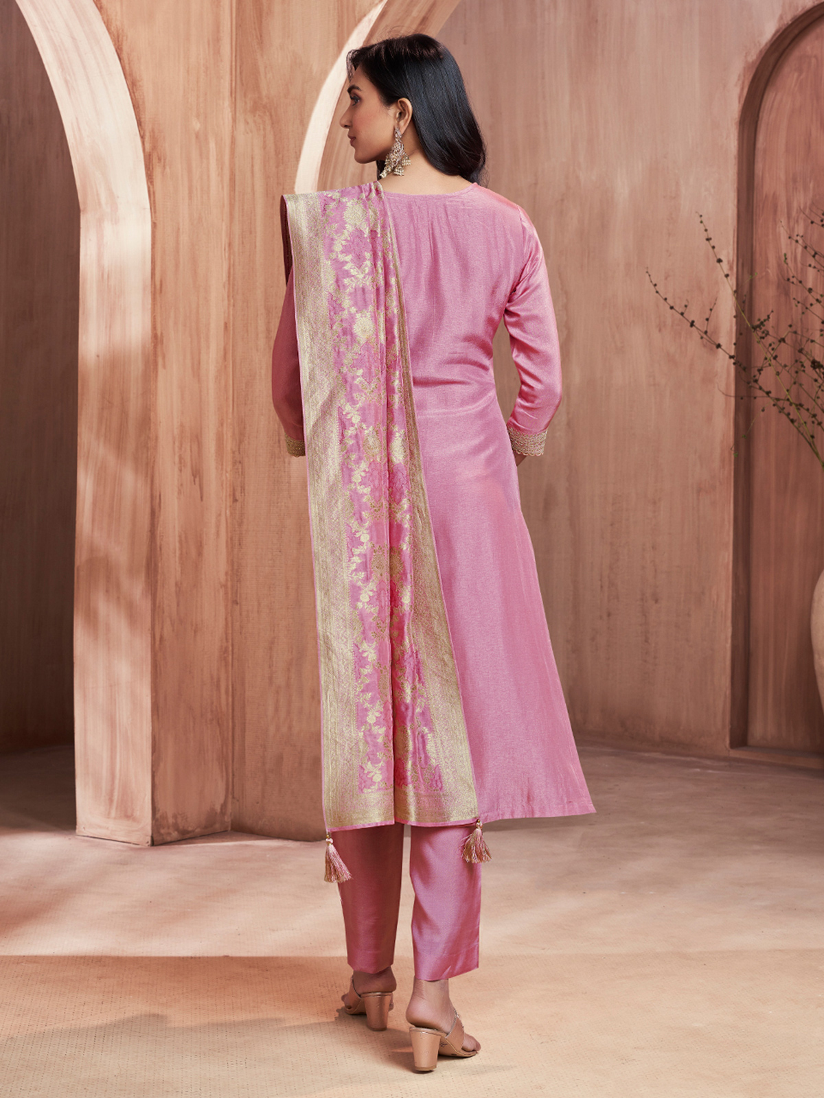 Elegant Light Pink Silk Festive Kurti Pant Set With Dupatta
