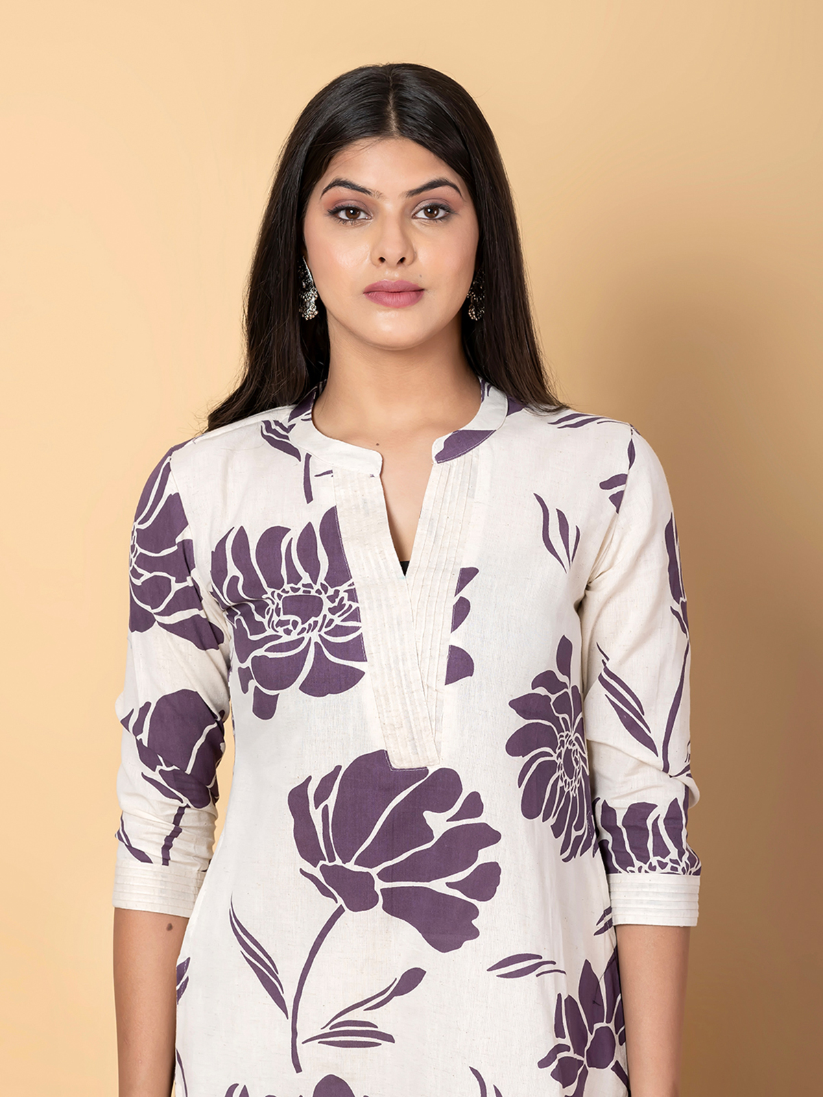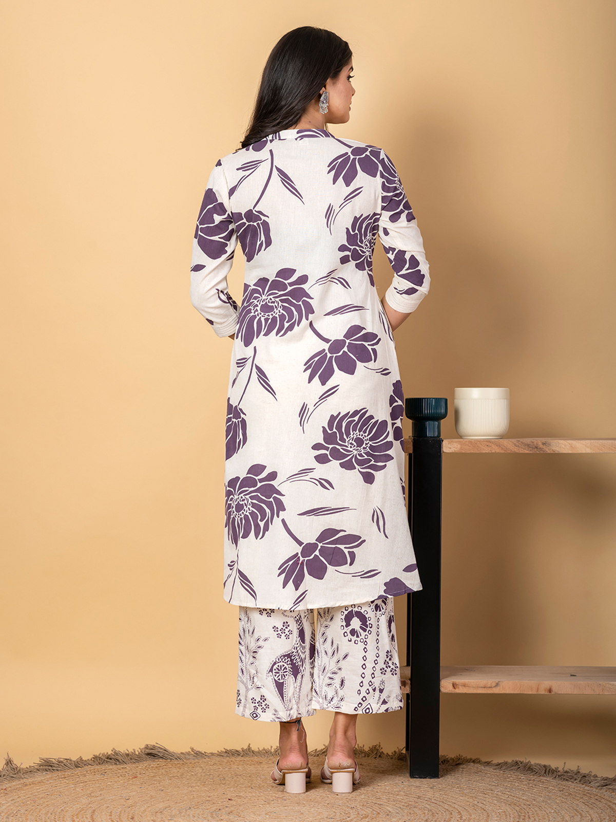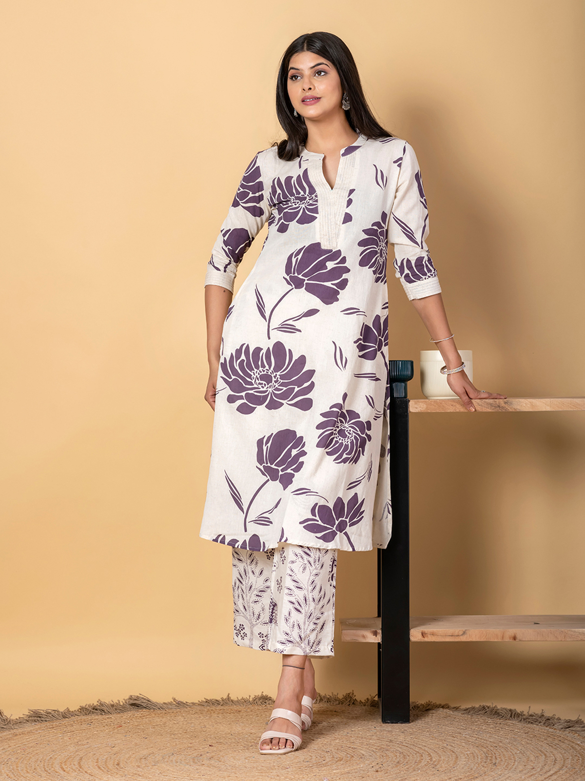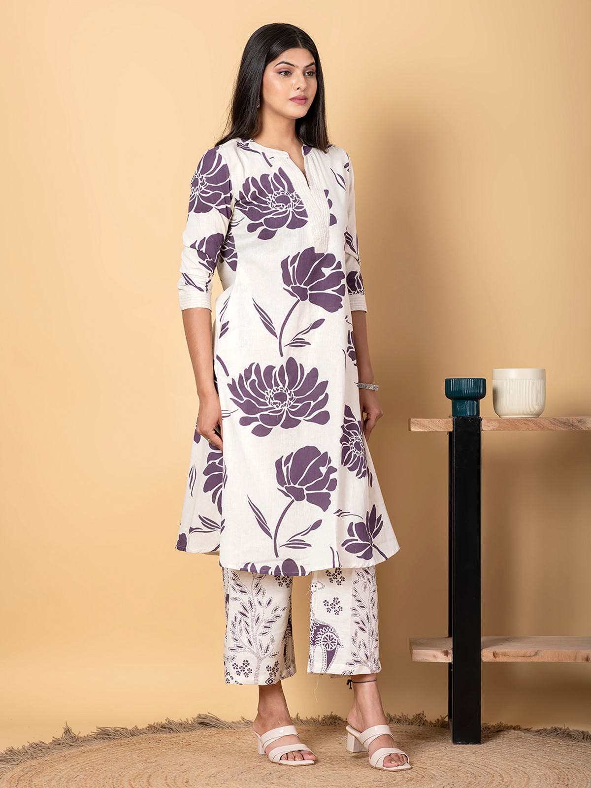 In soft off white and purple tones, this printed cotton silk kurti set features a stand collar and quarter sleeves. The matching palazzo adds to its refined, festive style.