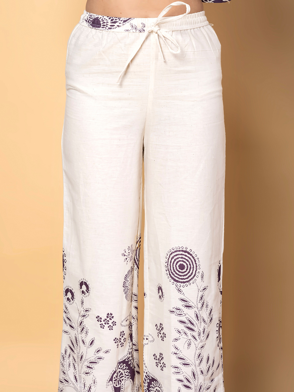 Elegant Off White And Purple Cotton Silk Kurti Palazzo Set