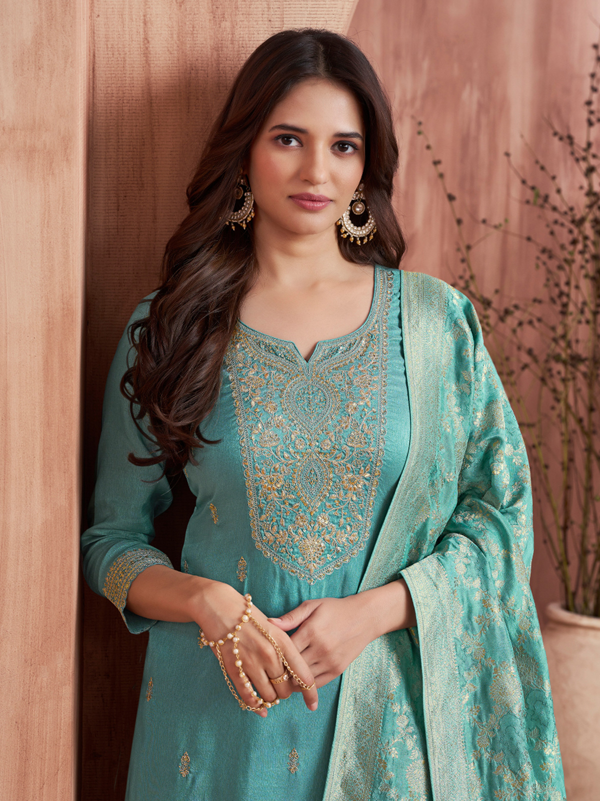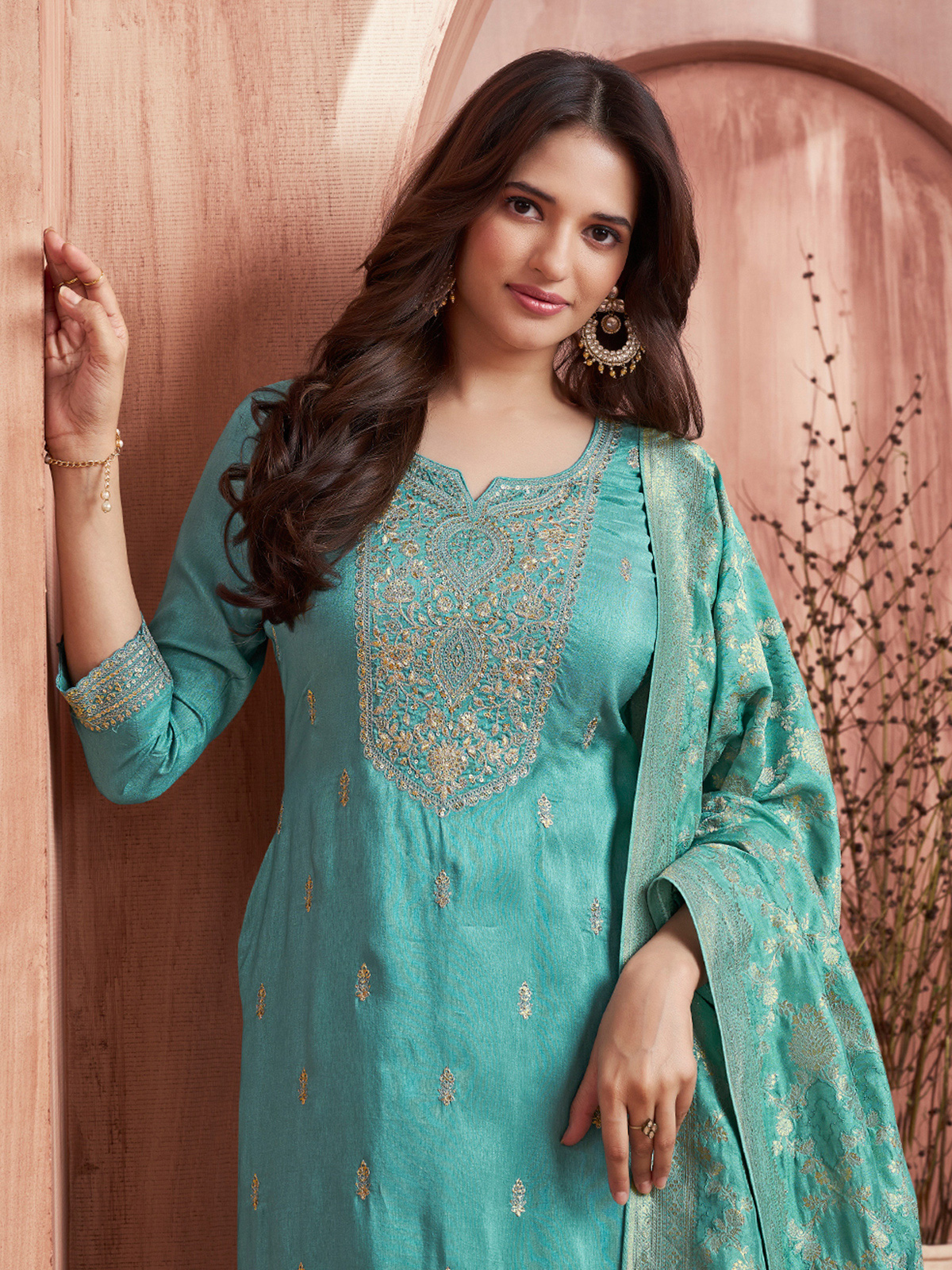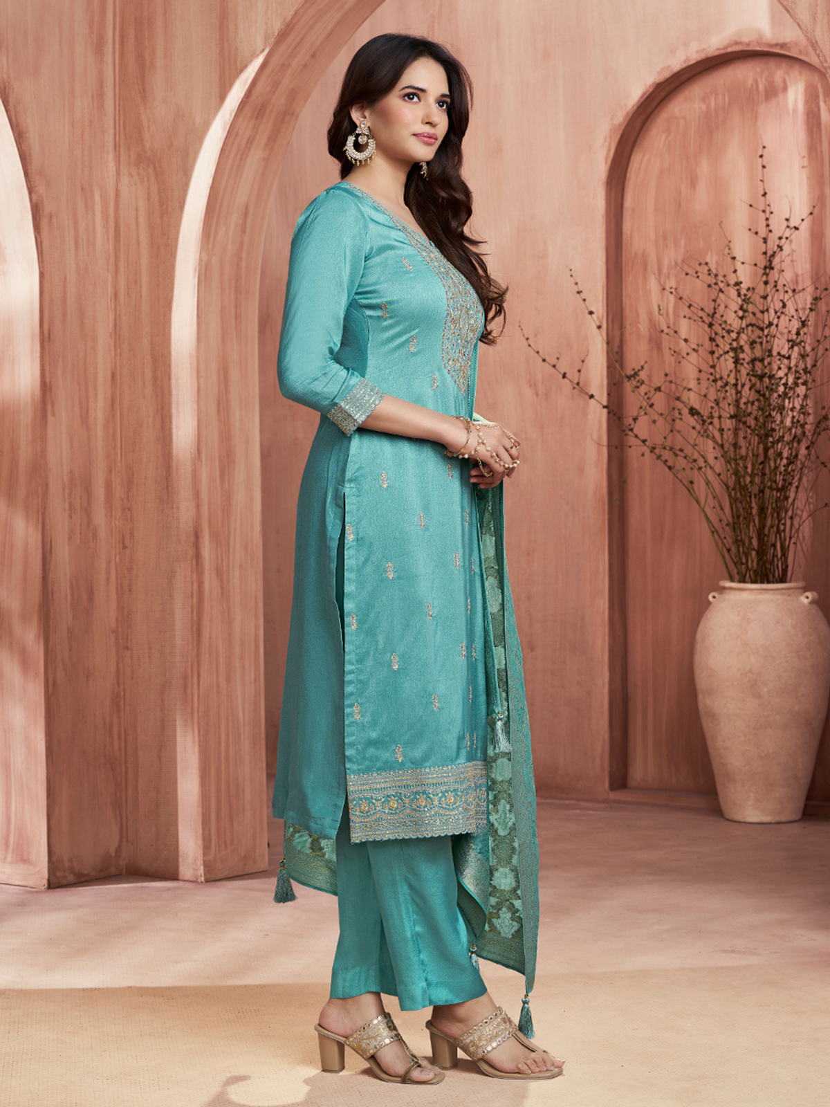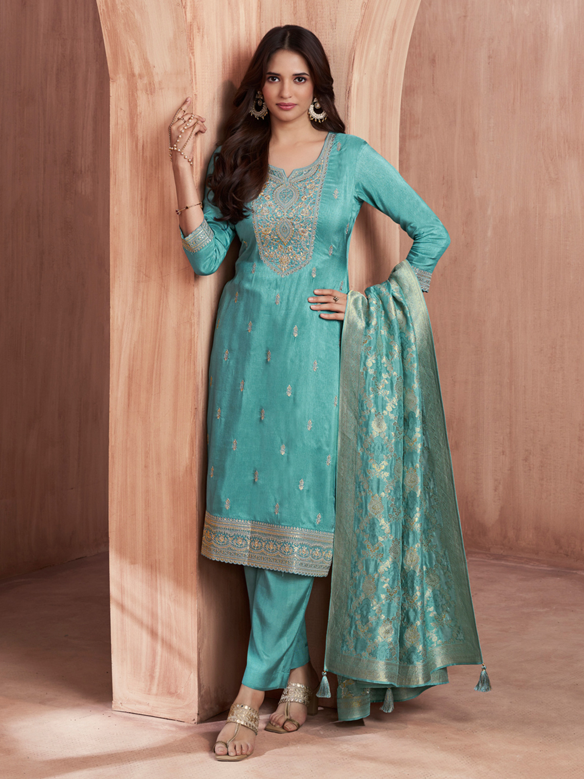 Fresh and graceful, this aqua blue silk kurti set reflects effortless festive charm. Designed with a classic neckline and quarter sleeves, it is enhanced with elegant zari, resham, and sequin work. Paired with a stylish pant and dupatta, it’s perfect for festive and Eid celebrations.