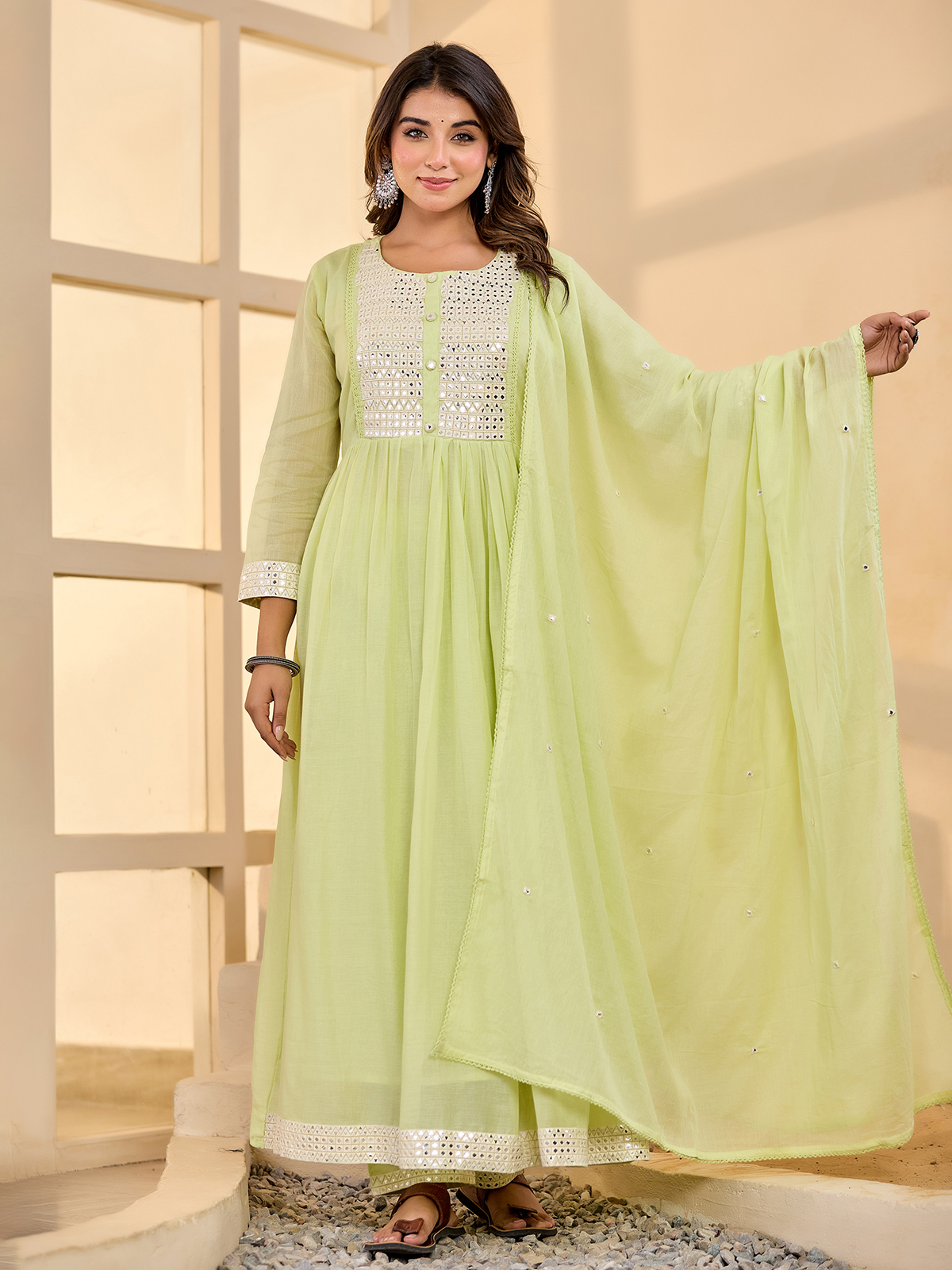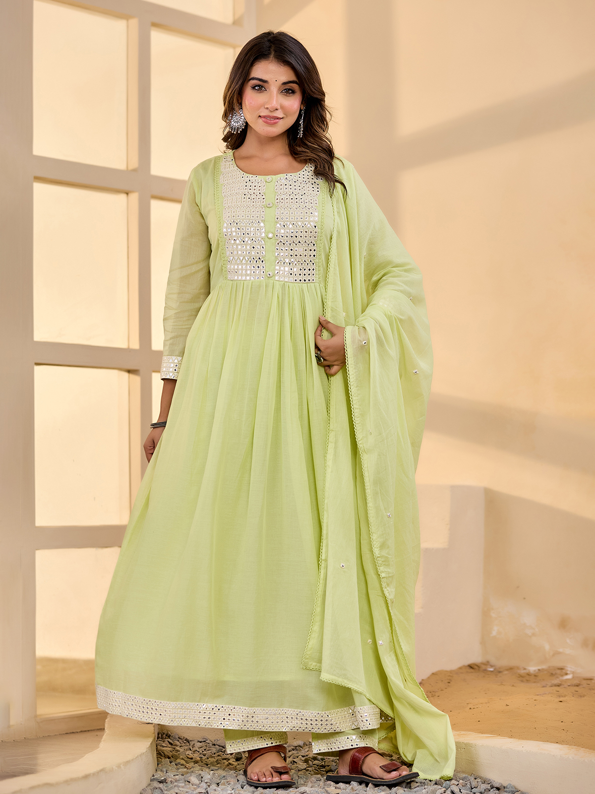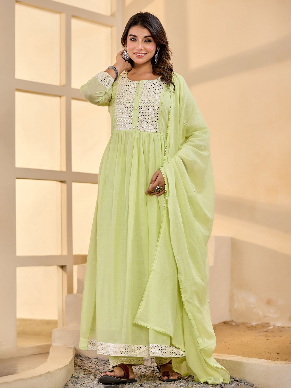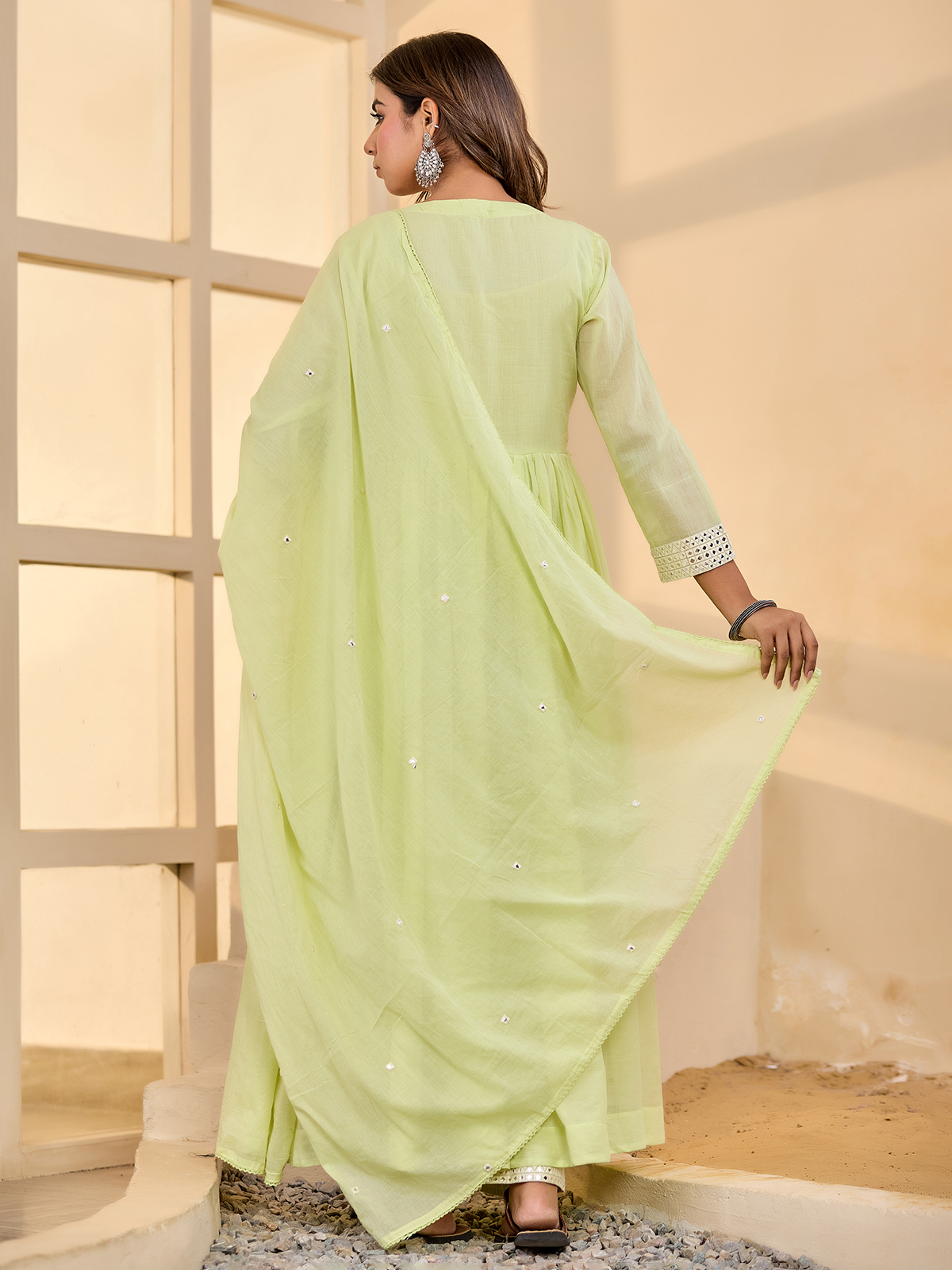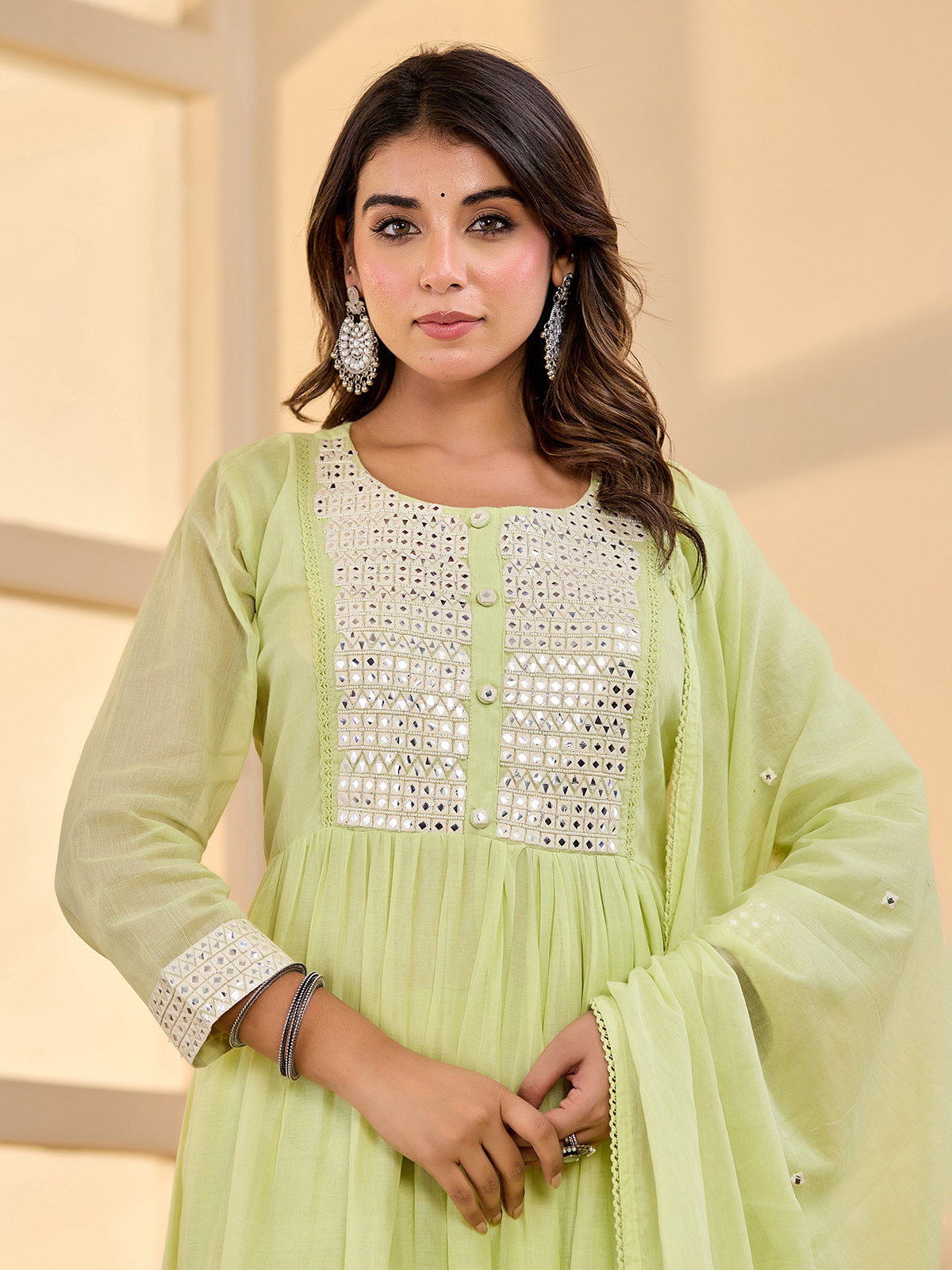Celebrate in style with this mint green cotton silk kurti set. Accented with aabla detailing on the yoke, round neckline, and quarter sleeves, it’s completed by a coordinating dupatta and pants for a look of refined grace.