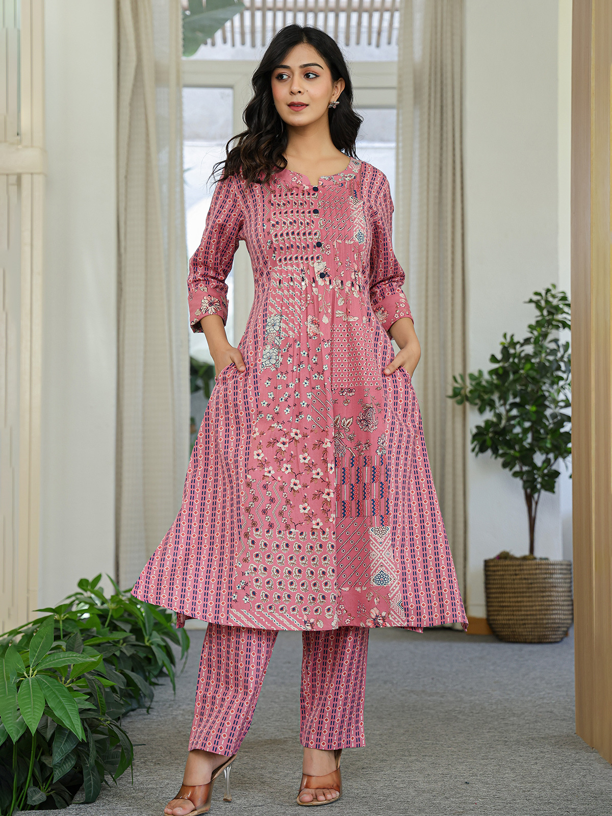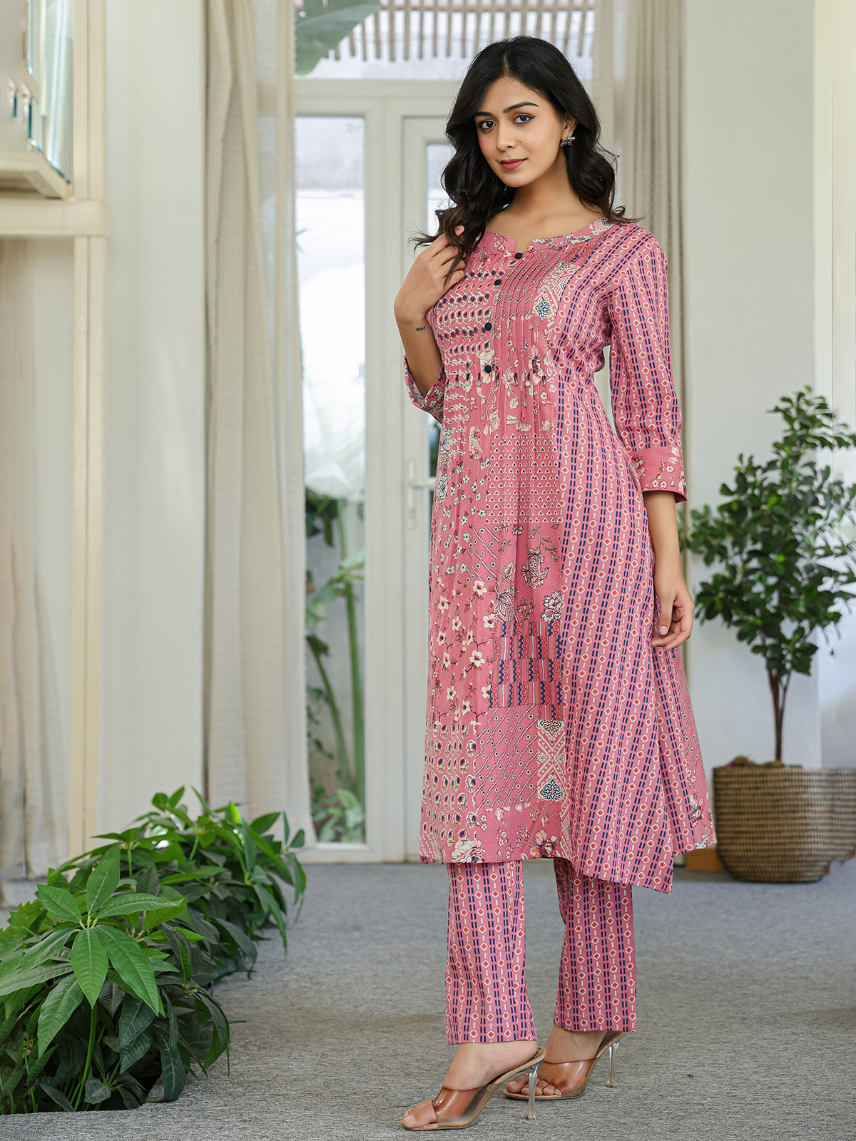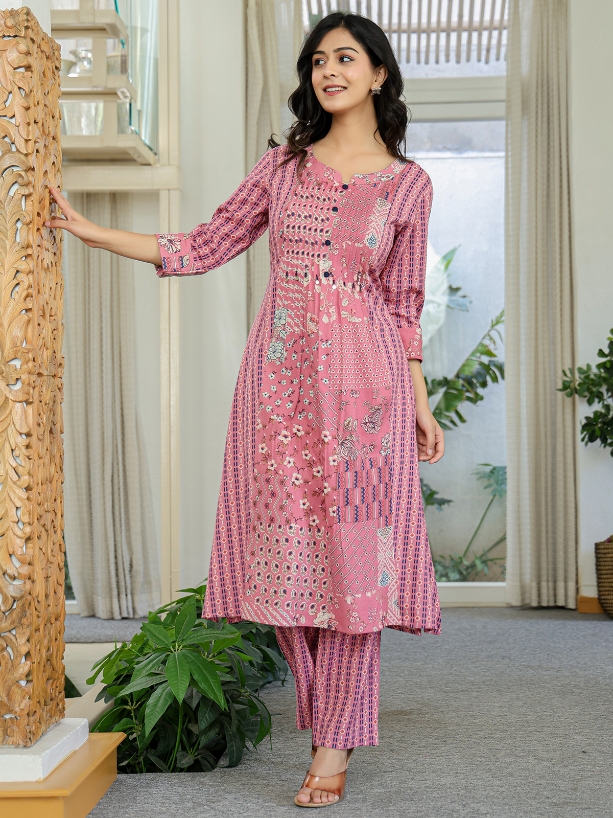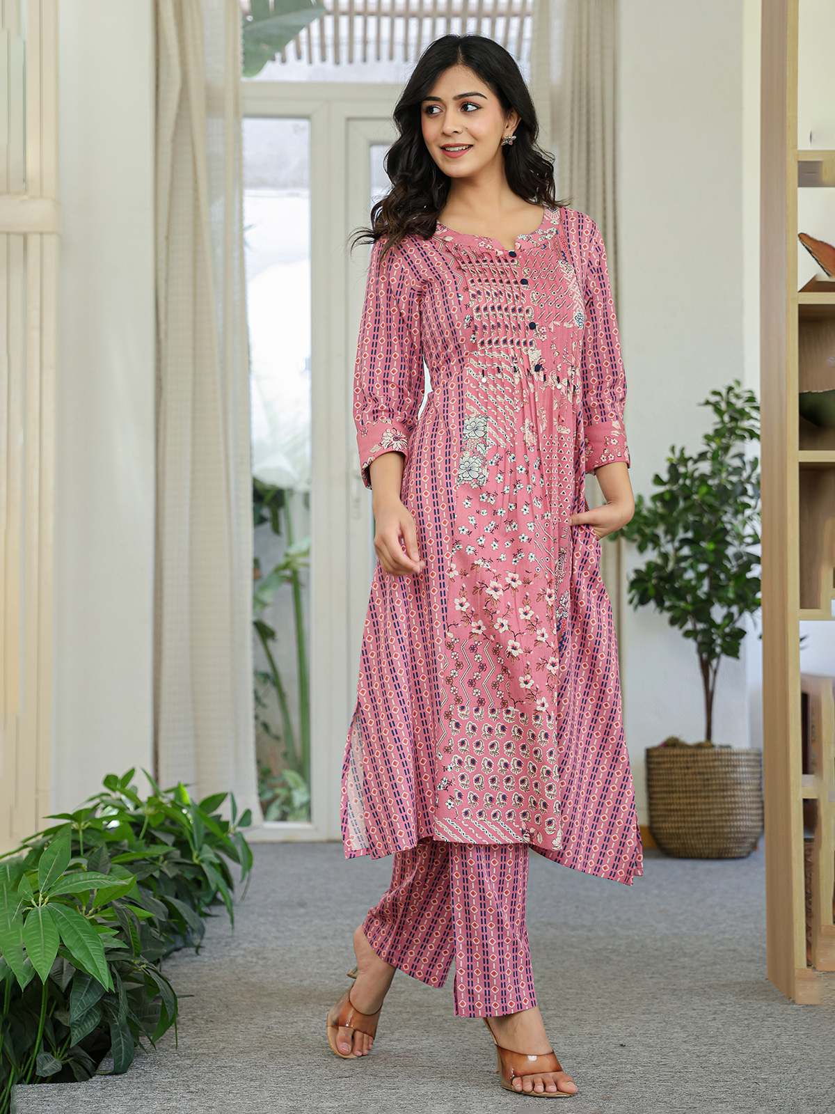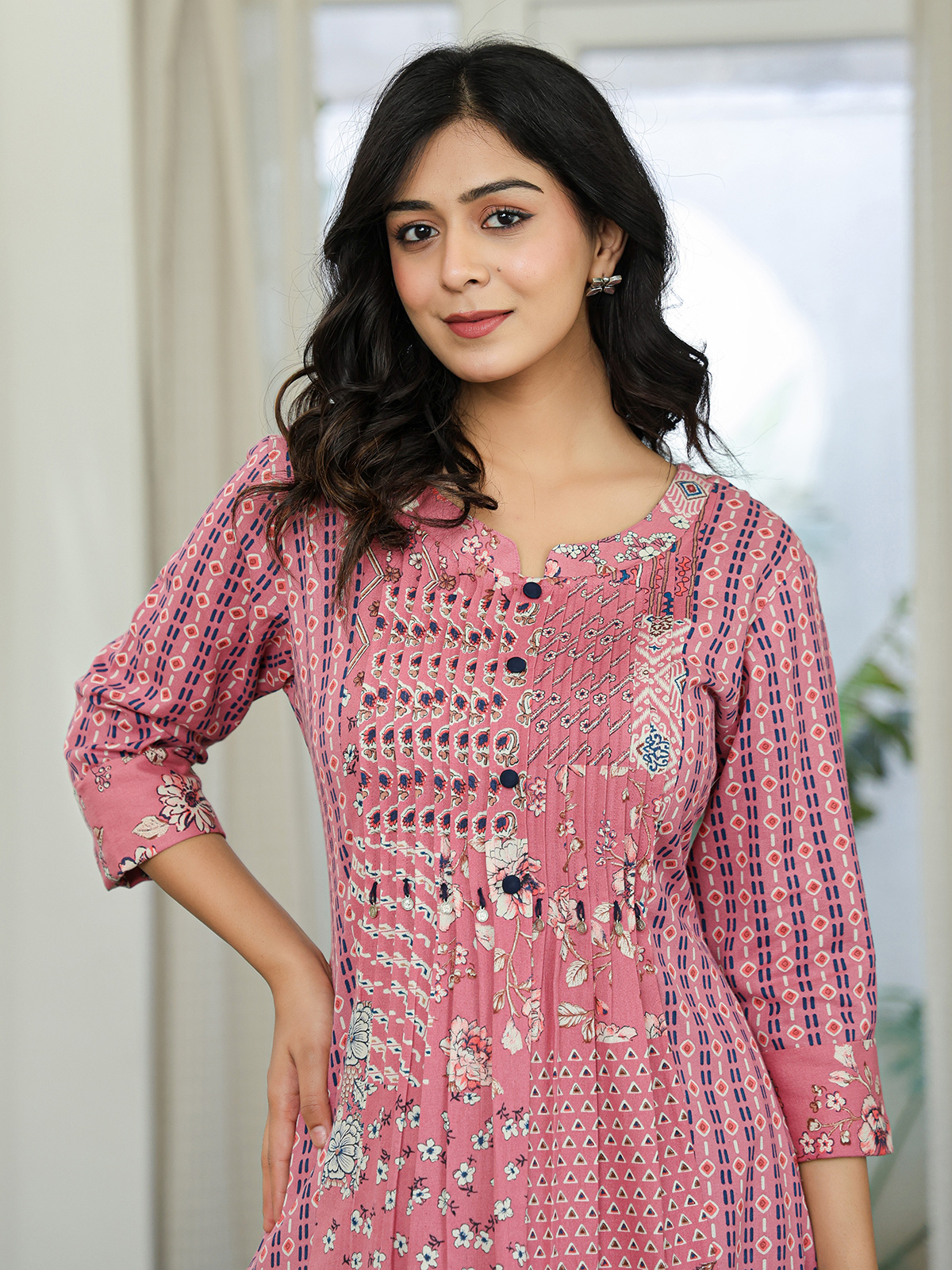 Feminine and graceful, this onion pink silk kurti set features a printed base with quarter sleeves and pant. Its festive appeal lies in the balance of tradition and style, making it a refined pick for gatherings and joyful occasions.