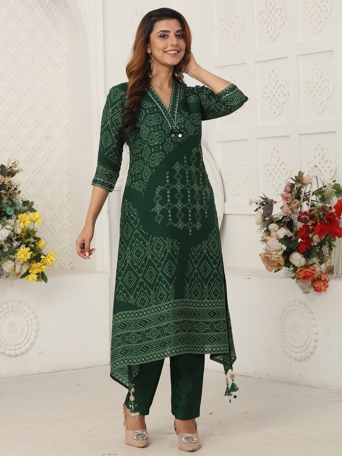 Brighten your celebrations with this green russian silk kurti set, showcasing lively prints on soft fabric. The V neck and three quarter sleeves offer a flattering fit, paired with matching bottoms.
