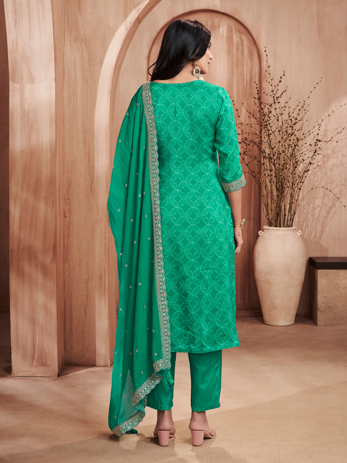 Designed in rich green silk printed straight cut kurti set. Features elegant embroidery and sequin detailing for refined festive appeal. Styled with a sweetheart neckline and quarter sleeves, it is paired with a pant and dupatta, making it suitable for weddings and special celebrations.
