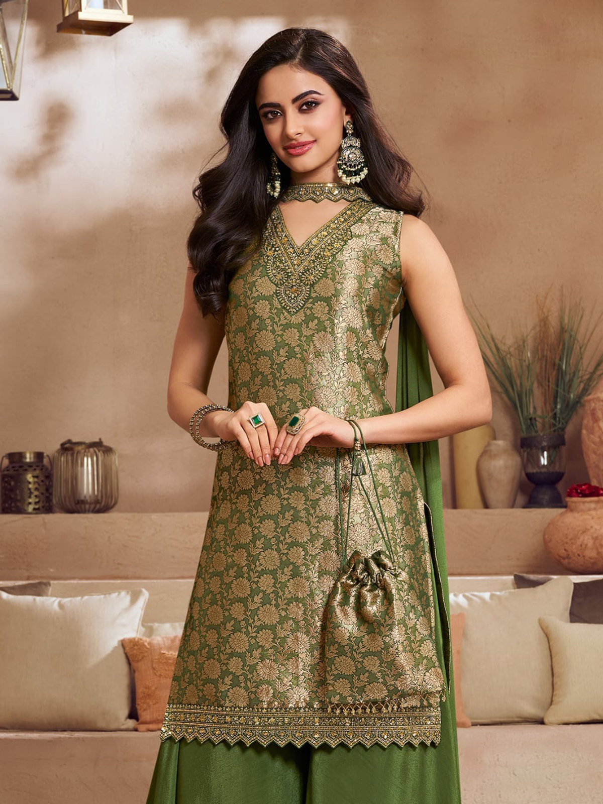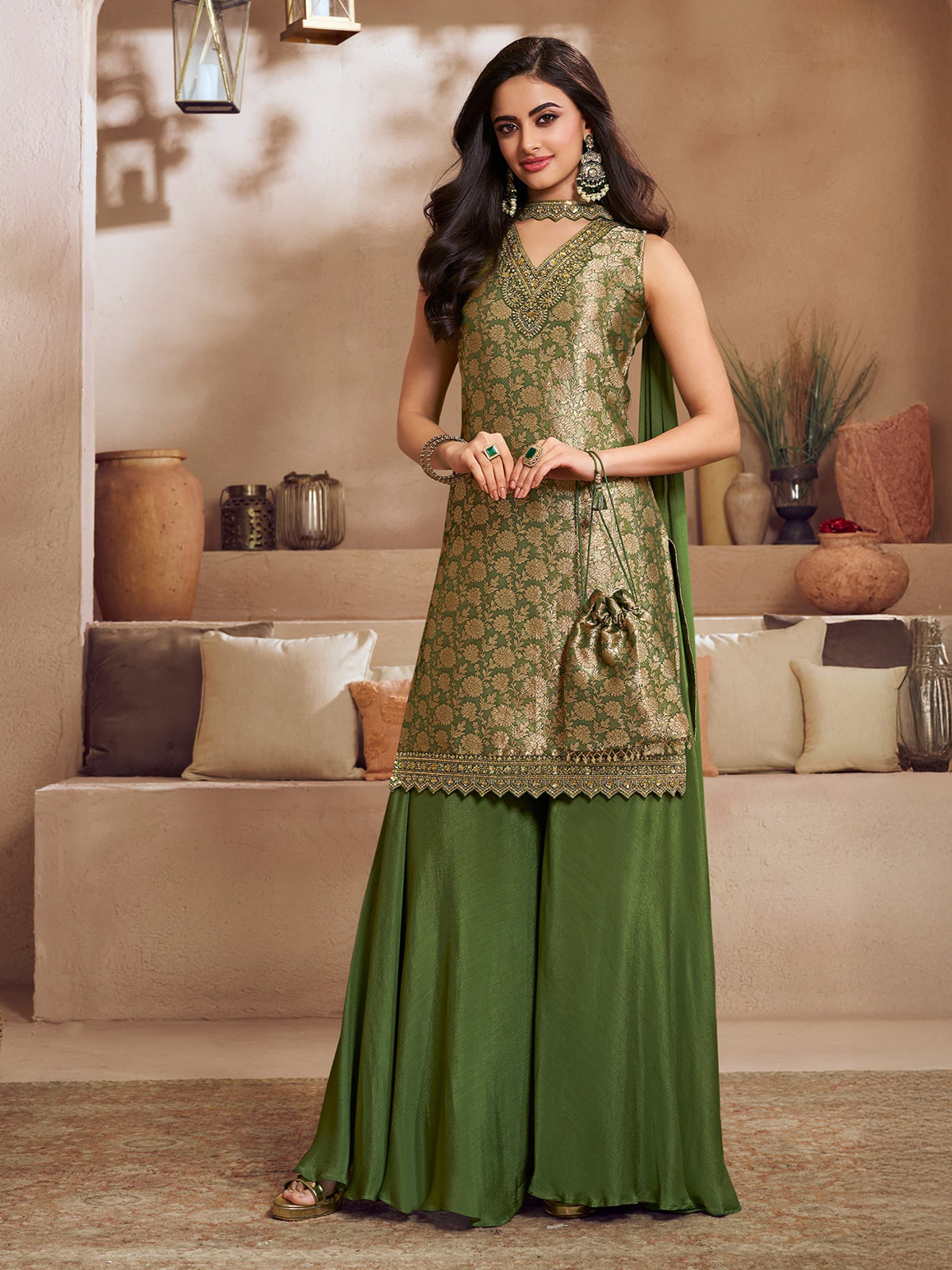 Crafted in lustrous green silk, this palazzo kurti set glows with cutdana, beads, sequins, and zari embellishments. The sleeveless V-neck design adds contemporary charm, while the palazzo and dupatta ensure elegance. An ideal mehendi, festive, or wedding choice where tradition meets a modern edge.