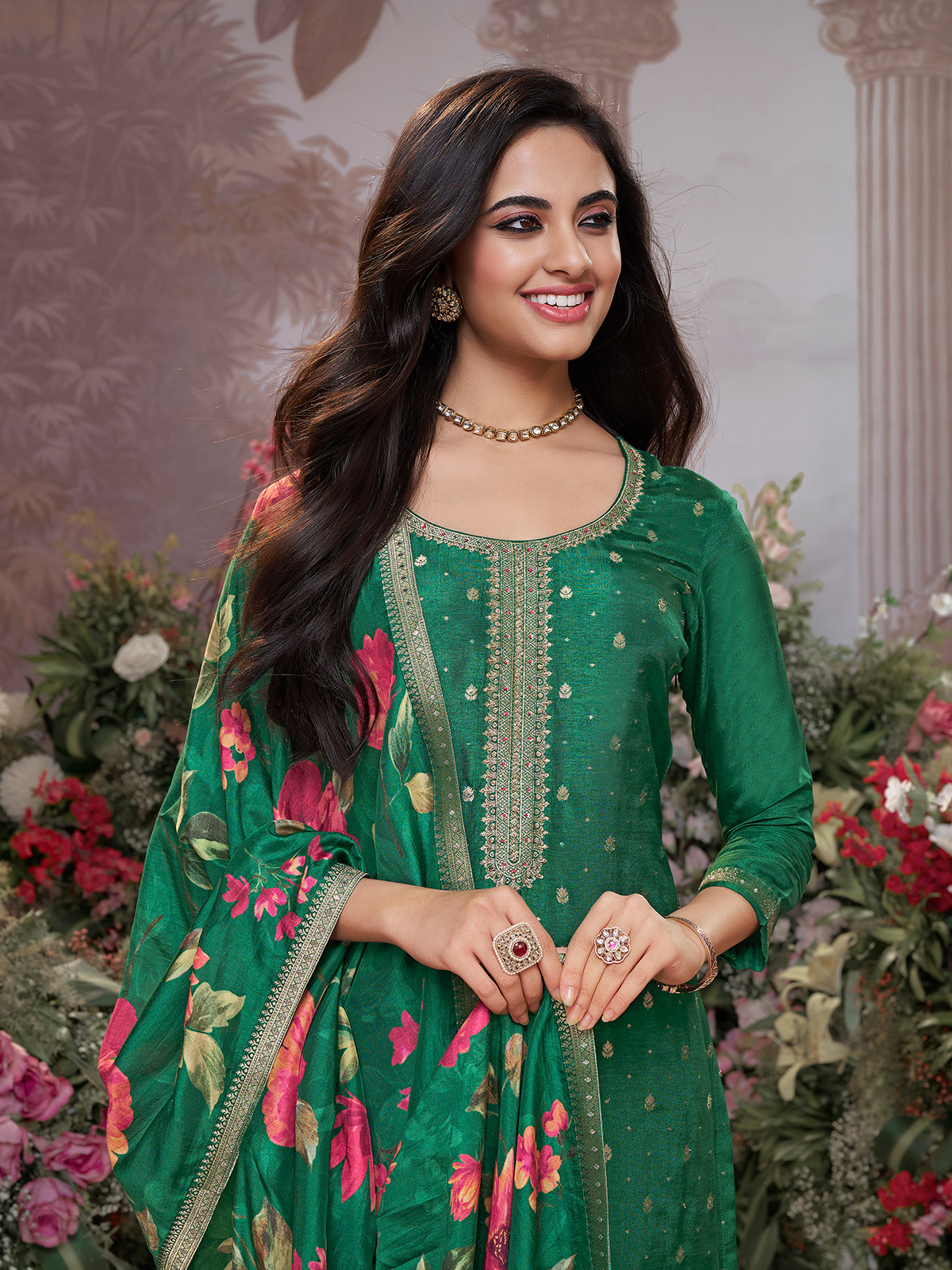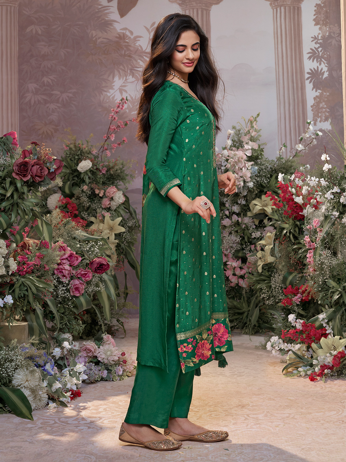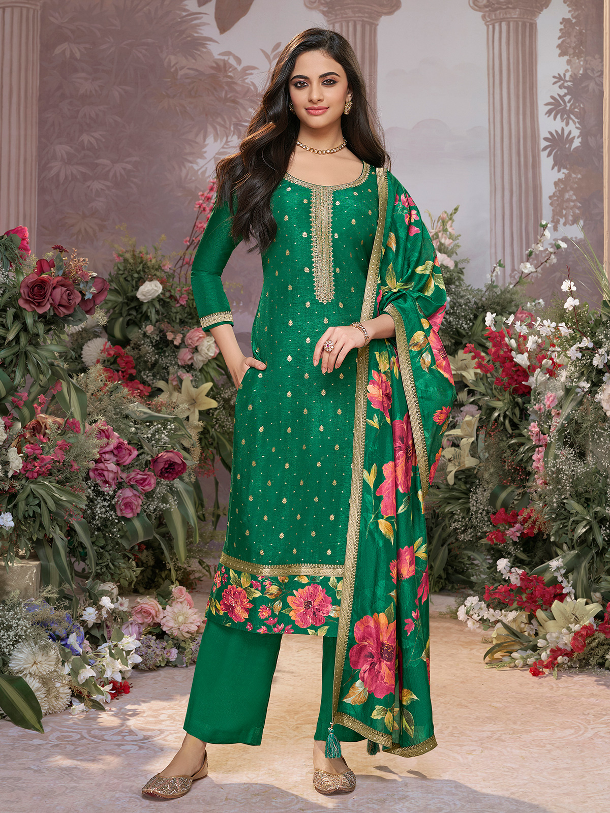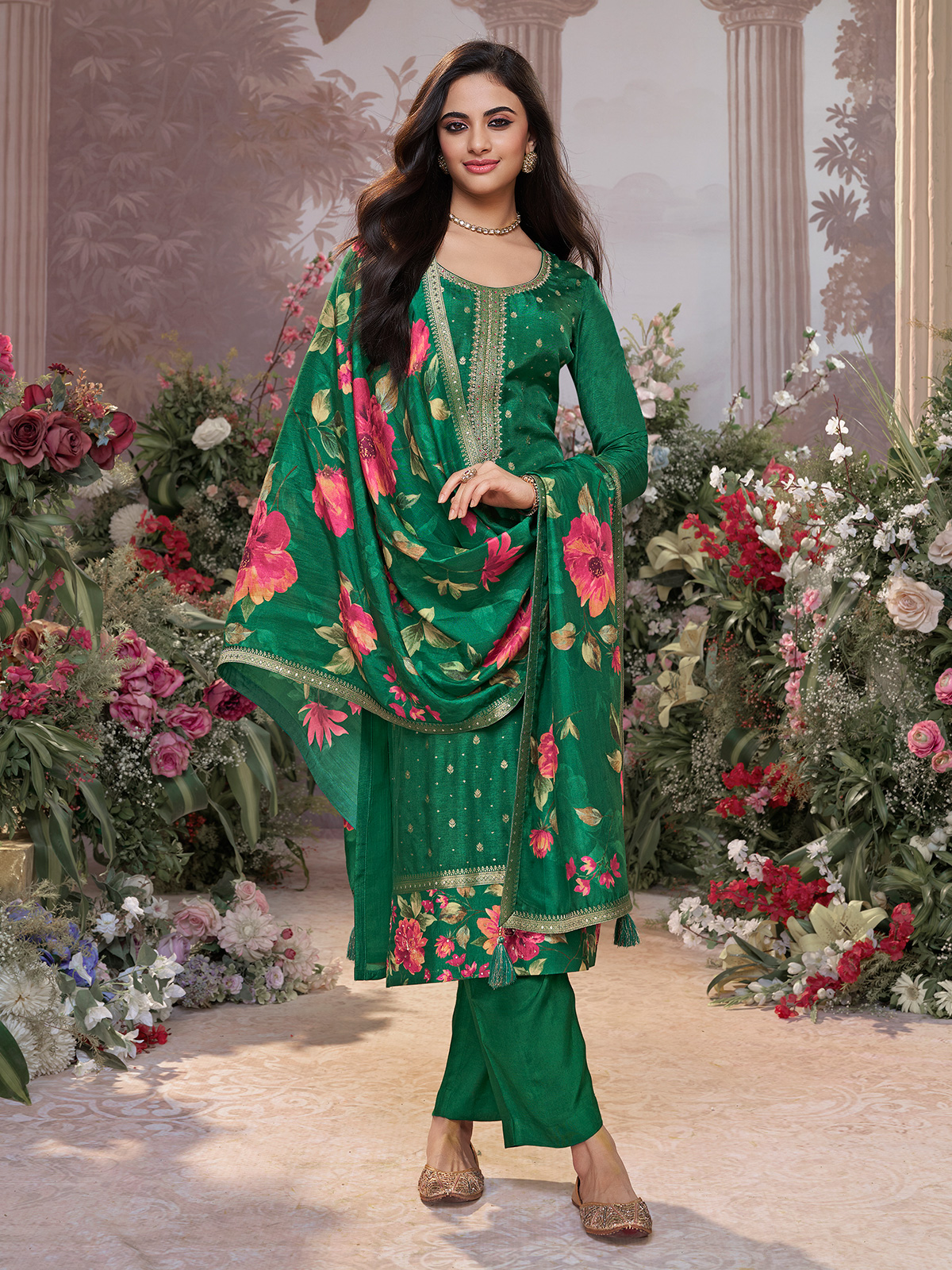 Designed in lustrous silk, this green salwar suit brings a serene, captivating charm to festive dressing. Sequins, zari and cutdana adorn the round neckline and quarter sleeves with subtle, shimmering artistry. A tailored pant and matching dupatta complete the look with polished ease, creating a refined ensemble that moves gracefully through celebrations.