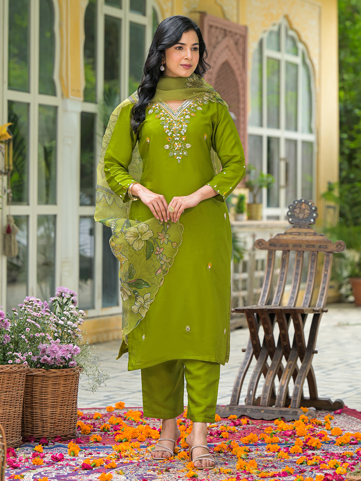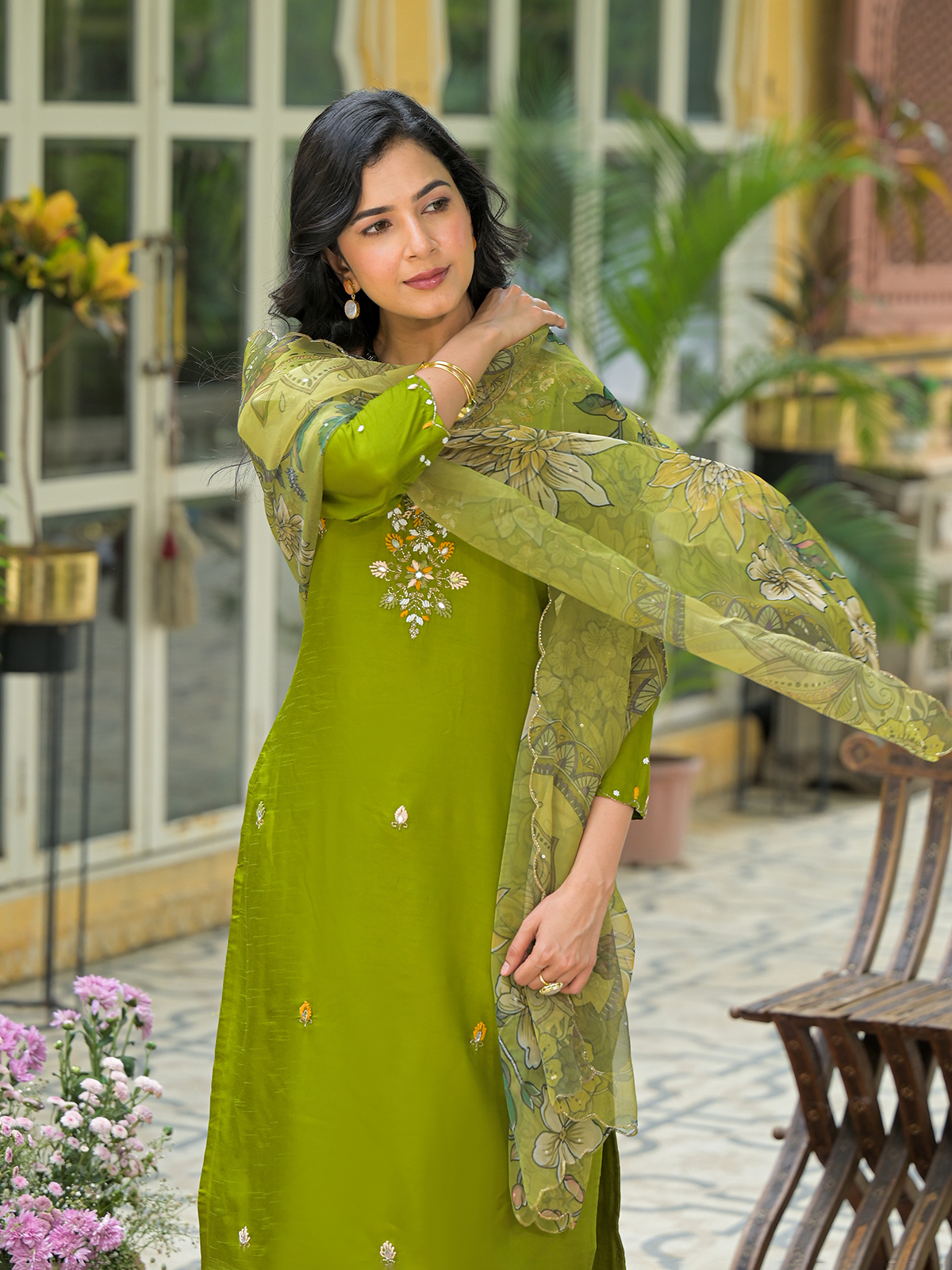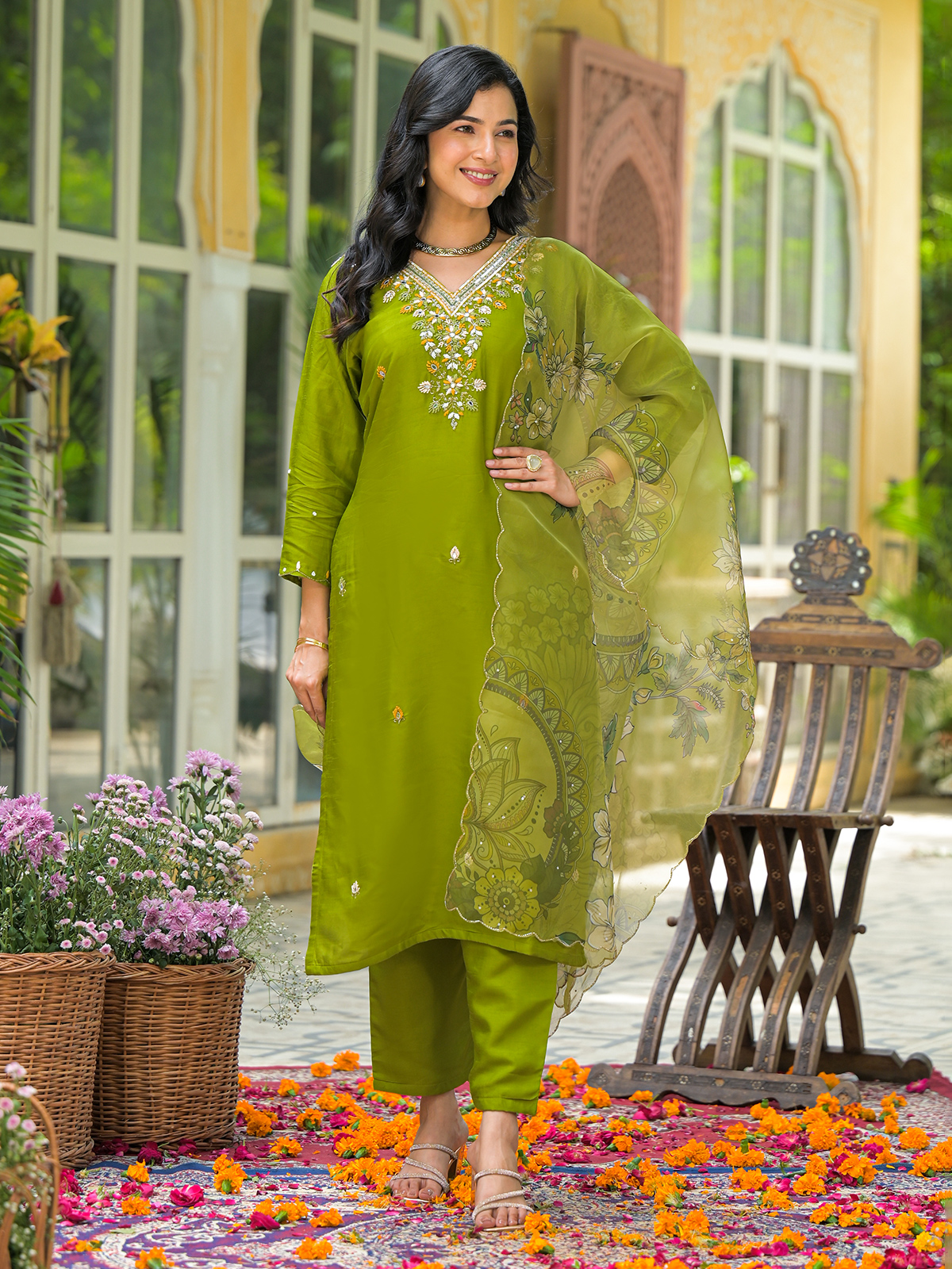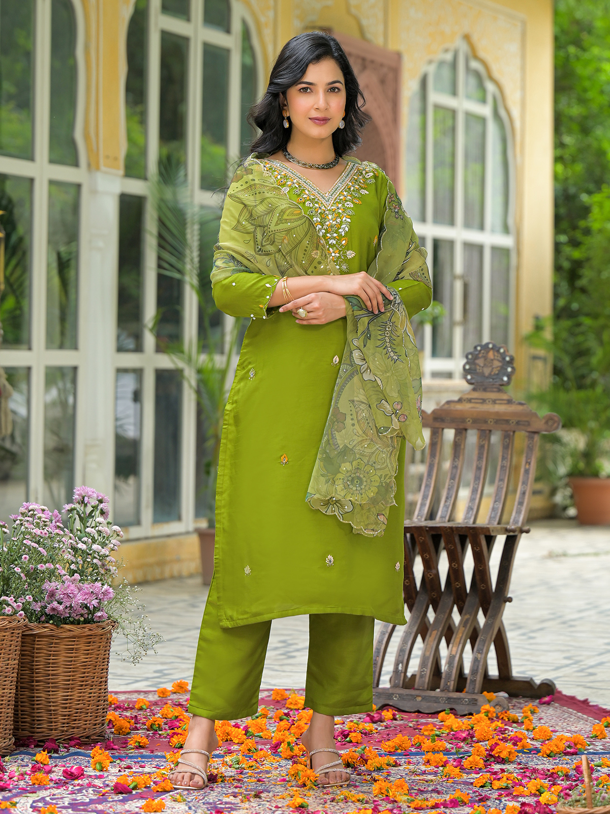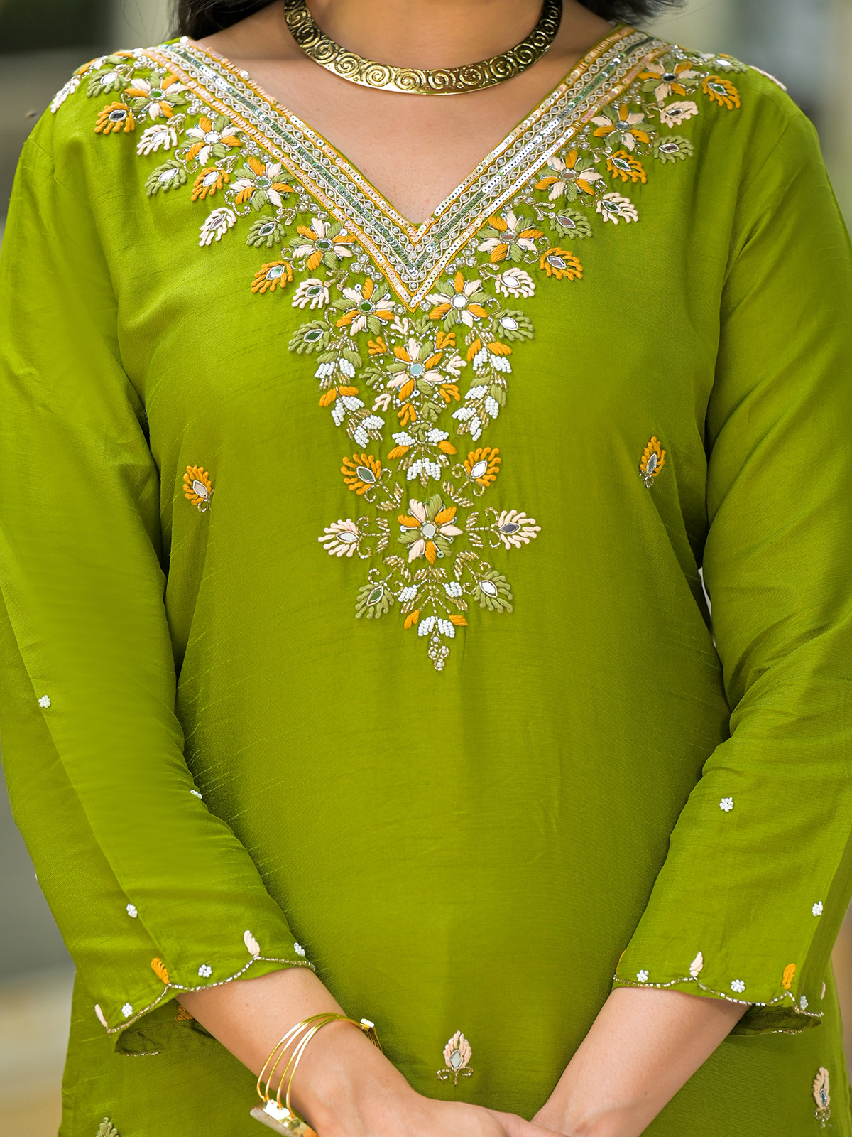 This green silk kurti set brings richness to your festive wardrobe. Designed in a straight-cut style, it is decorated with thread, mirror, sequins, beads, and cutdana work. Paired with pant and dupatta, its V neckline and quarter sleeves create an effortlessly refined appearance.