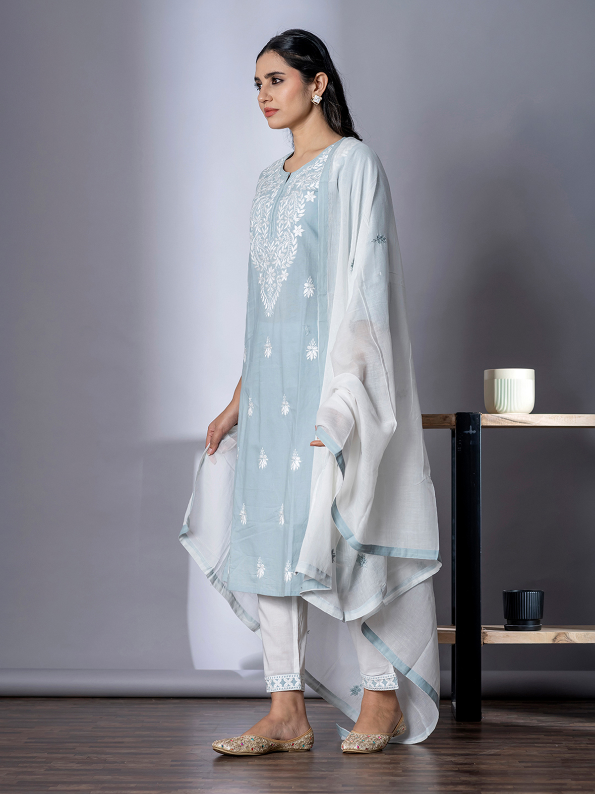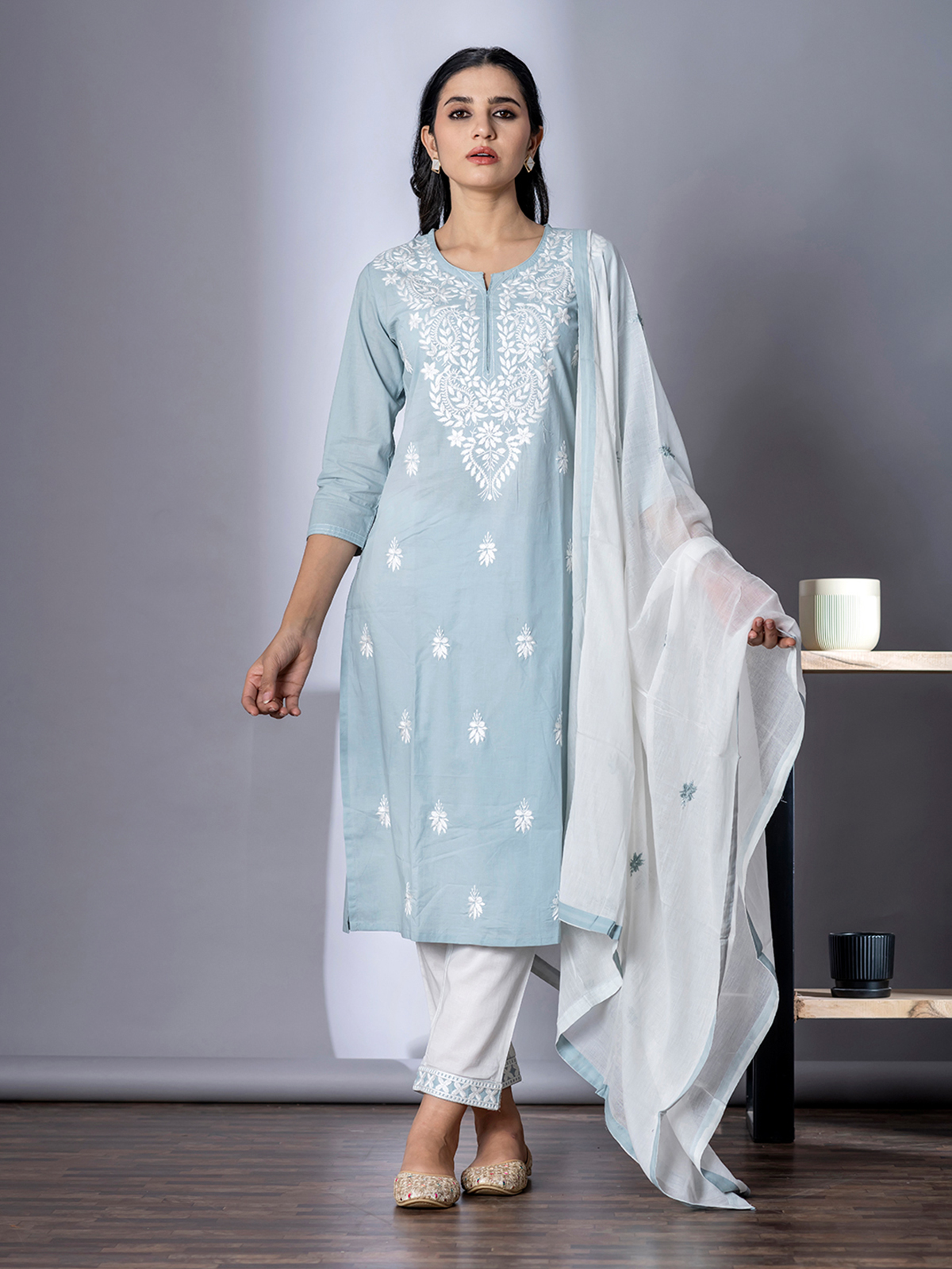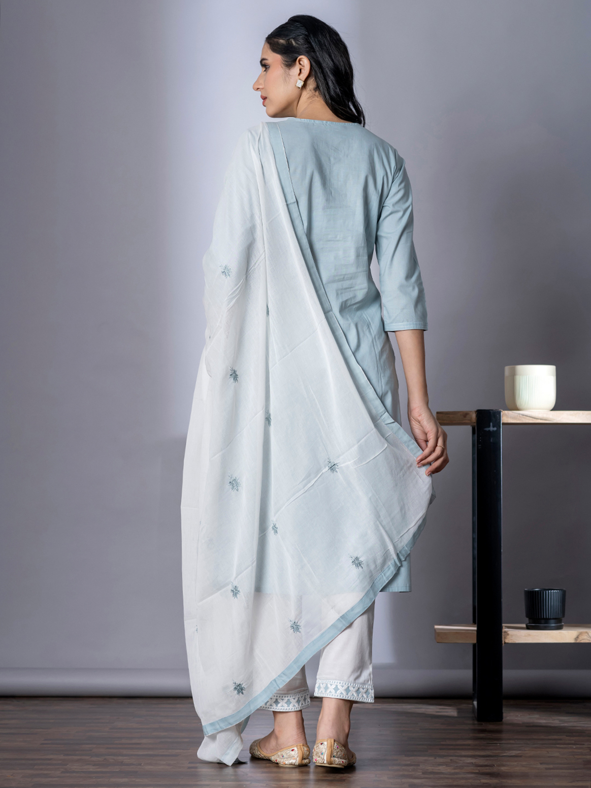 Serene mint blue cotton kurti set in a straight cut with embroidery, quarter sleeves, and pant. An understated yet elegant festive choice.