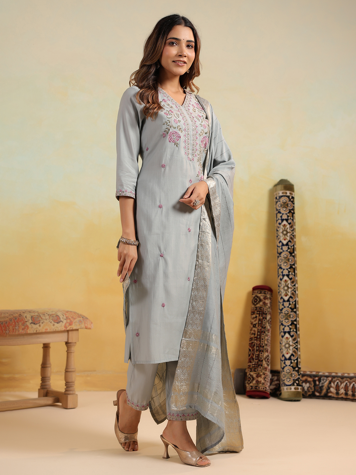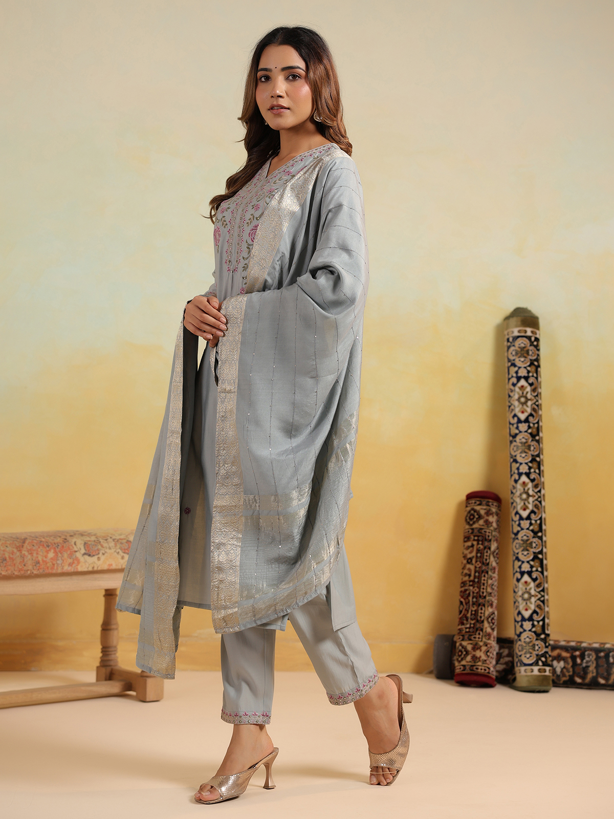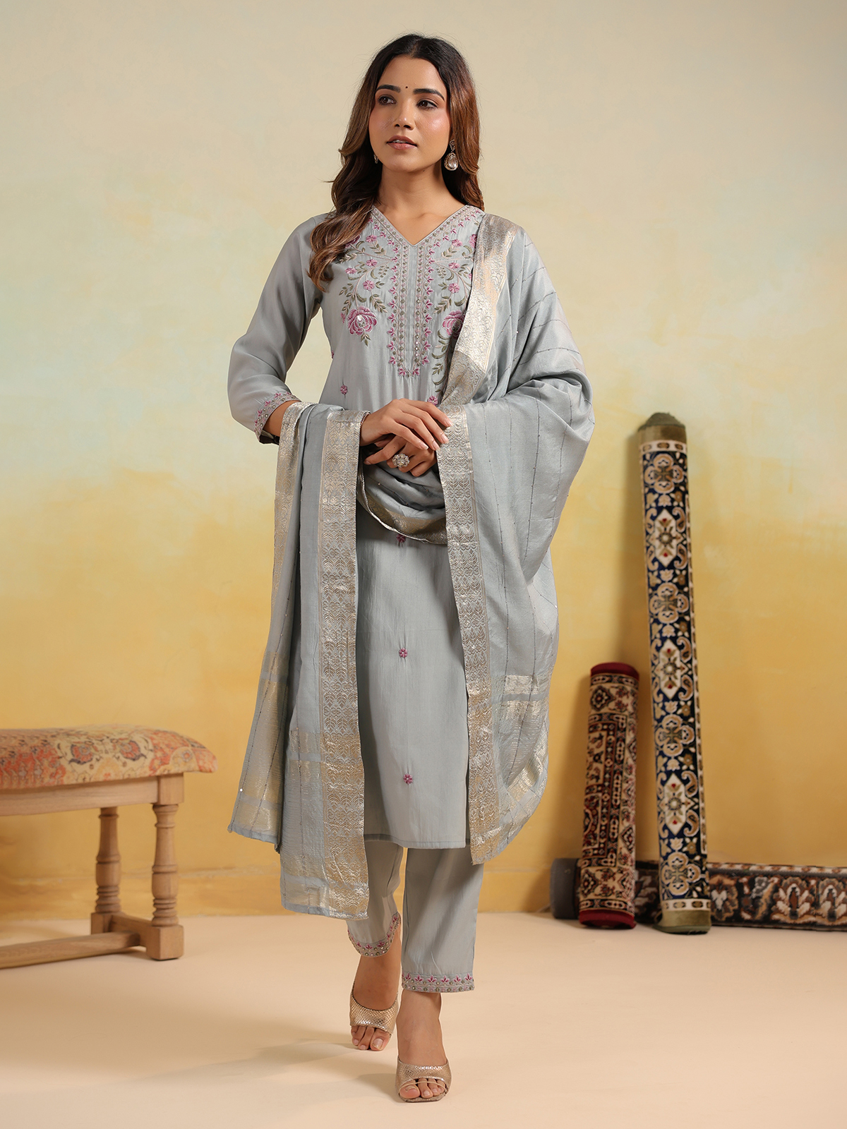 Designed to bring out poised elegance and modern femininity, this sophisticated grey silk kurti set exudes festive grace. It features a flattering V neckline with quarter sleeves, enhanced by tasteful embroidery and sequin detailing throughout. Suitable for festive occasions, the ensemble is paired with a stylish pant and a coordinated dupatta for effortless charm.