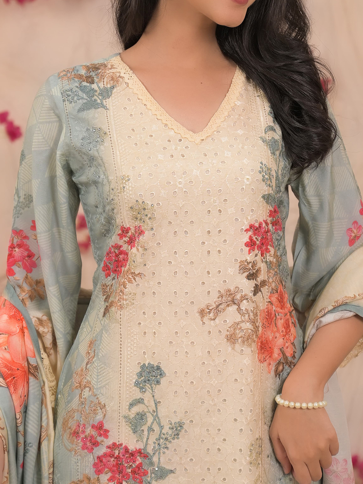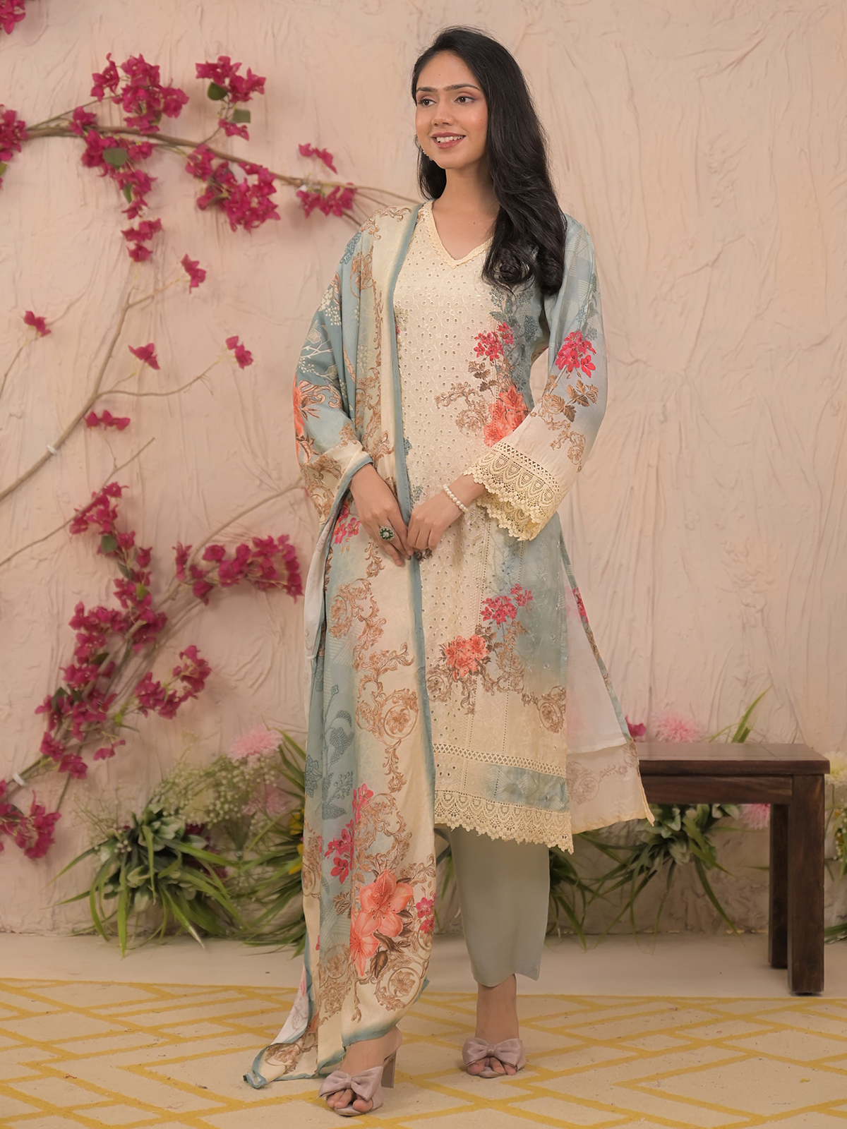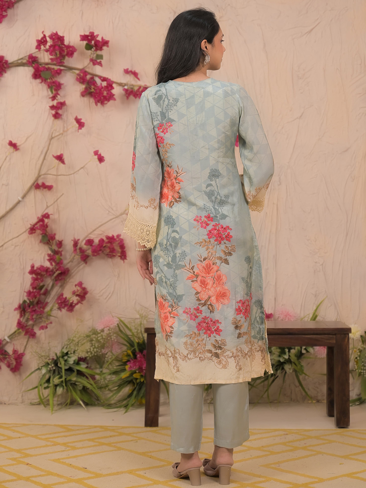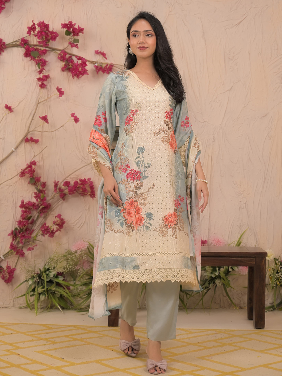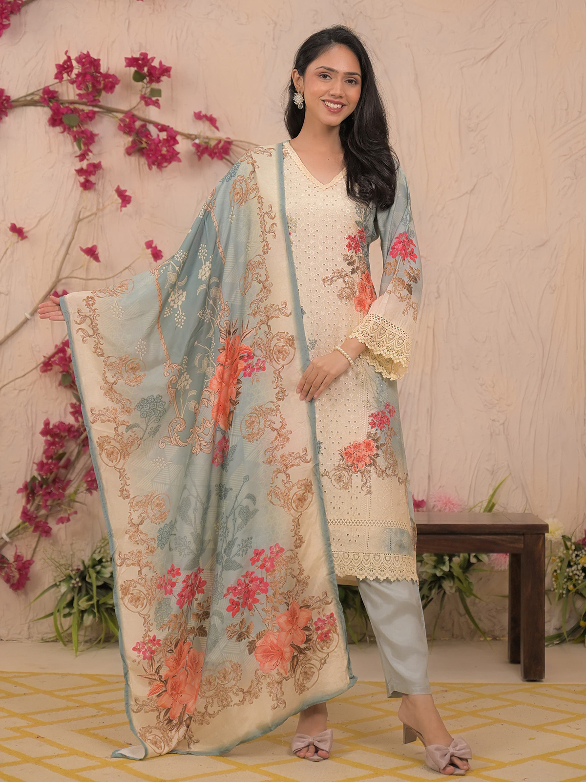In soft grey and white tones, this shaded cotton silk kurti set features subtle cutwork and delicate stone embellishments. Styled with a V neck and quarter sleeves, it comes with printed dupatta and pant for a refreshing festive daytime look.