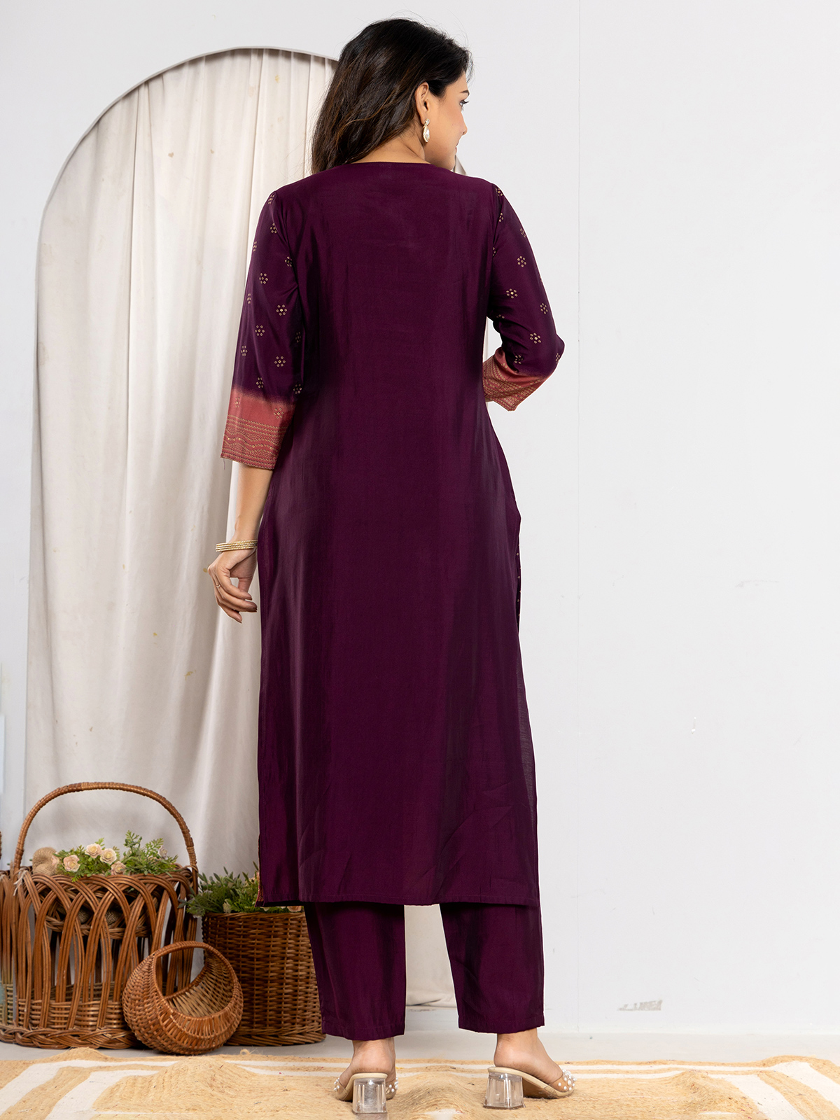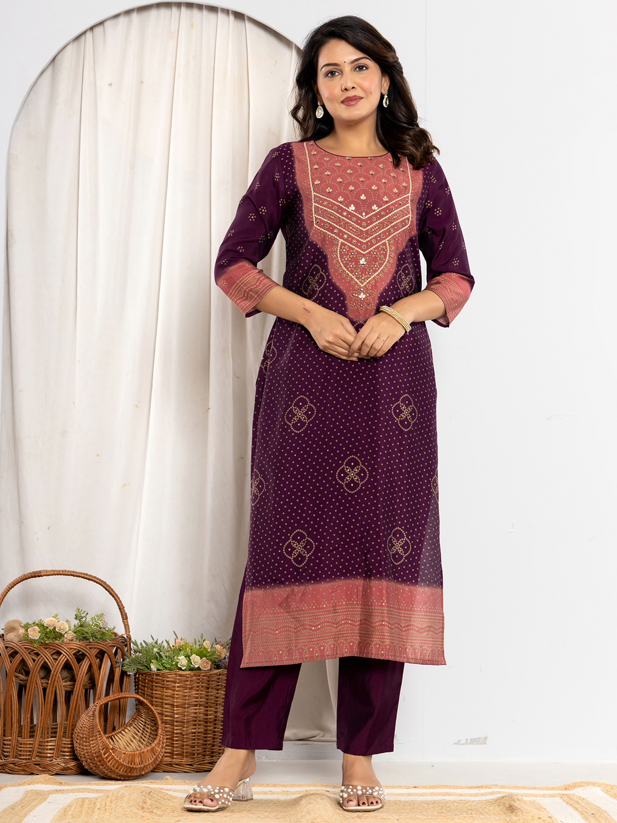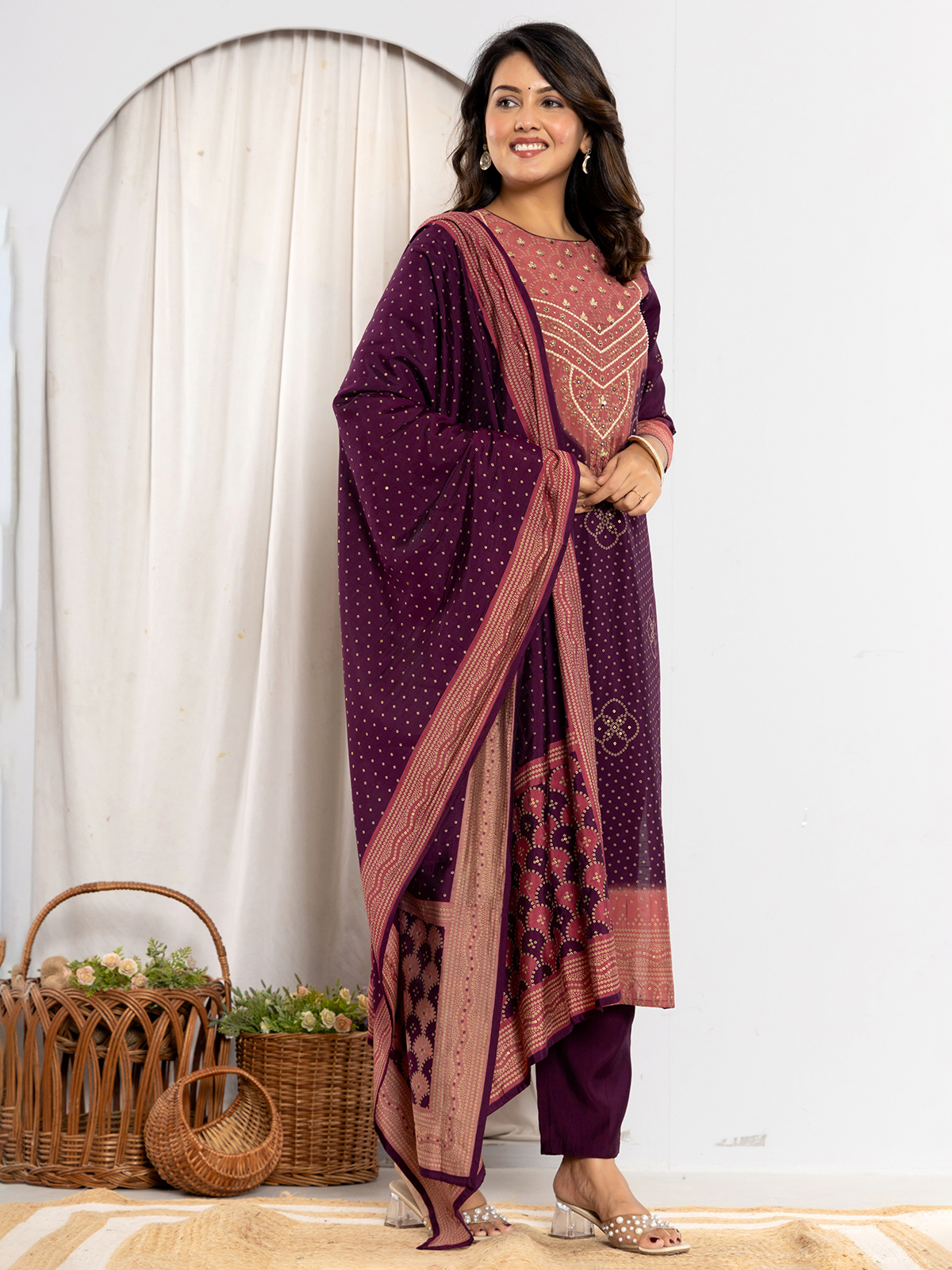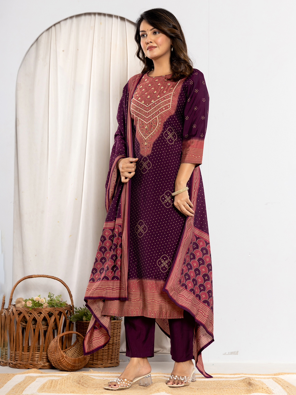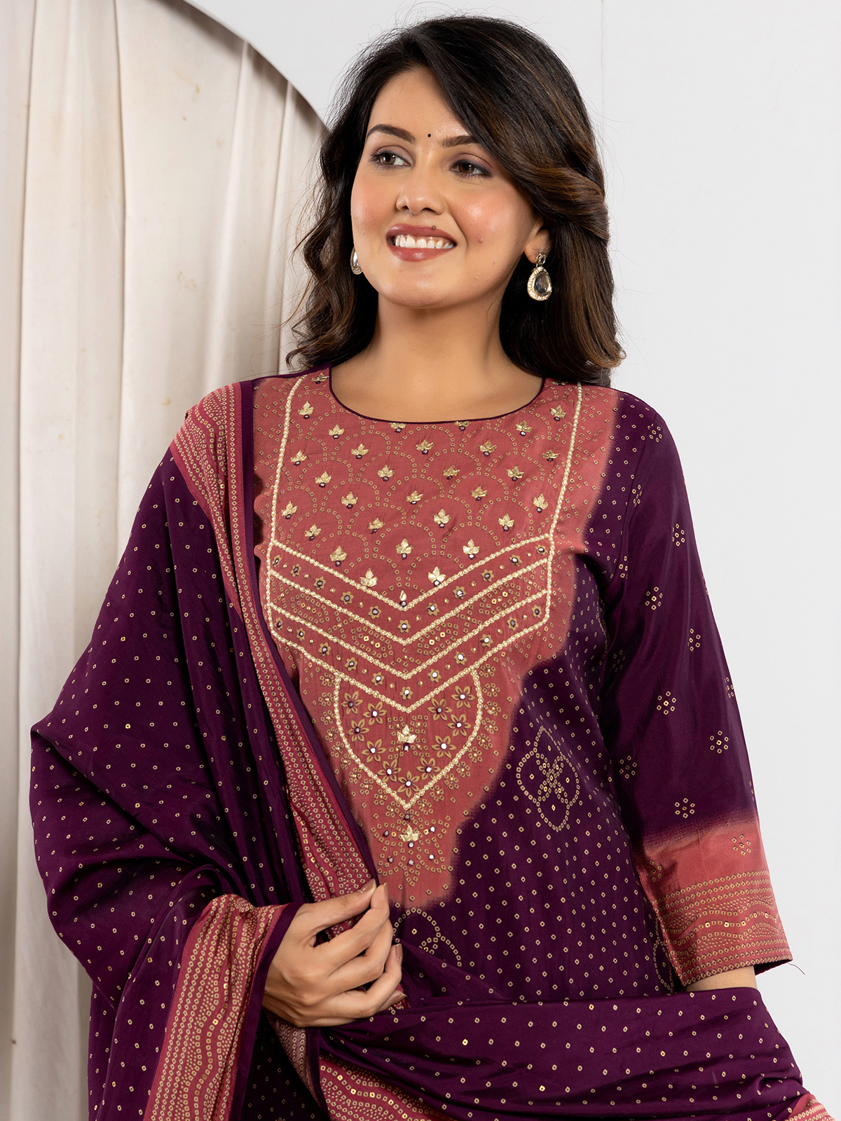For casual outing this wine printed kurti set. Crafted in silk fabric. It has a round neck and quarter sleeves, comes with a bottom and dupatta.