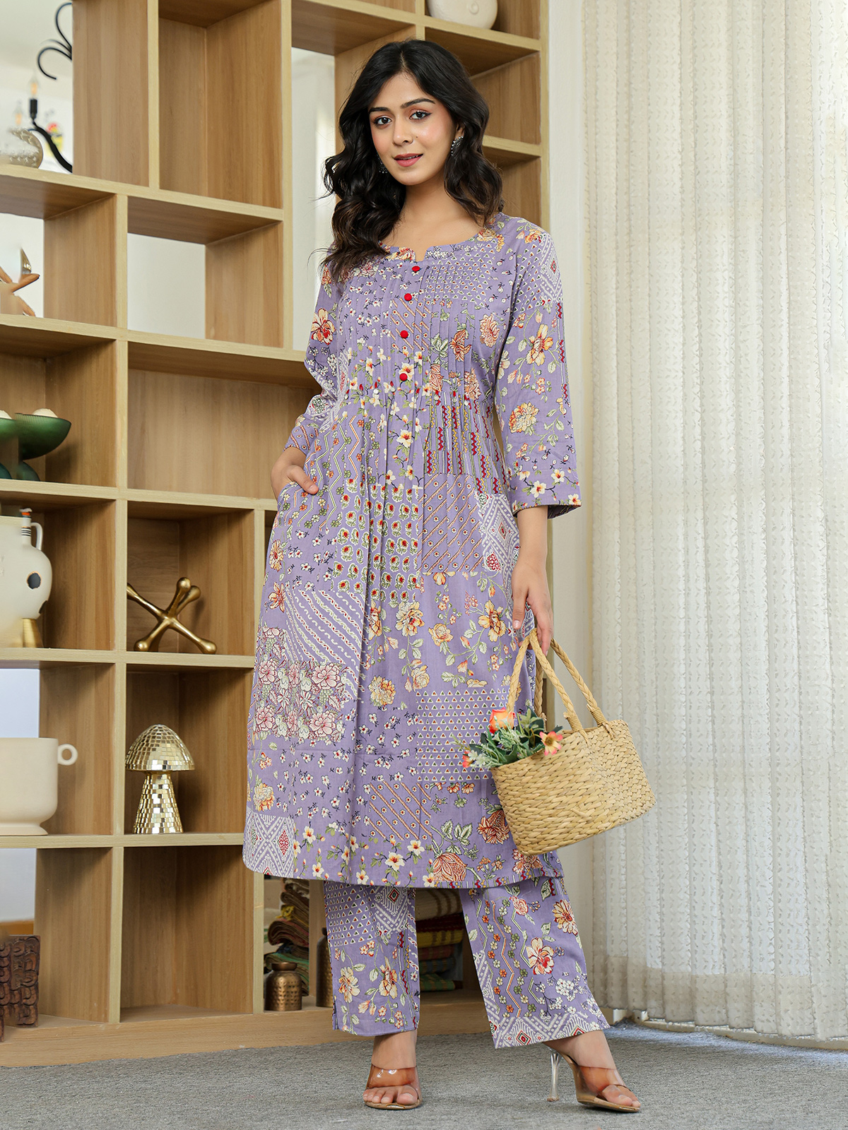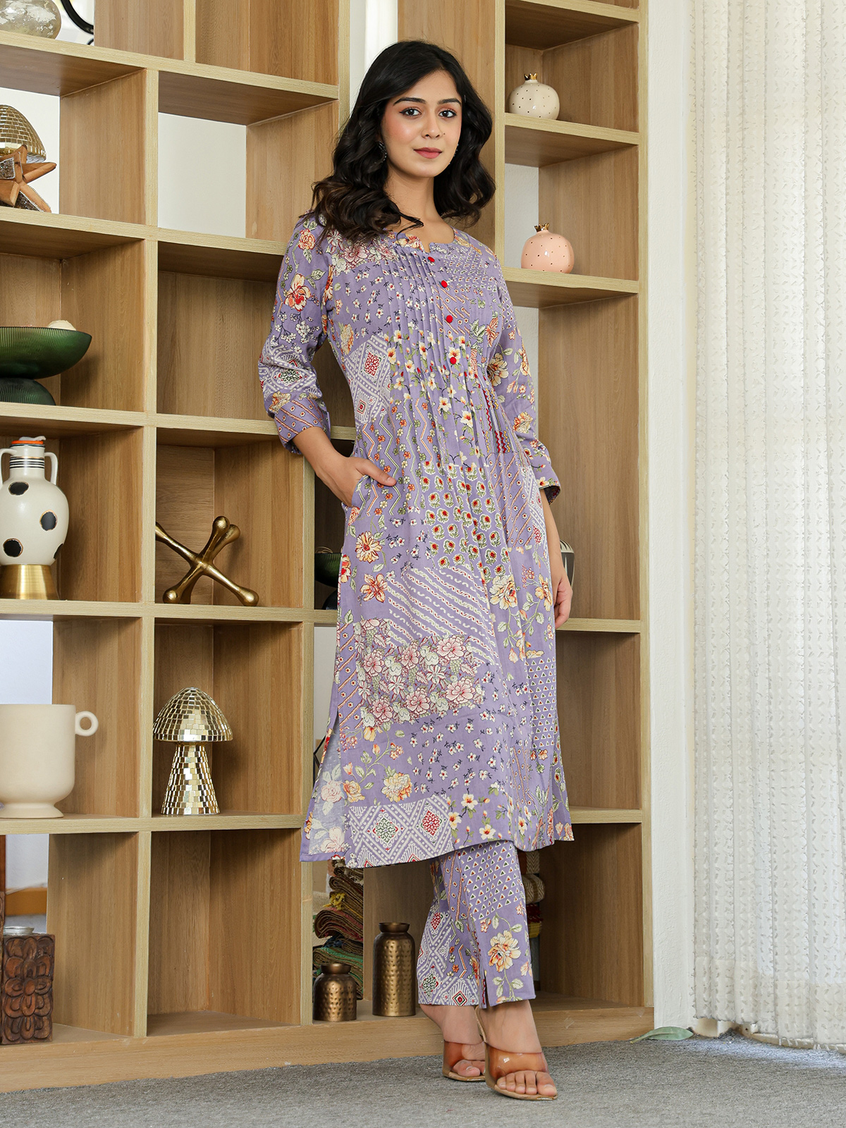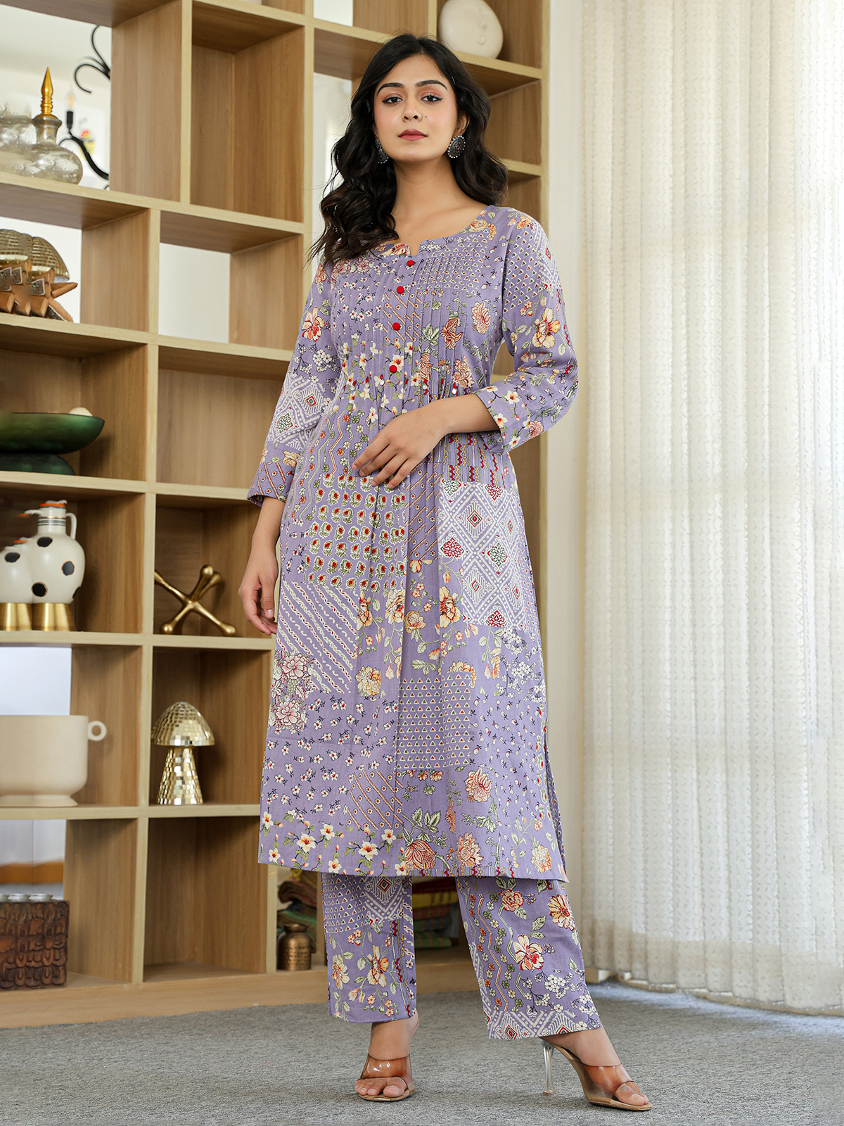 Elegant in lavender purple, this silk kurti set with quarter sleeves and pant is adorned with printed detailing. It adds a delicate ethnic charm, perfect for cultural events, festive occasions, and family celebrations where comfort meets timeless beauty.