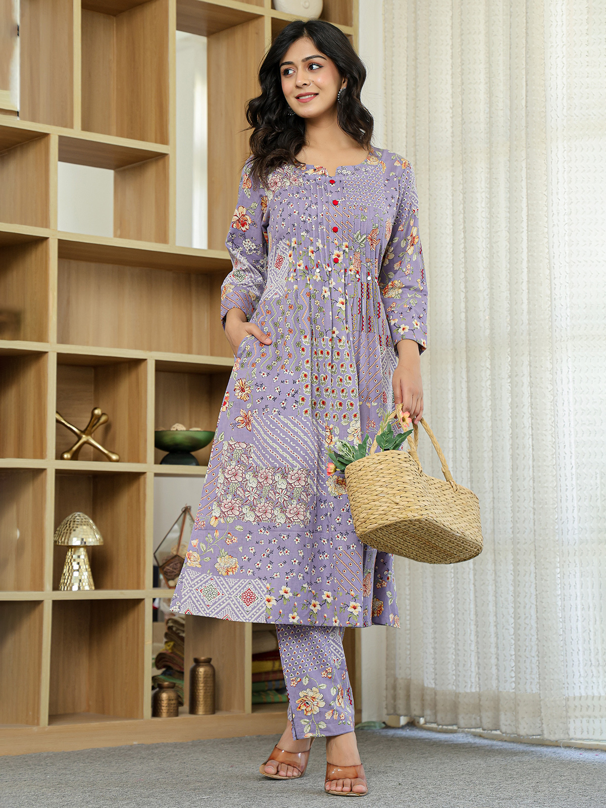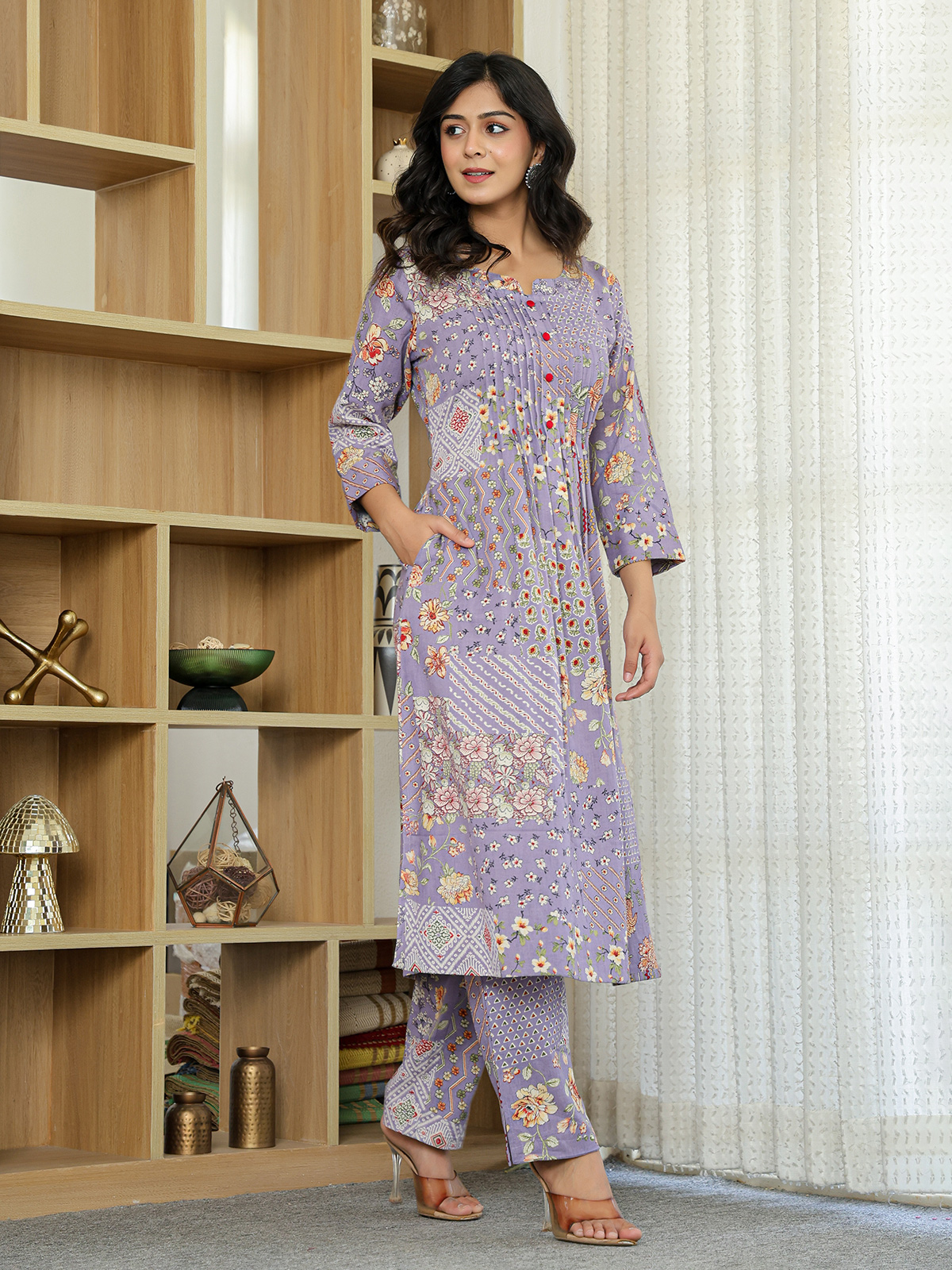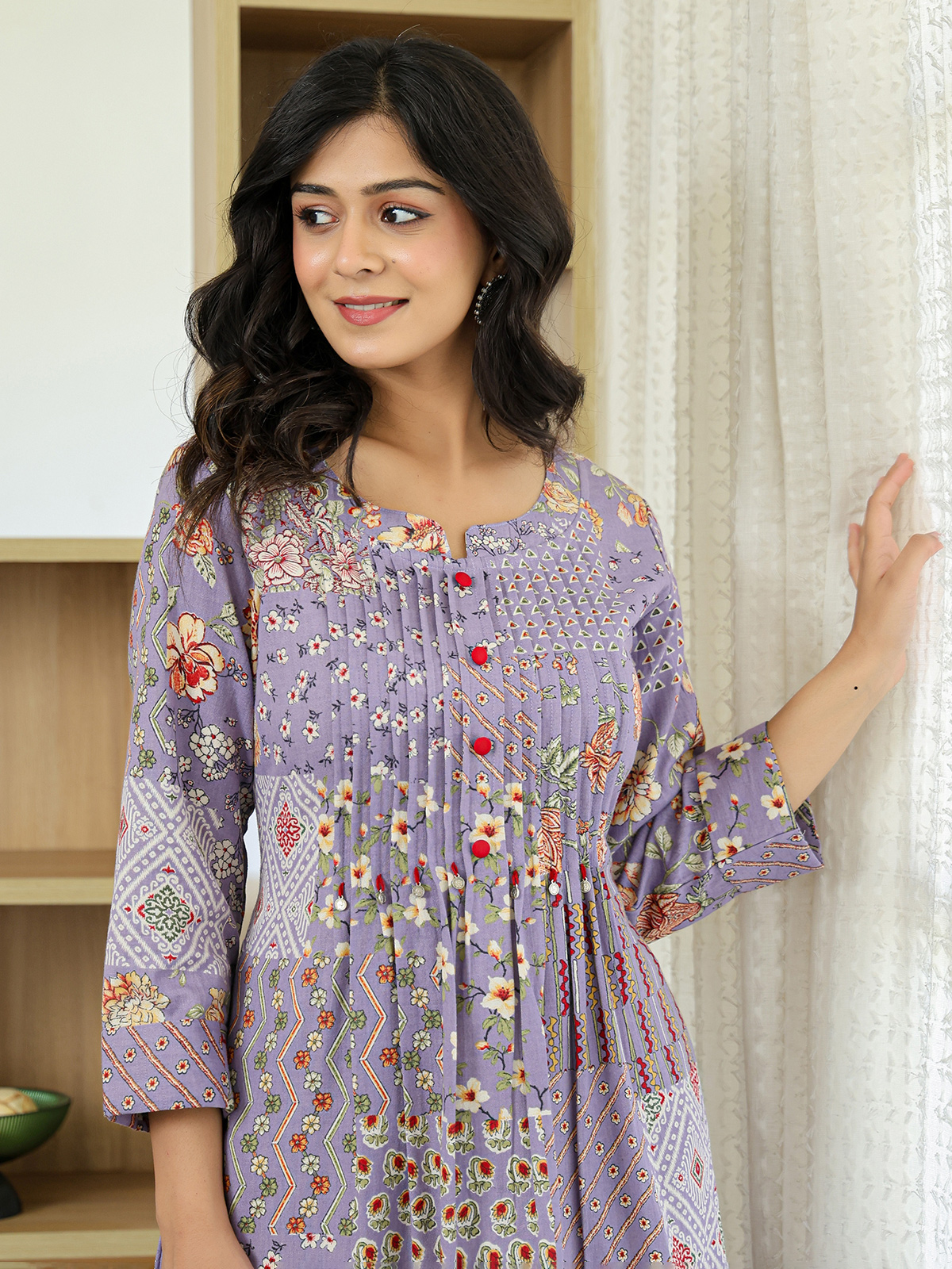 Elegant in lavender purple, this silk kurti set with quarter sleeves and pant is adorned with printed detailing. It adds a delicate ethnic charm, perfect for cultural events, festive occasions, and family celebrations where comfort meets timeless beauty.