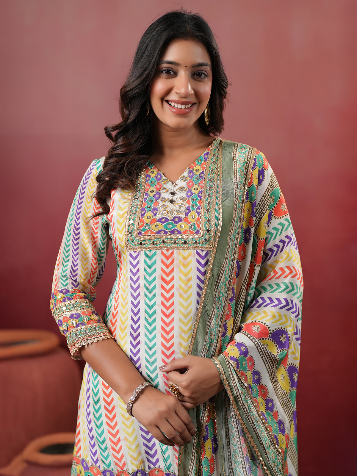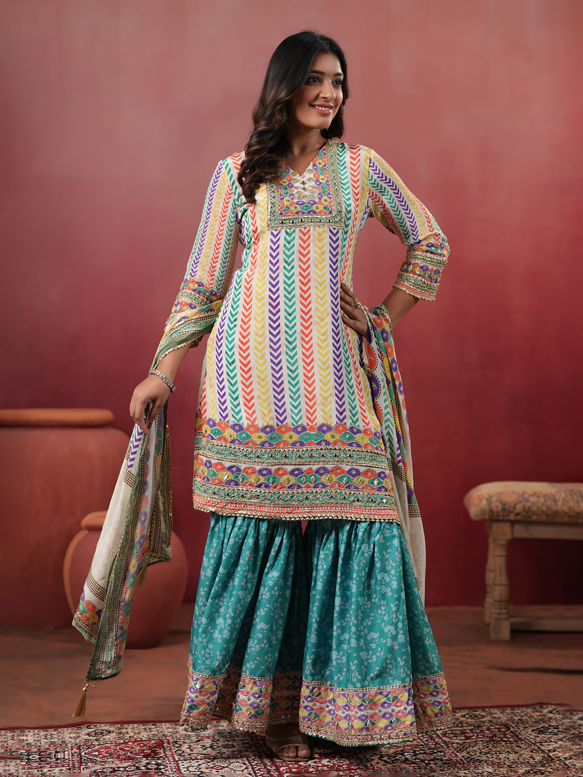 Light blue silk kurti set designed with a printed yoke accented by aabla, gota and sequins. Styled with a V-neckline and quarter sleeves, it is paired with a sharara bottom and matching dupatta, making it suitable for festive occasions.