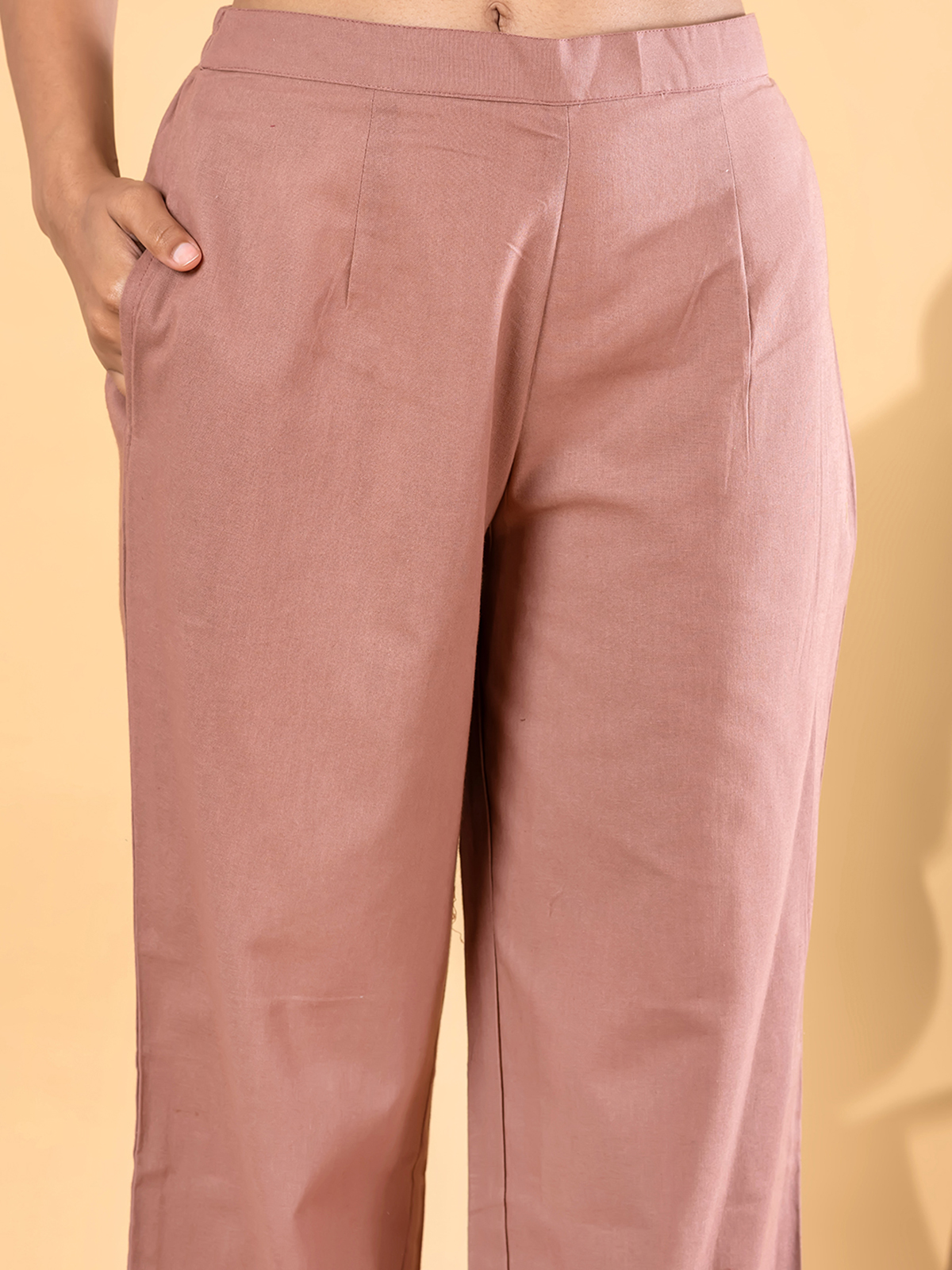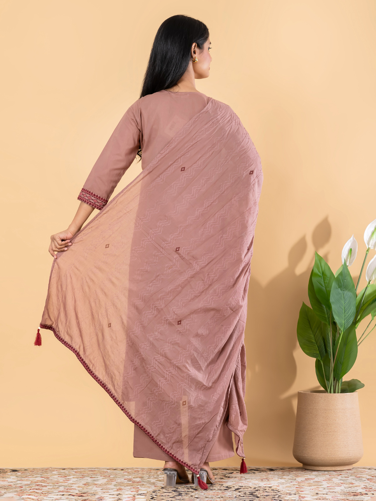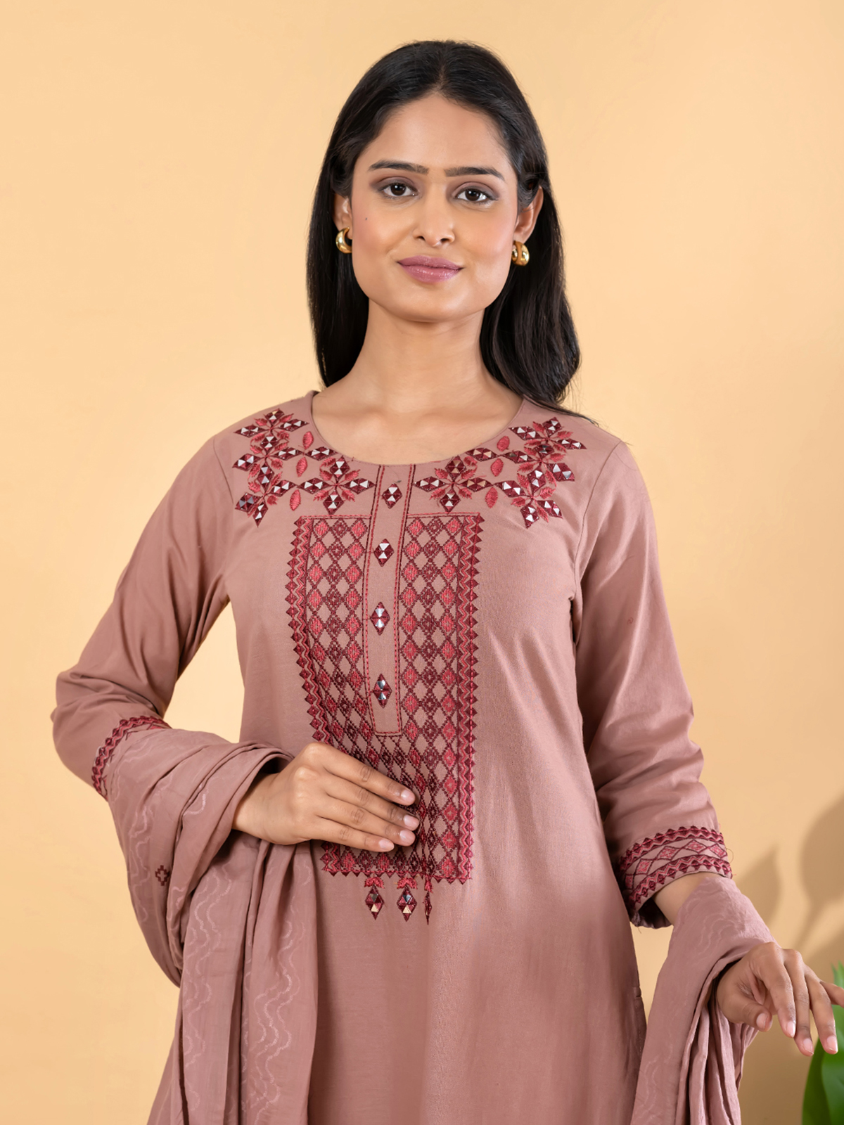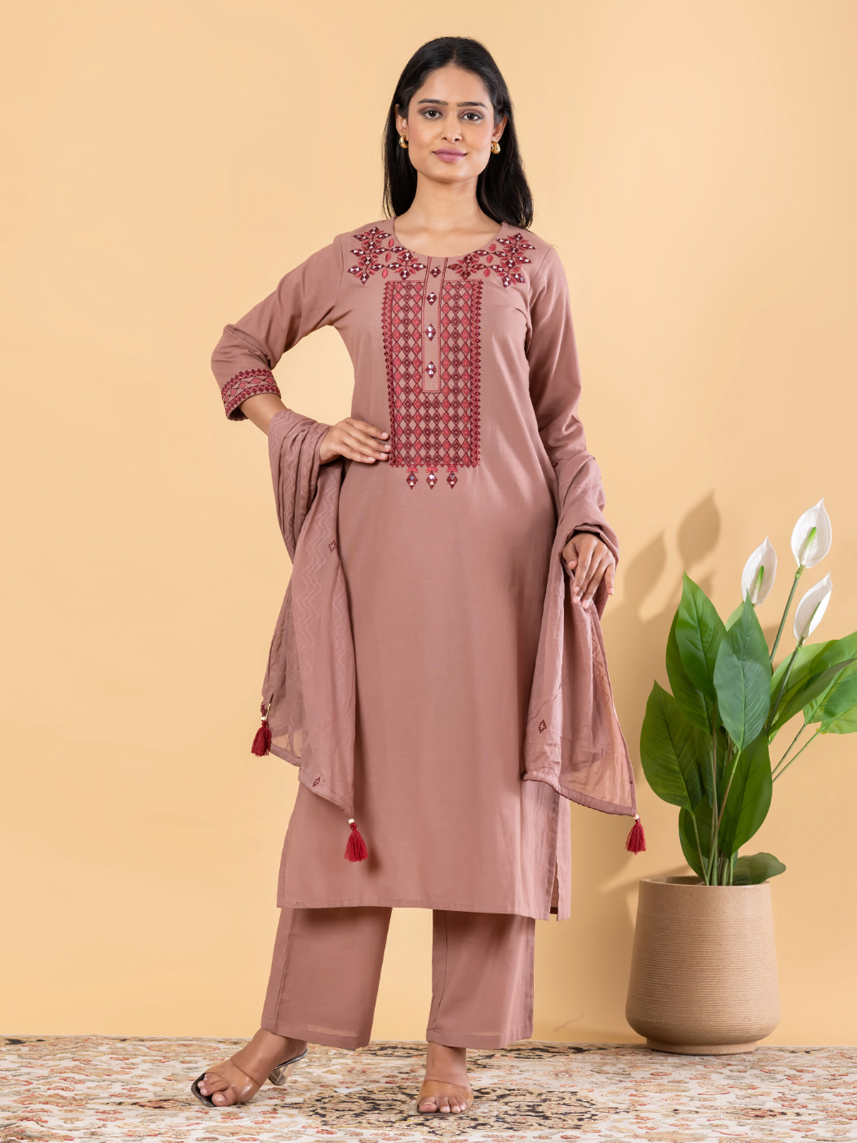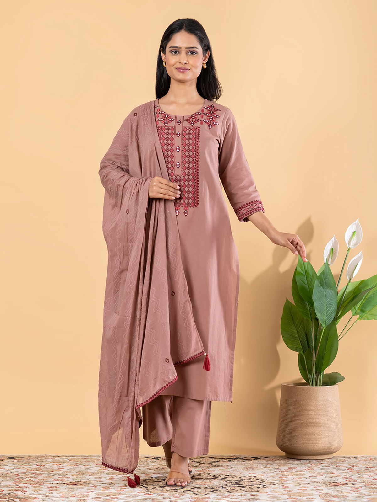 Earthy light brown tones enhance the refined craftsmanship of this ethnic celebration outfit. Designed with a classic round neckline and quarter sleeves, it includes coordinated trousers and a matching dupatta. Comfortable yet stylish, this set is ideal for festive gatherings that call for understated elegance.