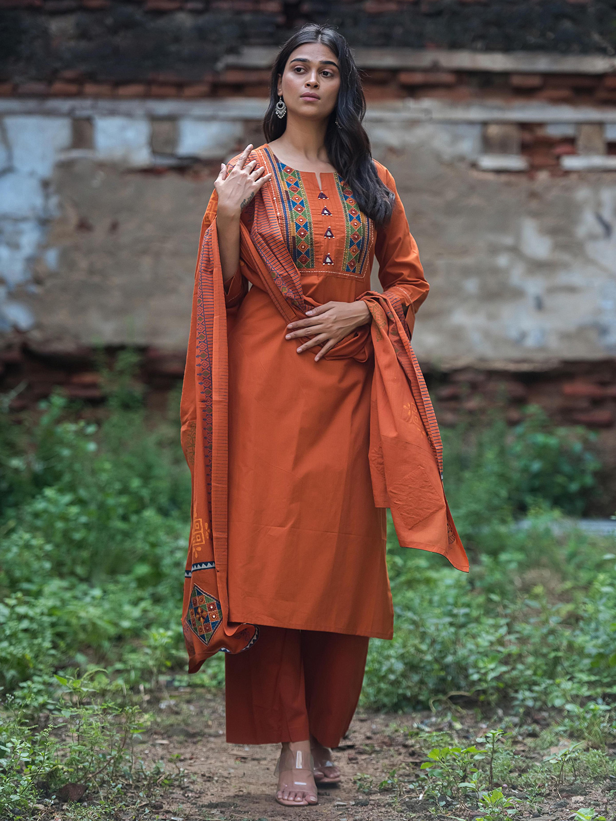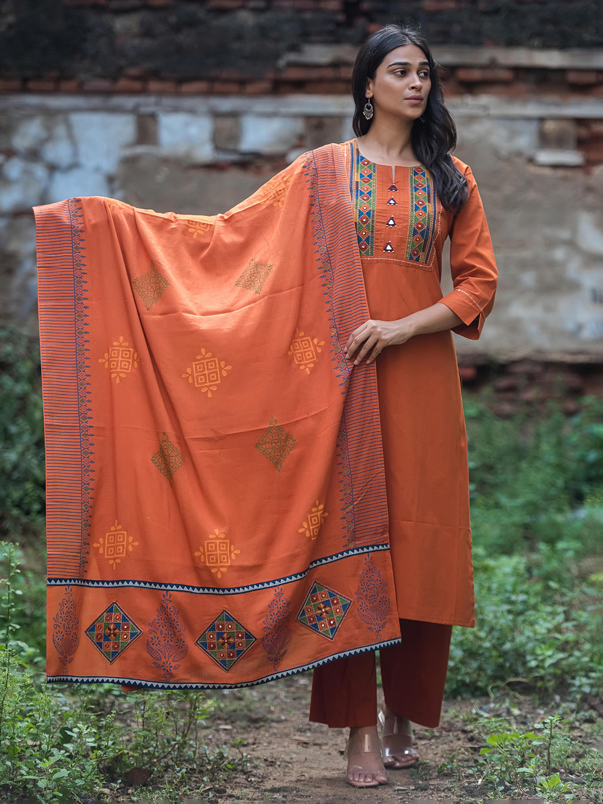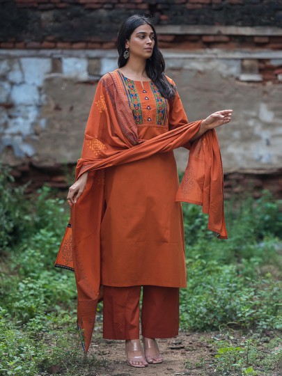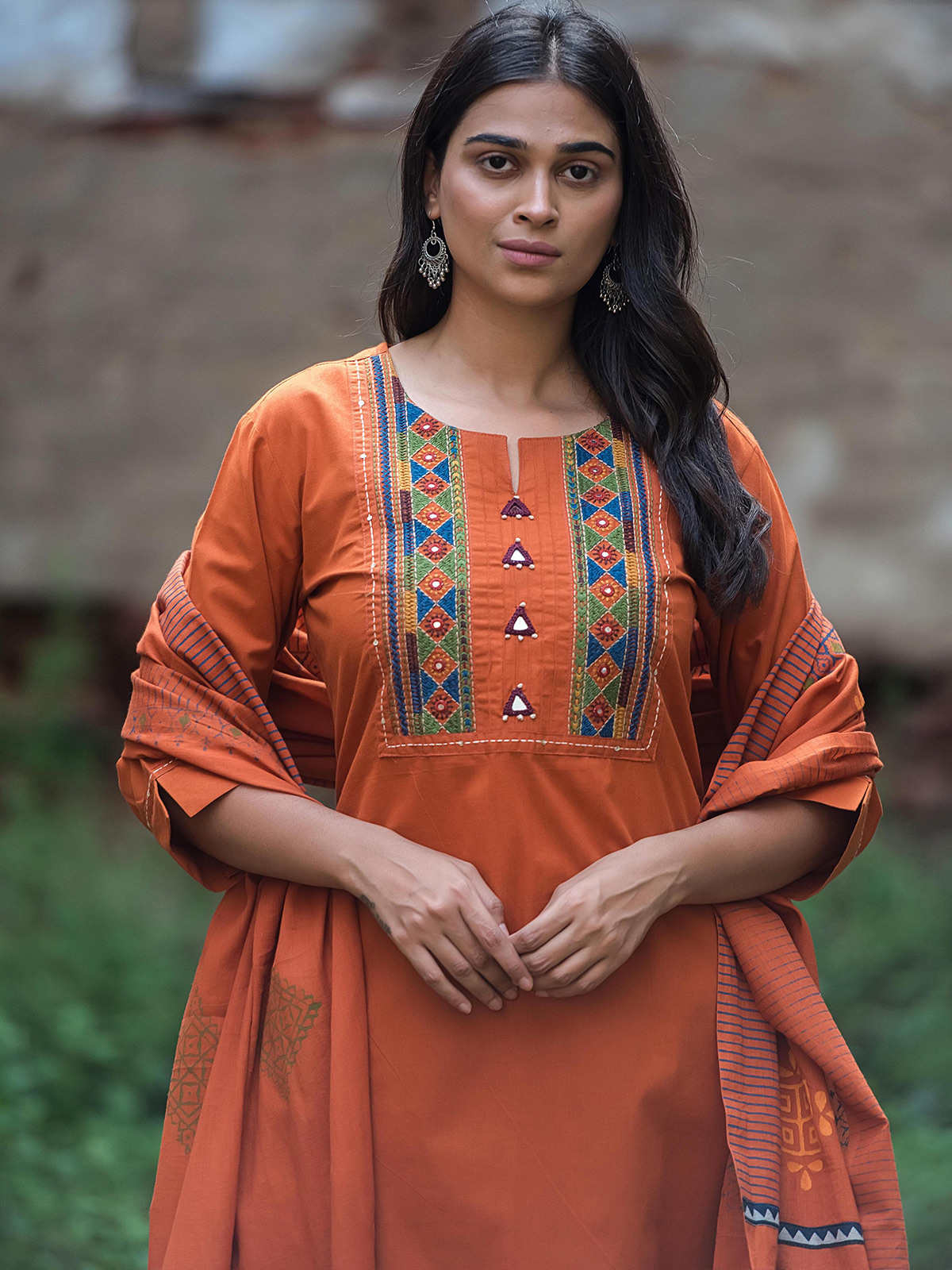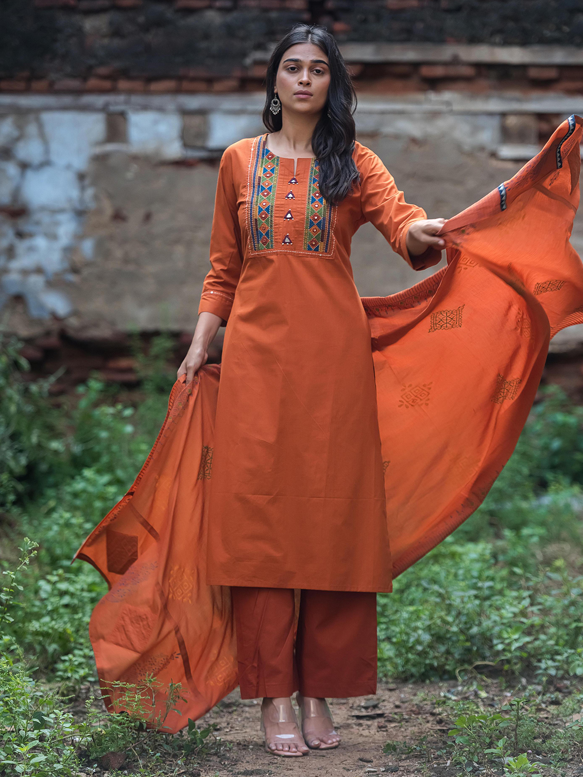 Subtle light brown cotton kurti set showcasing yoke style embroidery accented with sequins, mirror and thread work. Designed with quarter sleeves, it comes with a pant and dupatta for festive occasions.