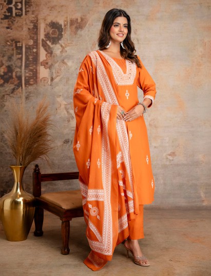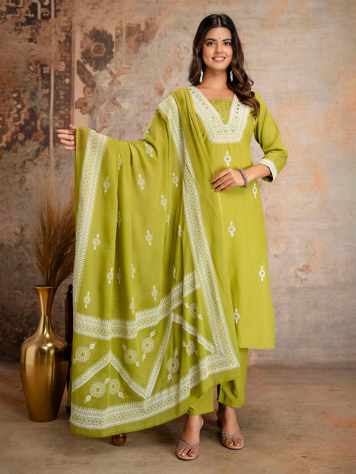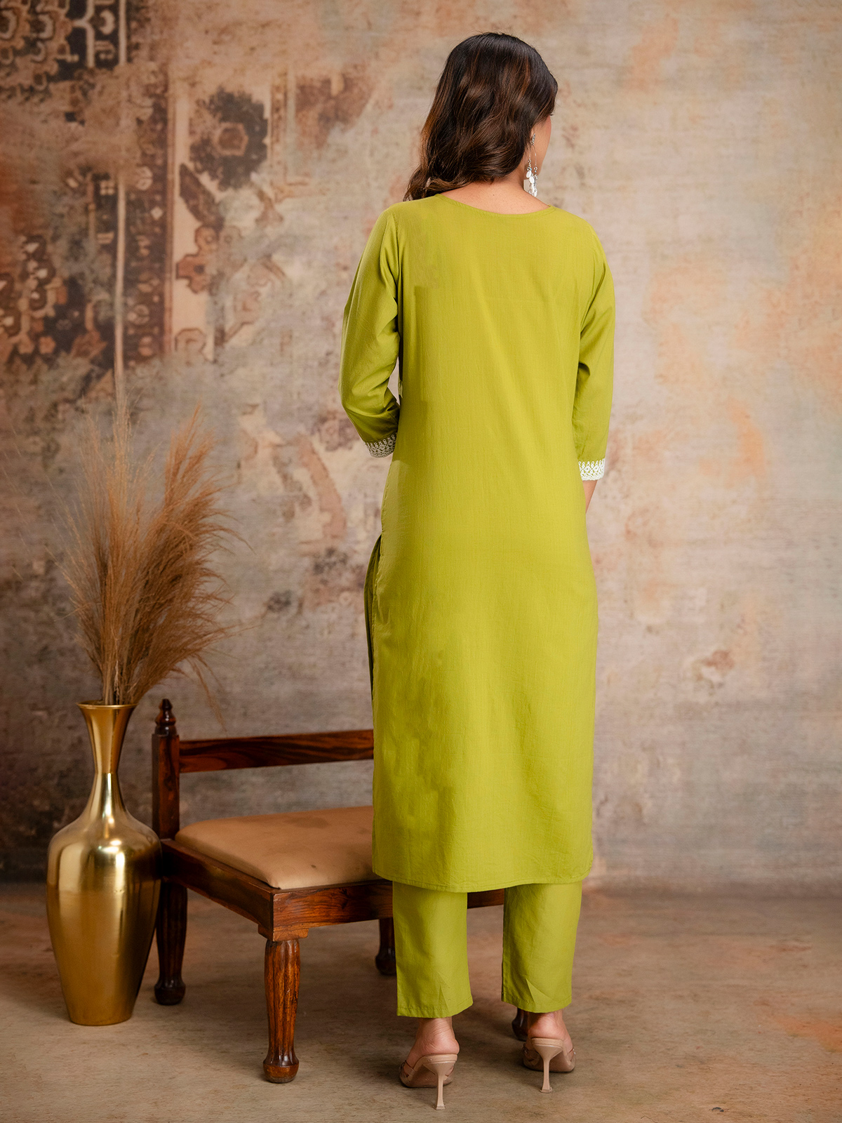 Discover timeless festive elegance in this light green cotton silk kurti set that enhances your sophisticated charm. Crafted with a graceful neckline and quarter sleeves, it is enriched with delicate aabla and thread work for refined appeal. Ideal for festive occasions, it is paired with tailored pants and a coordinated printed dupatta.