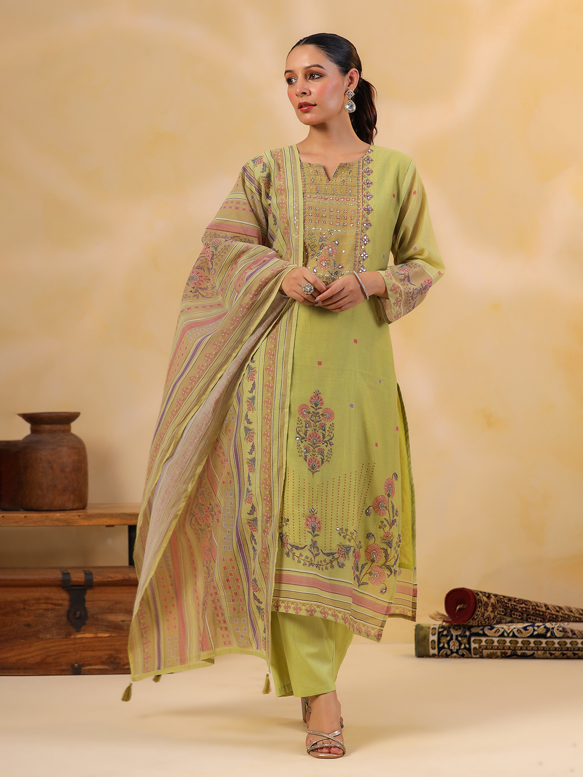 Refreshing in light green silk, this kurti set is enriched with mirror, cutdana, beads, sequins, and thread embroidery. The sweetheart neckline with quarter sleeves brings charm, while the pant and dupatta complete the look. A perfect choice for festive gatherings and joyous occasions.