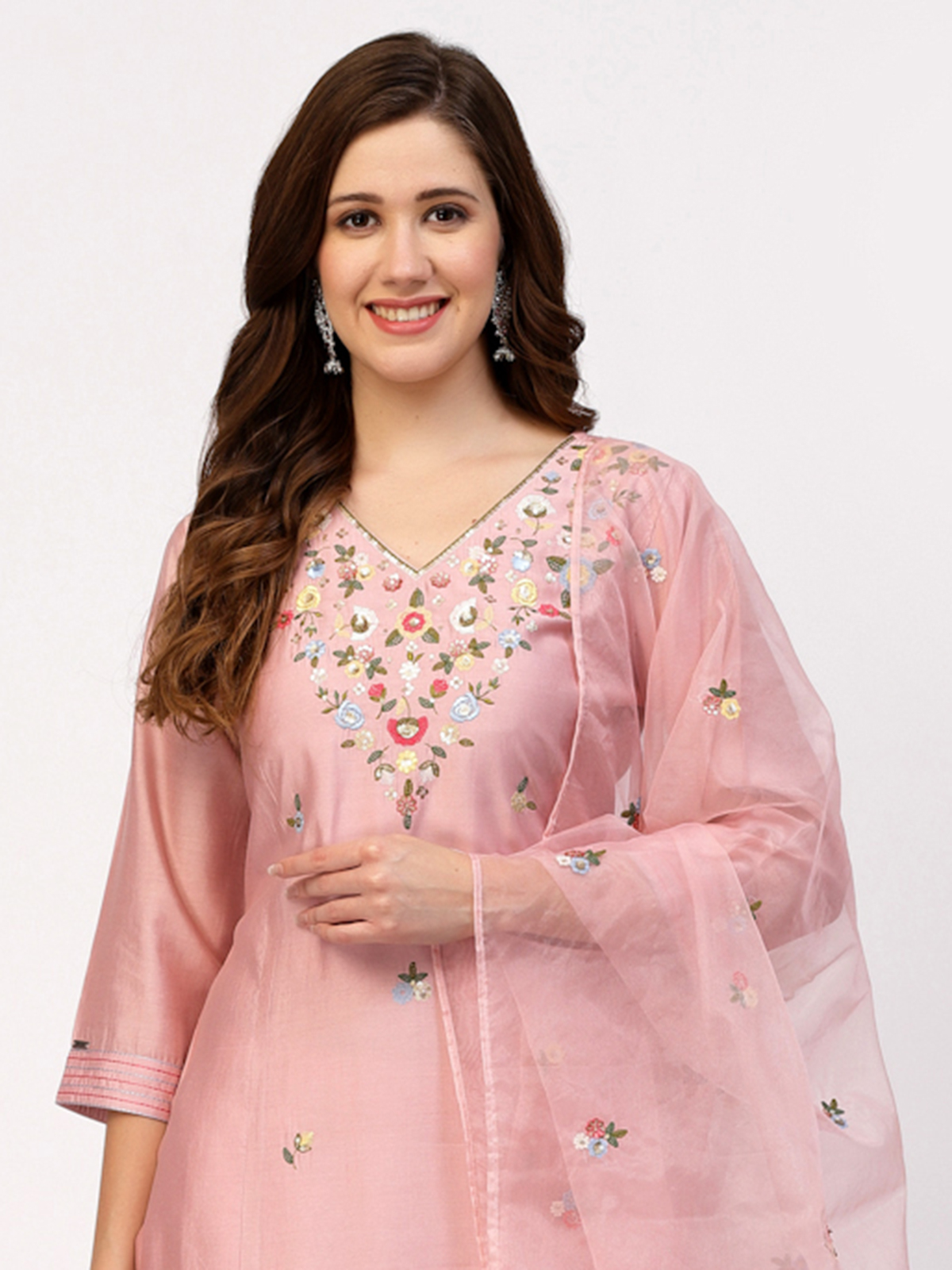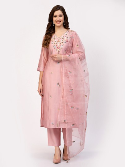 Crafted to celebrate refined beauty and understated elegance, this soothing light pink silk kurti set radiates gentle festive charm. Designed with a graceful V neckline, quarter sleeves, and elegant embroidery work that enhances its polished silhouette, it is suitable for festive occasions and is paired with a comfortable pant and a complementing dupatta.