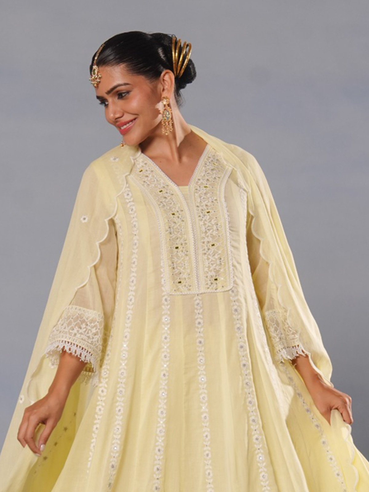 Elevating your festive style, this light yellow cotton Anarkali kurti set radiates cheerful elegance and charm. Designed with a simple neckline and quarter sleeves, it is adorned with detailed thread, stone and mirror work for a radiant appeal. Perfect for festive gatherings, it is paired with a pant and a dupatta for a graceful ethnic ensemble.