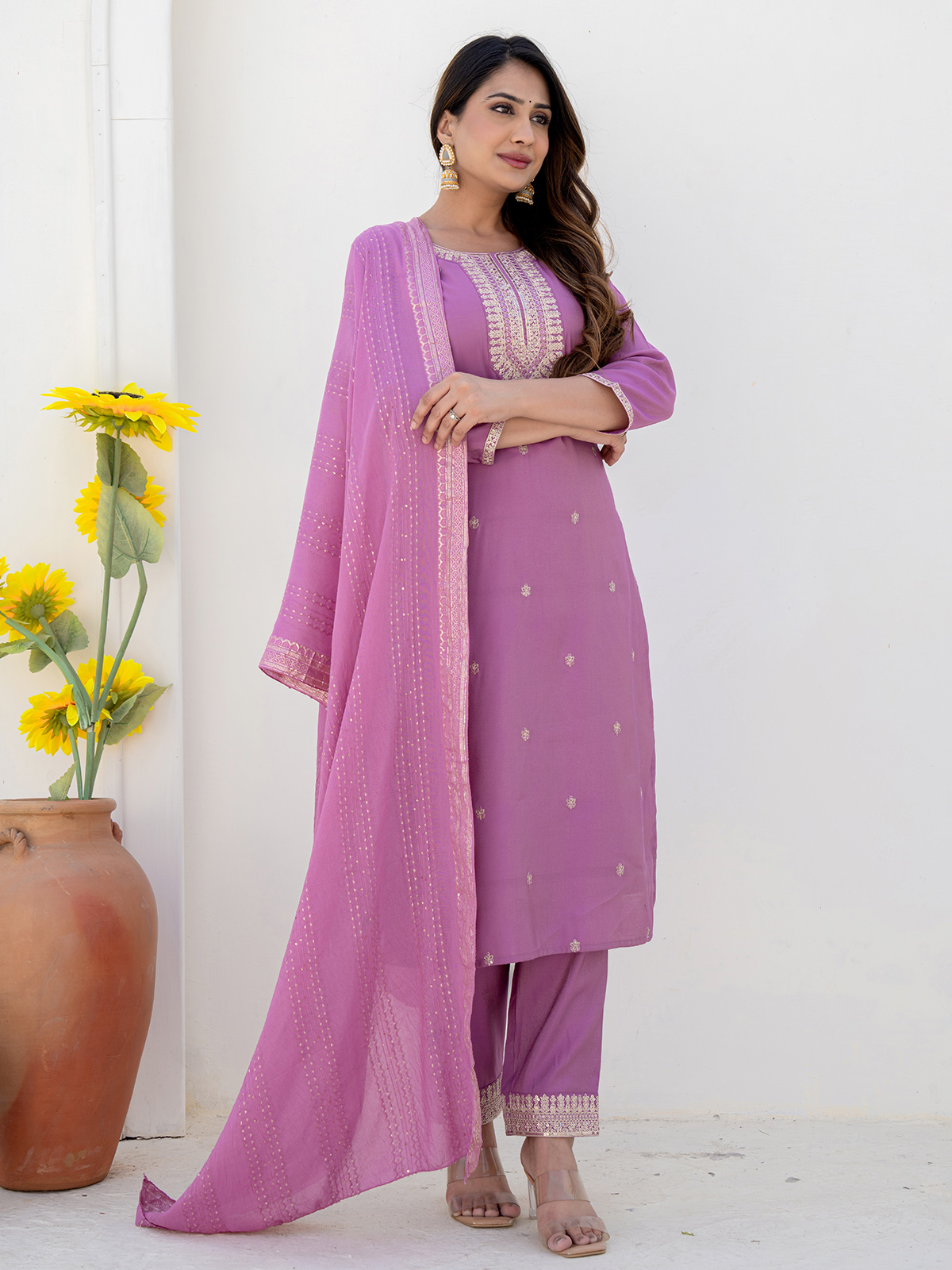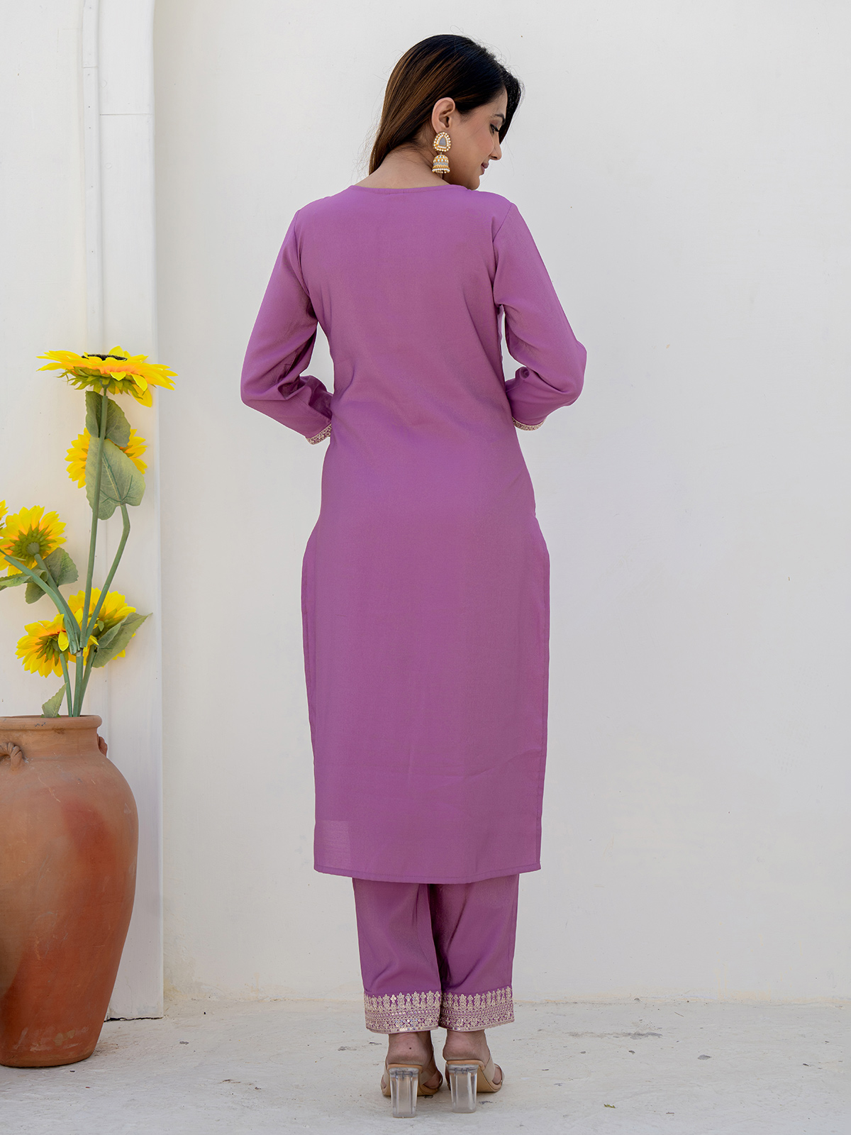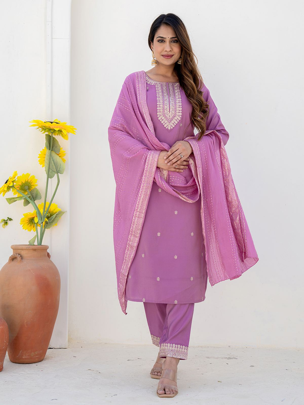 Graceful and serene, this lilac purple silk kurti set is detailed with embroidery, sequins, and thread work. With a classic round neckline, quarter sleeves, pants, and a flowing dupatta, it’s an elegant pick for Rakhi, sangeet, or intimate festive moments.
