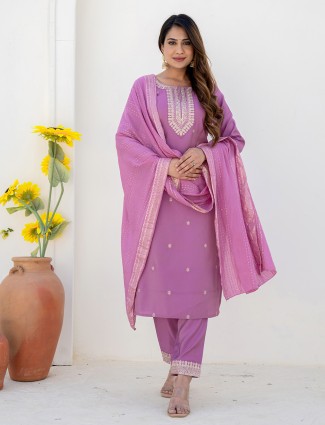 Lilac Purple Embroidered Silk Kurti Set