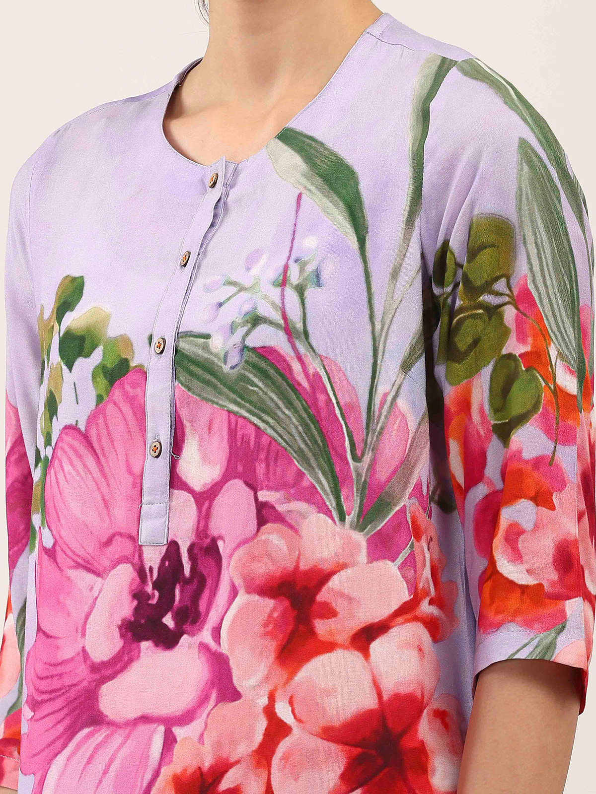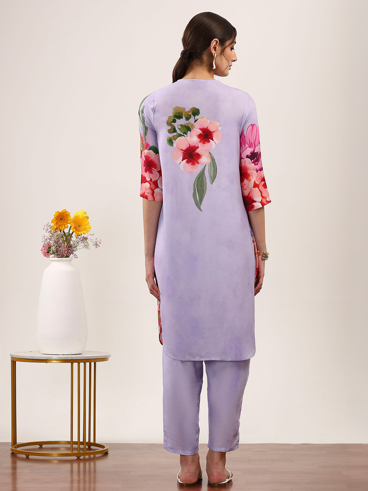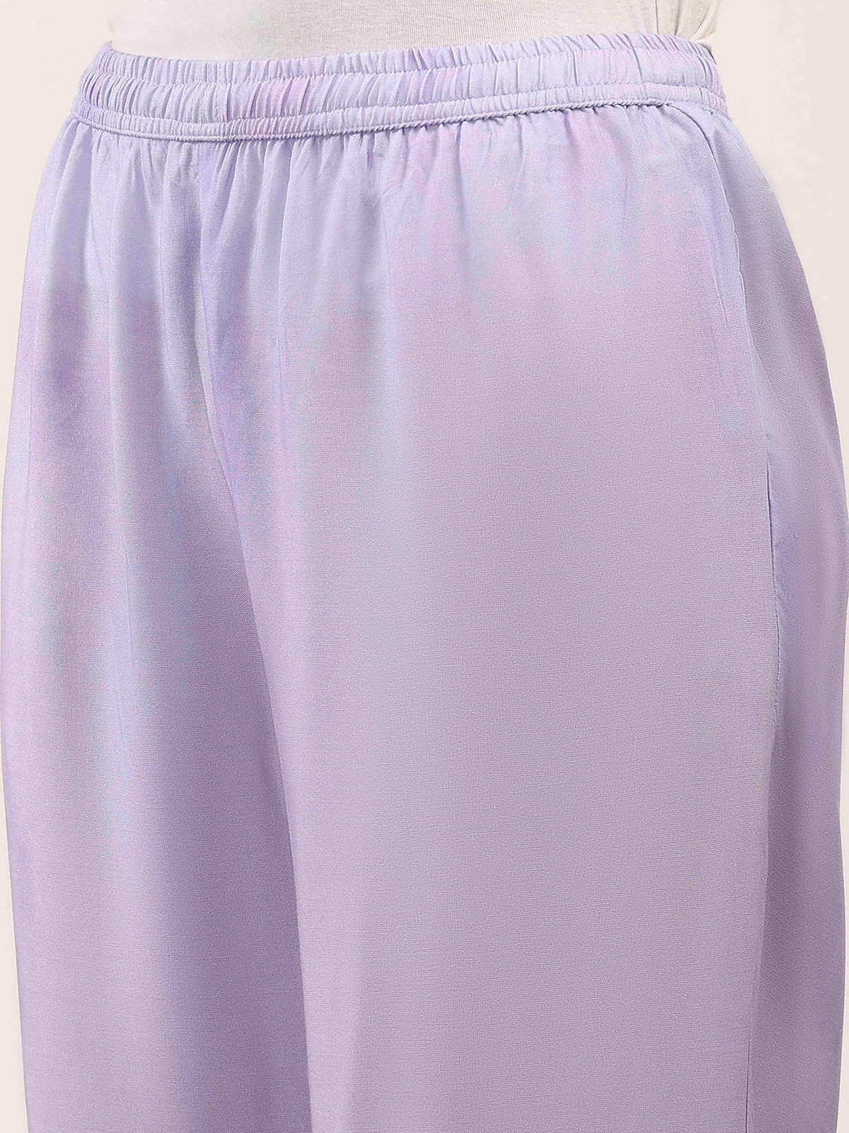 Rendered in soft lilac purple crepe silk, this kurti set features charming floral prints for a fresh casual appeal. Styled with a round neckline and quarter sleeves, it ensures lasting comfort. Paired with pants, it is perfect for relaxed daytime wear and graceful everyday styling.