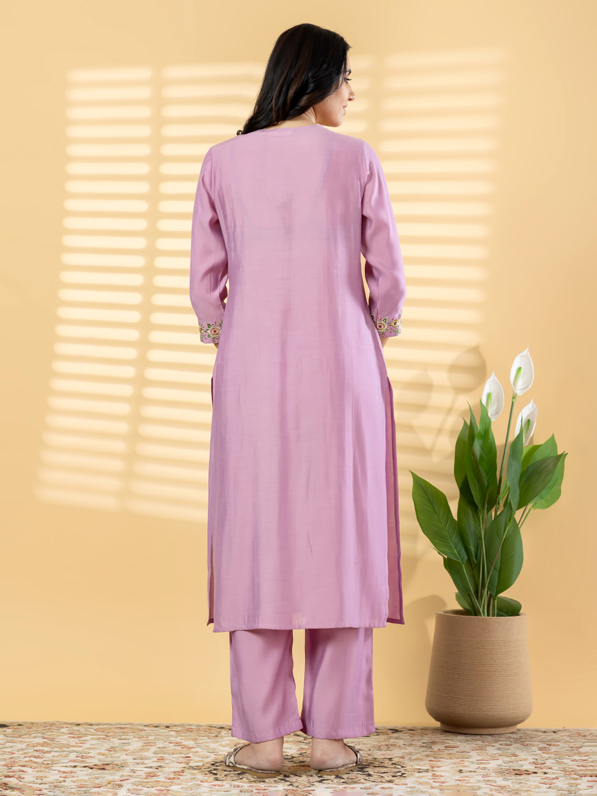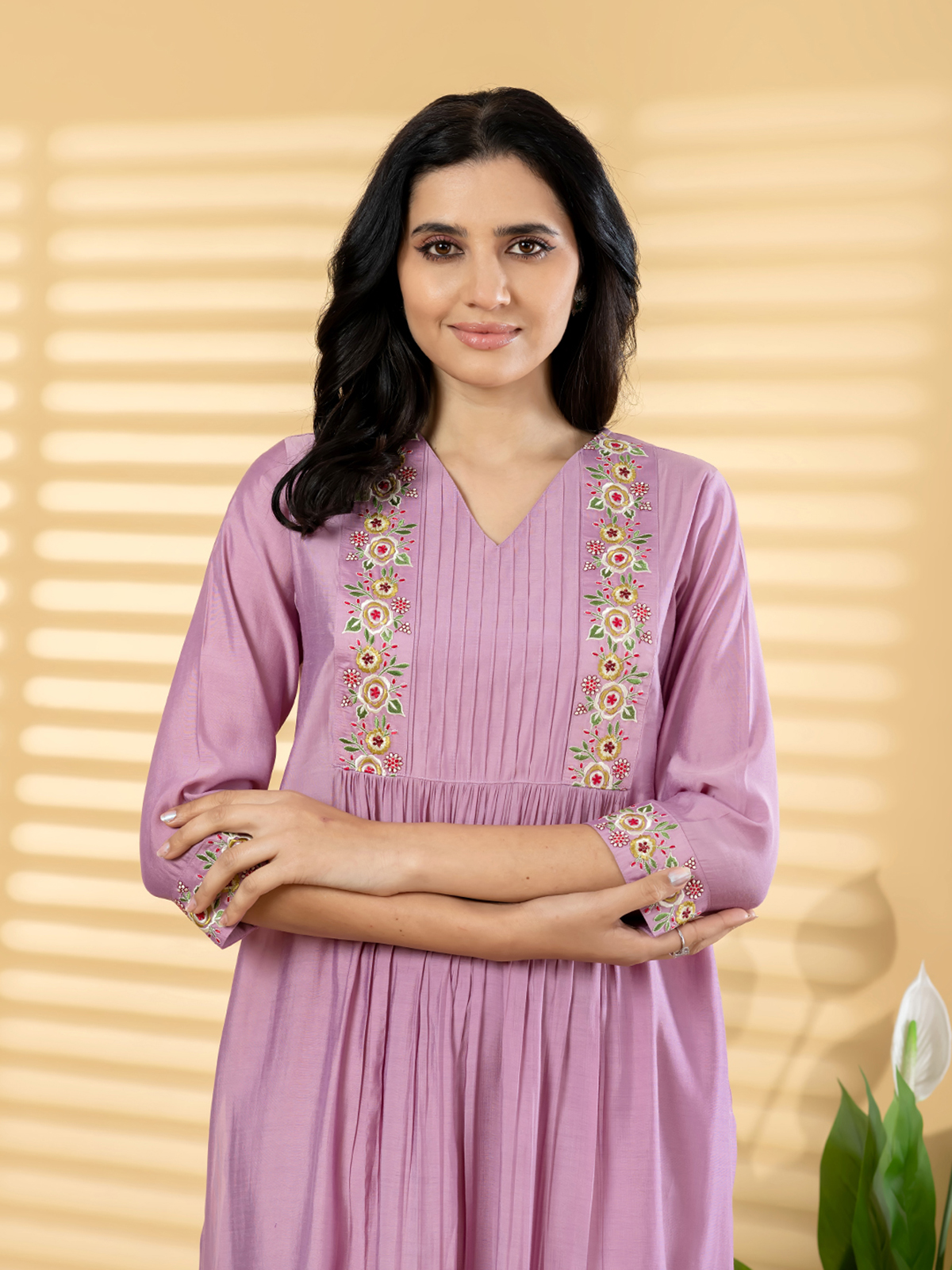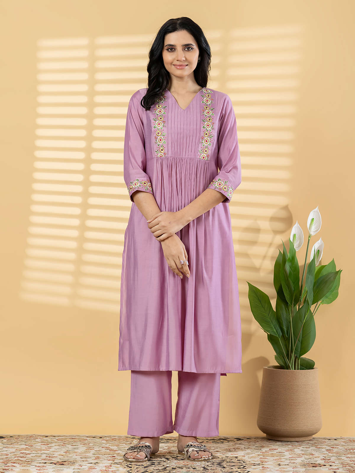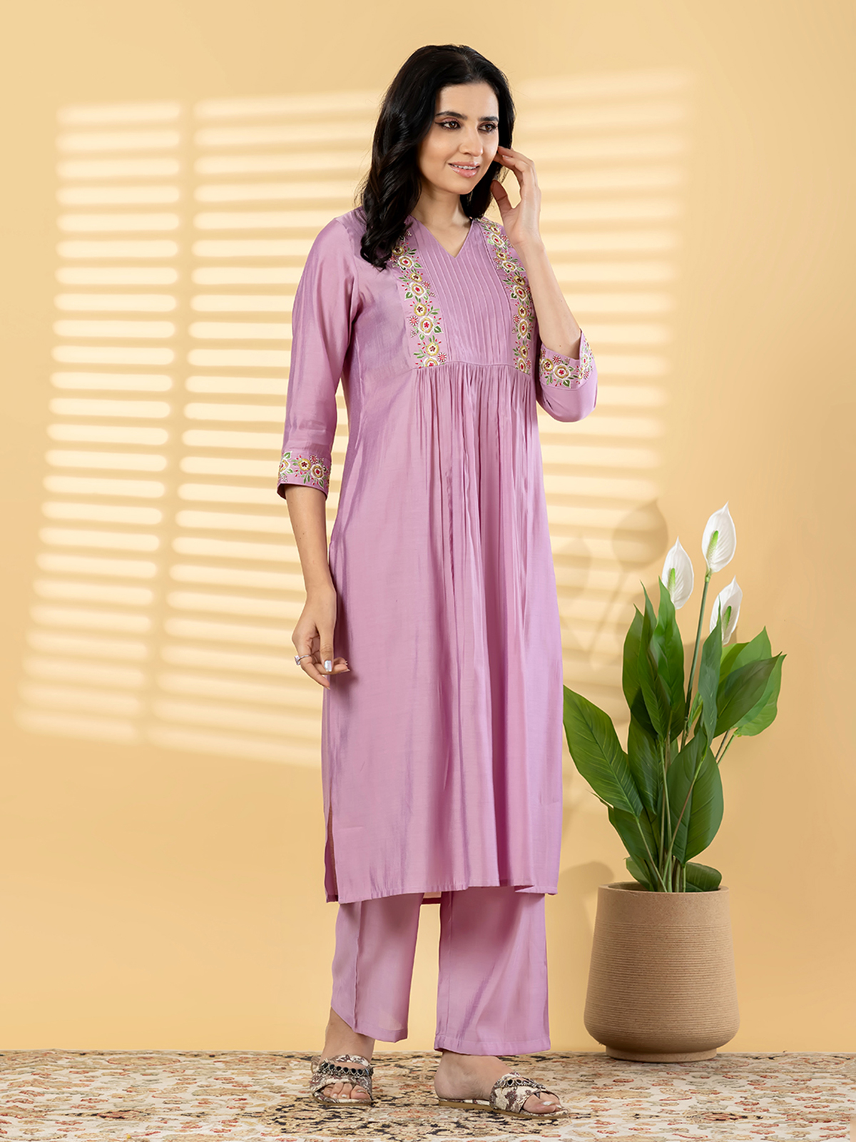 Soft lilac purple hues enhance this silk kurti set crafted in a graceful yoke style. Featuring elegant embroidery, a V neckline and quarter sleeves. It brings a feminine and soothing appeal. Paired with pants, this outfit is ideal for casual wear and relaxed daytime occasions.