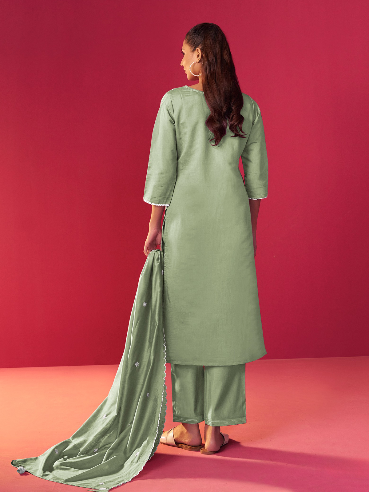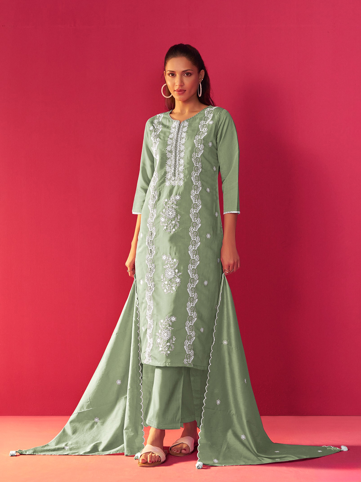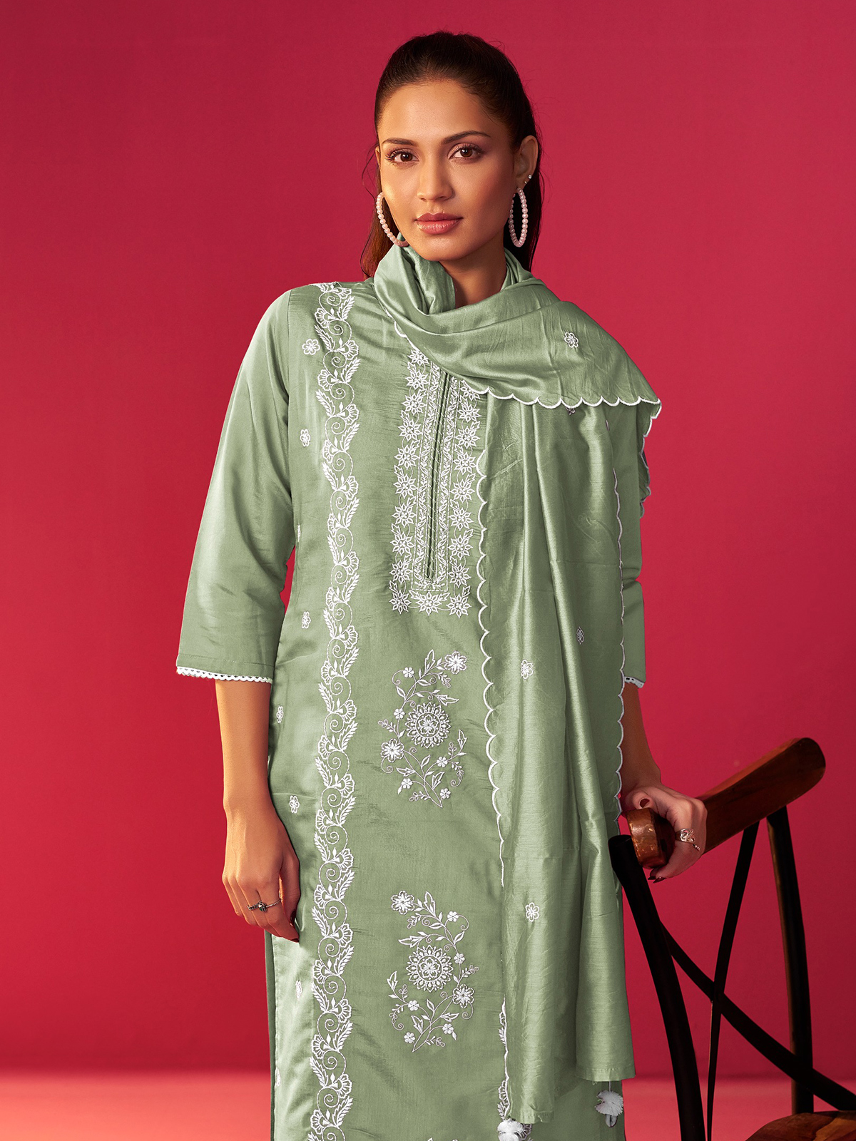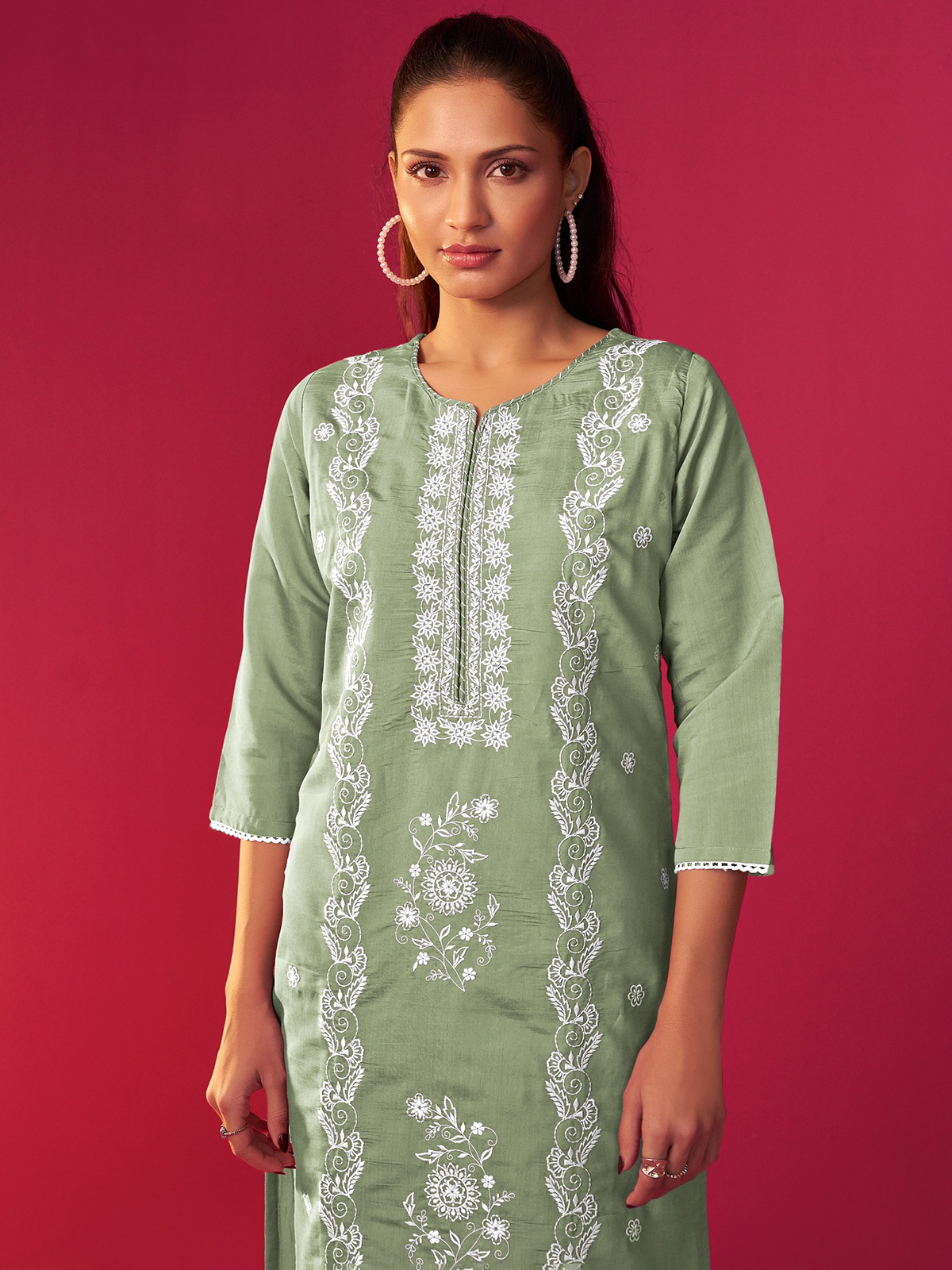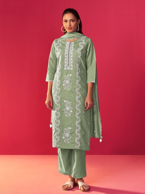 This graceful light green kurti set is a celebration of intricate embroidery, paired with a matching dupatta to elevate your look. Crafted from soft silk, it offers both comfort and sophistication. The sweetheart neckline adds a delicate touch, while the quarter pant ensures a stylish, modern silhouette. Perfect for any festive event or celebration, this ensemble is a true standout.