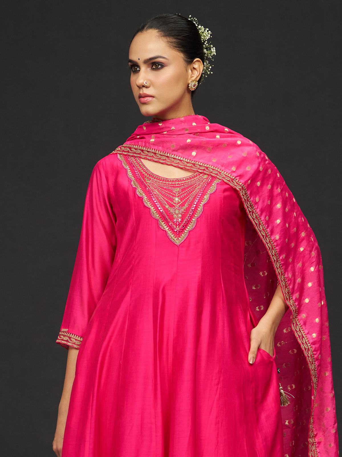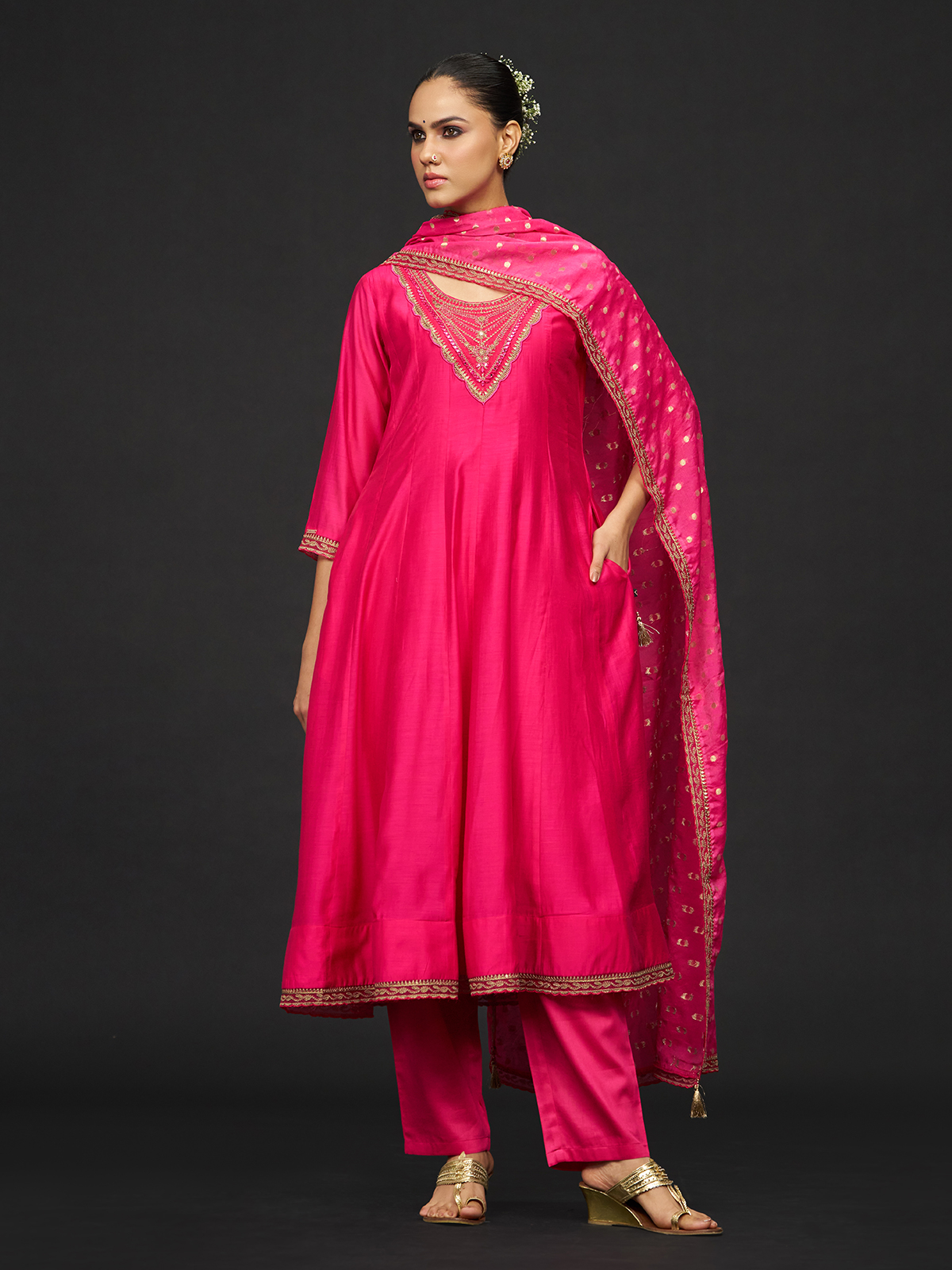 Bold and elegant, this magenta silk kurti set is adorned with ornate aabla work, resham embroidery, and shimmering sequin accents. Featuring a round neckline and quarter sleeves, it is paired with a pant and dupatta, perfect for festive celebrations and stylish daytime events.