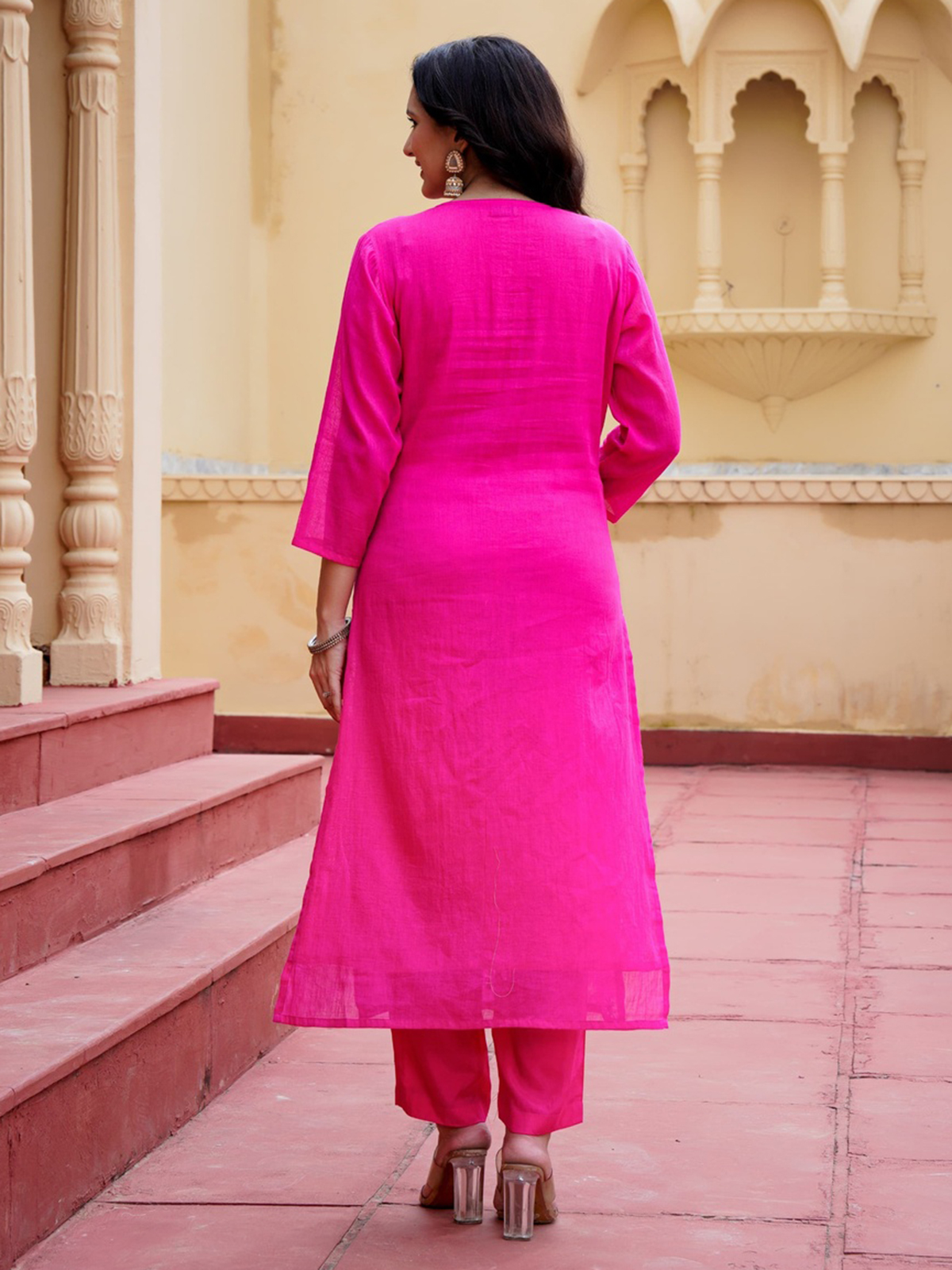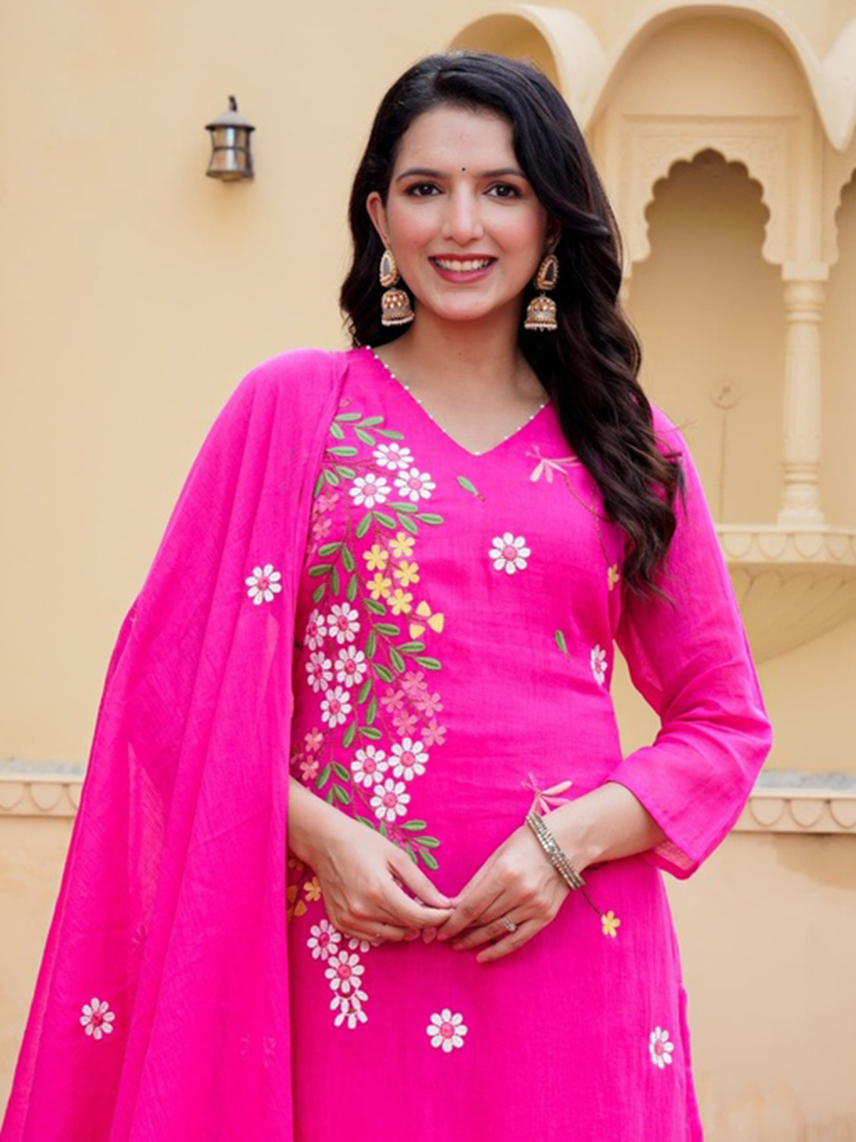 Designed in breathable cotton, this magenta kurti set is detailed with tasteful embroidery and paired with a matching dupatta and pants. The V-neckline and quarter sleeves make it ideal for festive occasions, blending vibrant color, comfort, and traditional charm effortlessly.