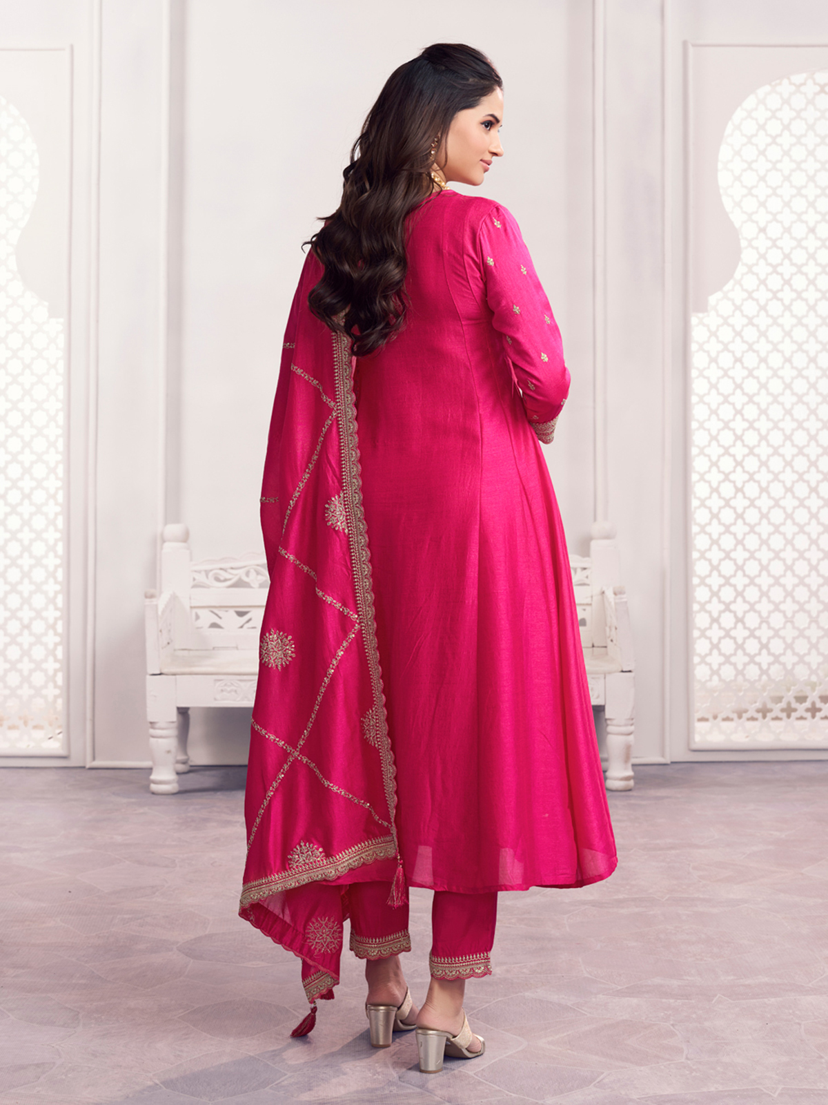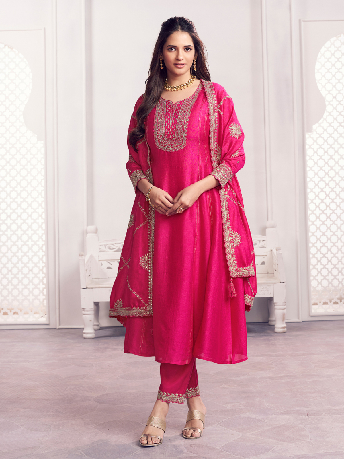 This magenta silk kurti set is beautifully enhanced with embroidery and sequin work, creating a striking festive and wedding ready look. Styled with a sweetheart neckline and quarter sleeves, it is paired with a pant and a richly detailed dupatta, perfect for weddings and festive occasions.