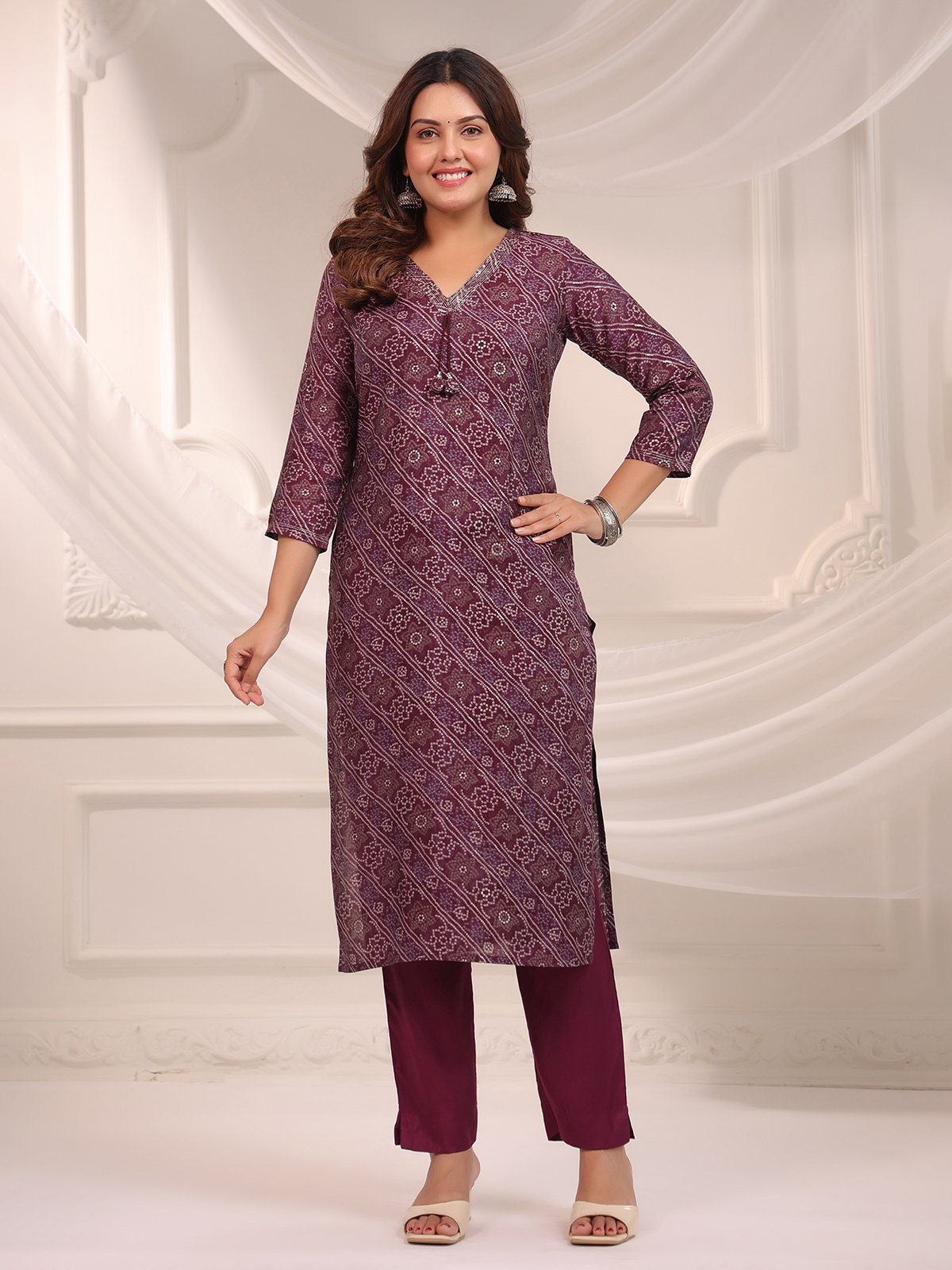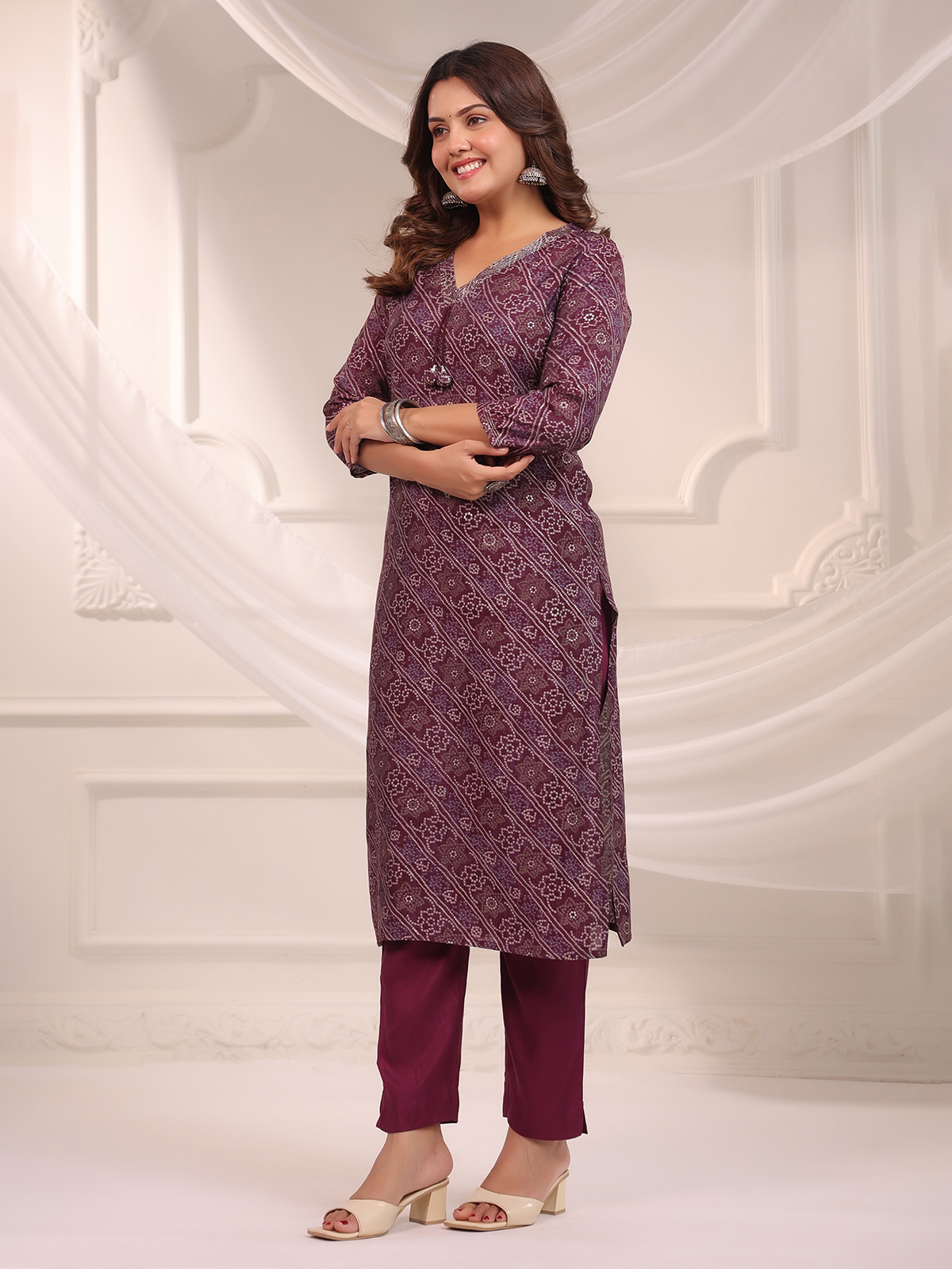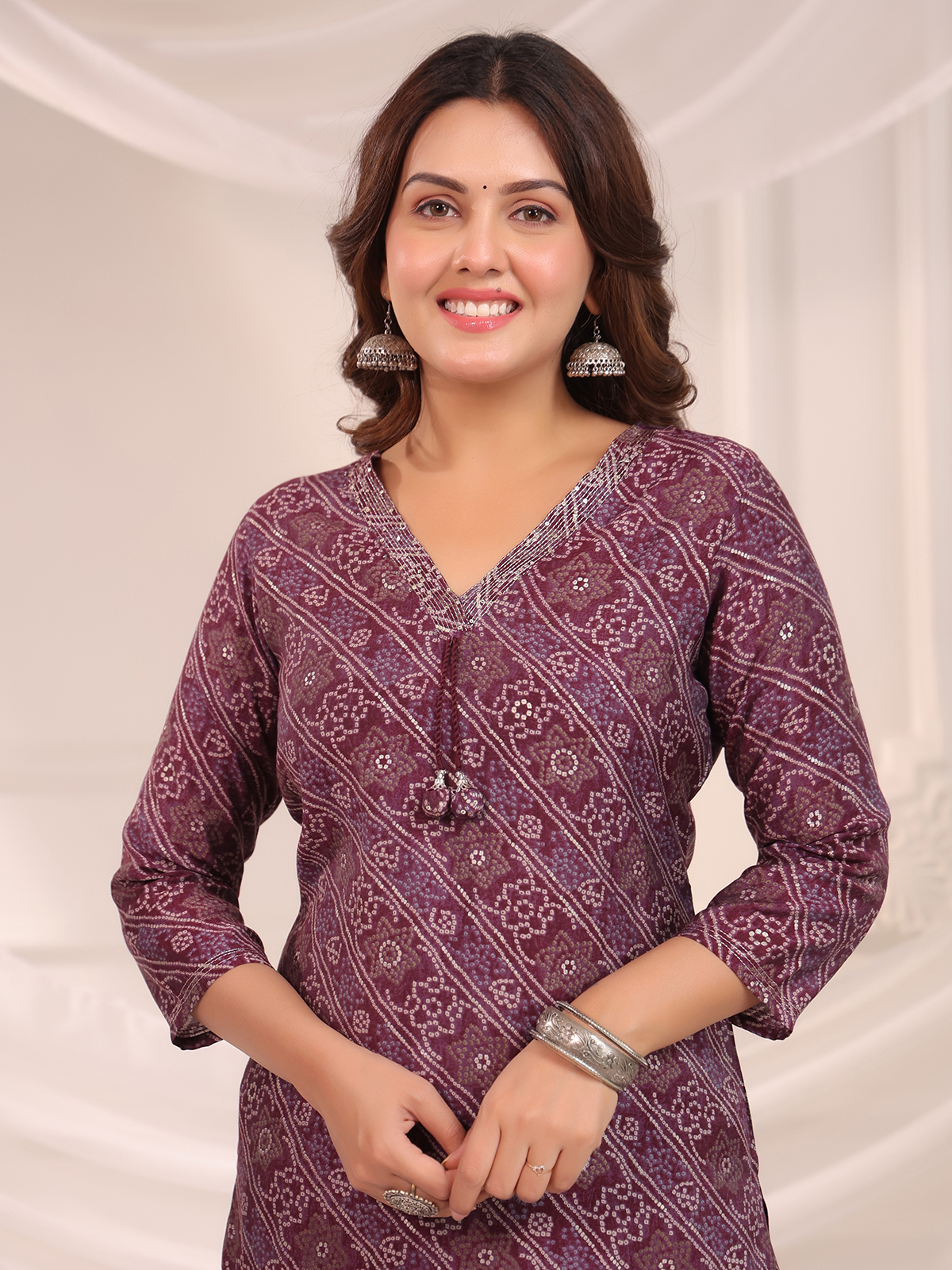 Embrace effortless festive charm with this elegant maroon cotton kurti set designed for graceful ethnic styling. The kurti features a beautiful bandhej print enhanced with delicate thread and sequin detailing, adding a subtle festive sparkle. Styled with a V-neckline and quarter sleeves, it is paired with a comfortable pant, making it a perfect choice for festive celebrations and special gatherings.
