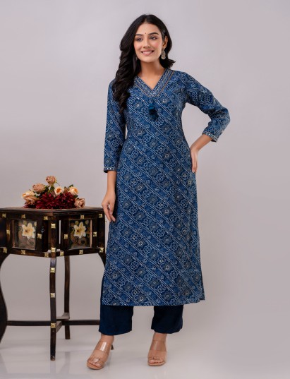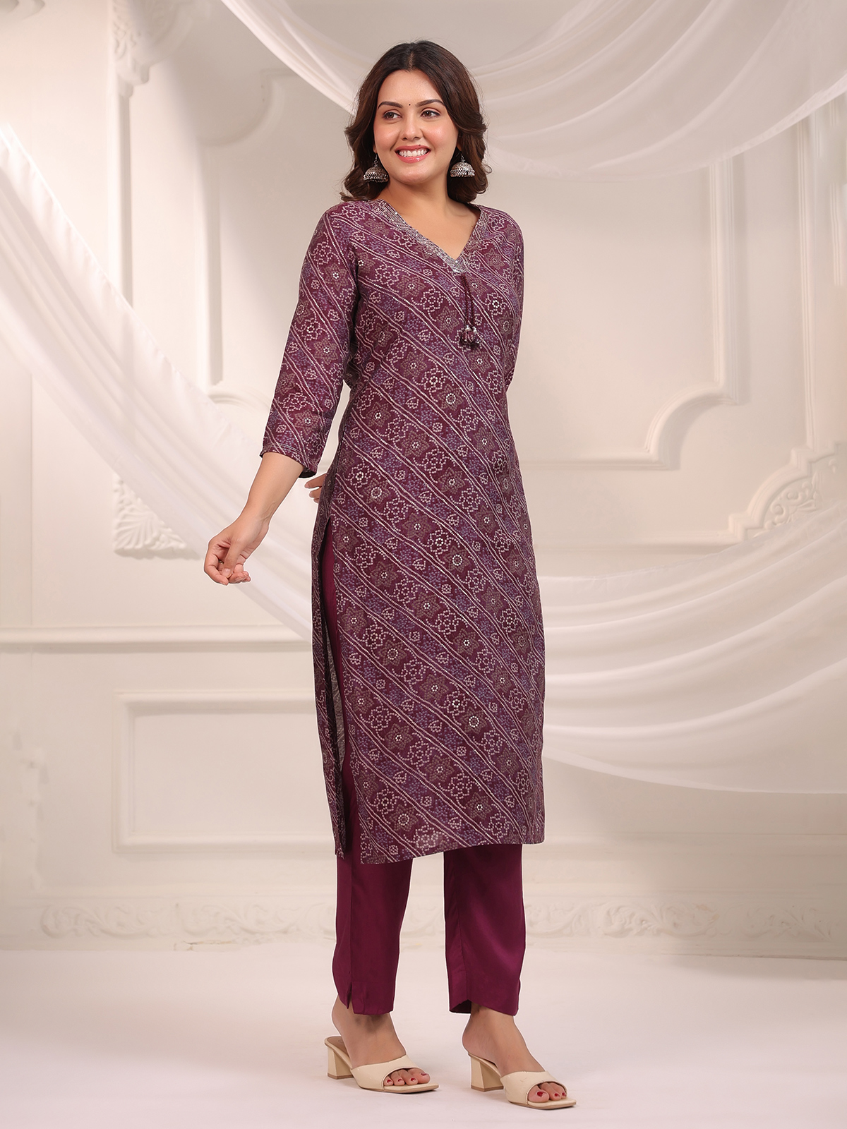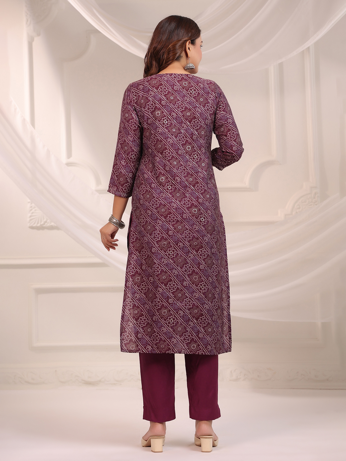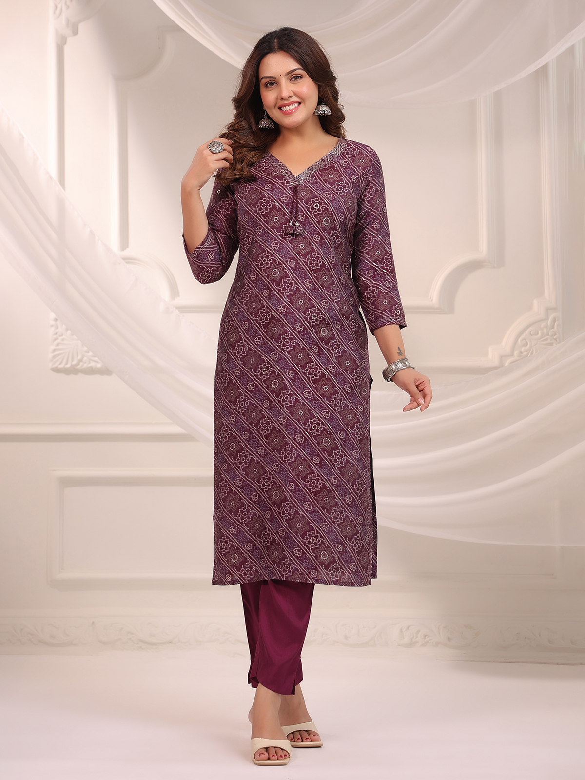 Embrace effortless festive charm with this elegant maroon cotton kurti set designed for graceful ethnic styling. The kurti features a beautiful bandhej print enhanced with delicate thread and sequin detailing, adding a subtle festive sparkle. Styled with a V-neckline and quarter sleeves, it is paired with a comfortable pant, making it a perfect choice for festive celebrations and special gatherings.