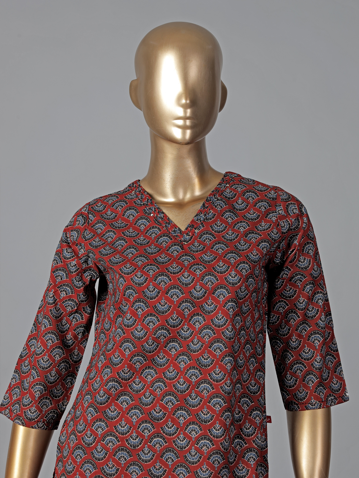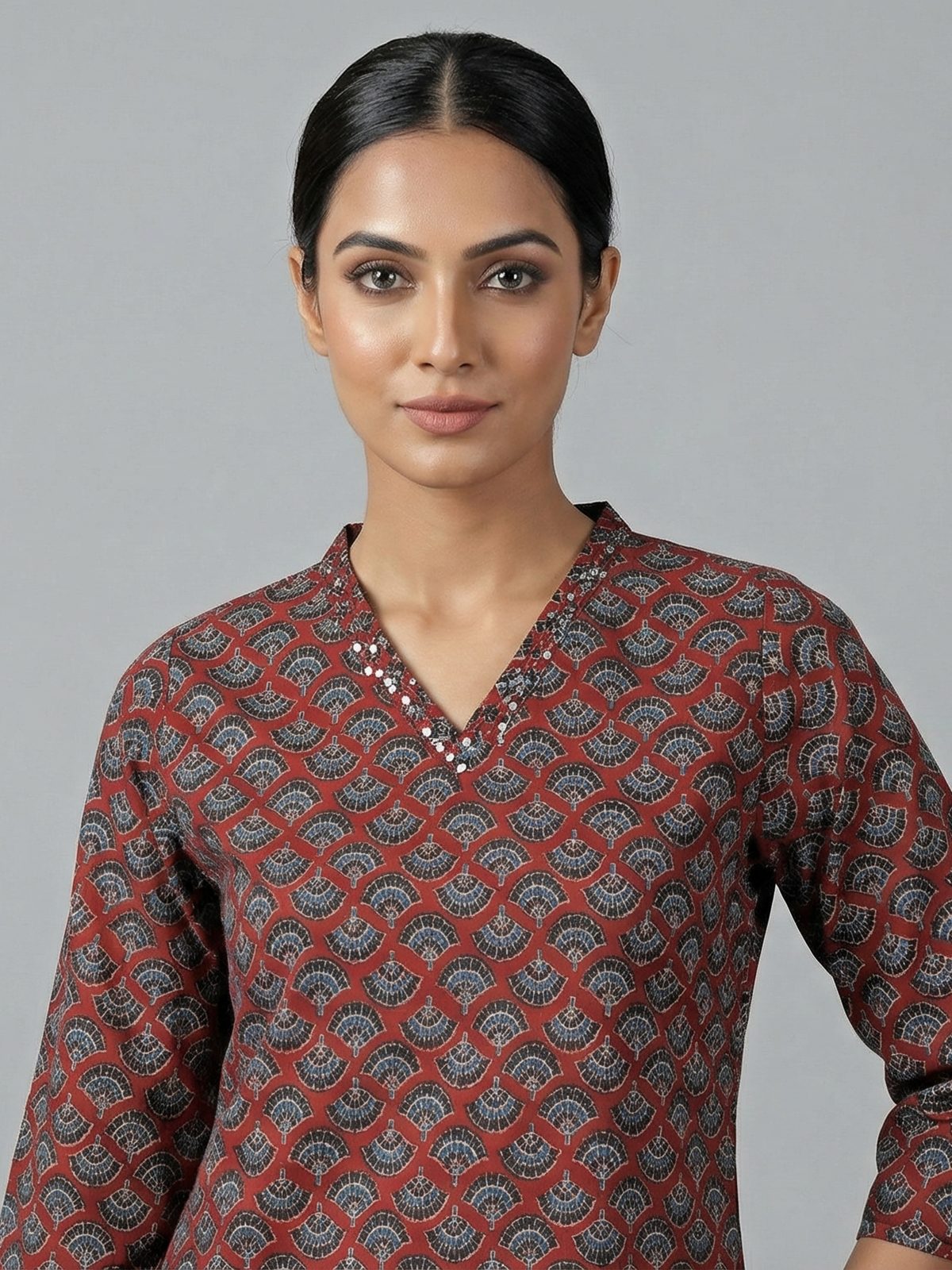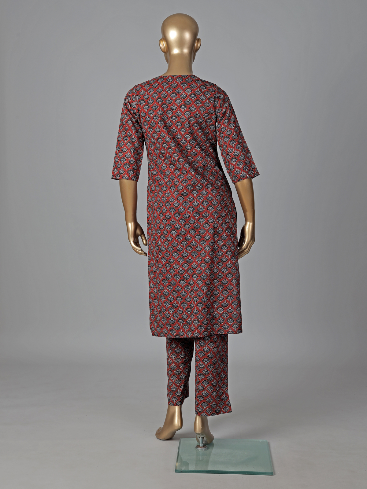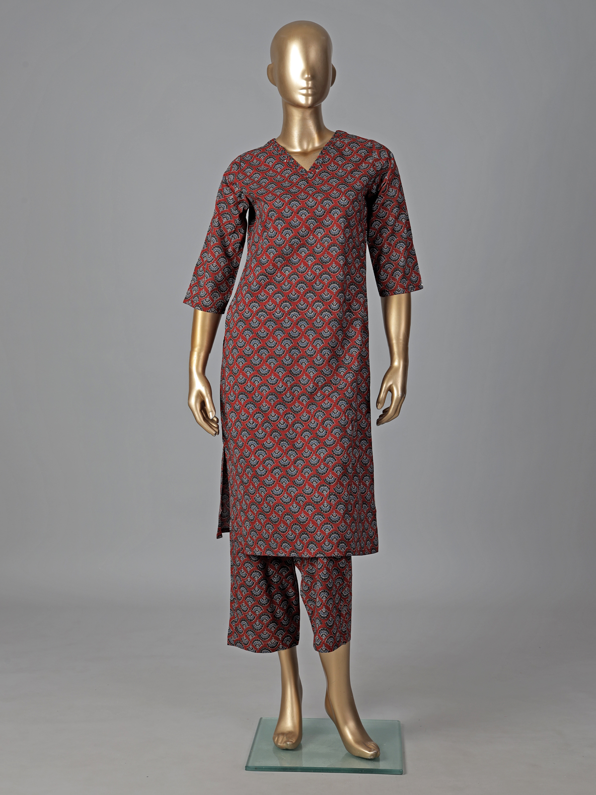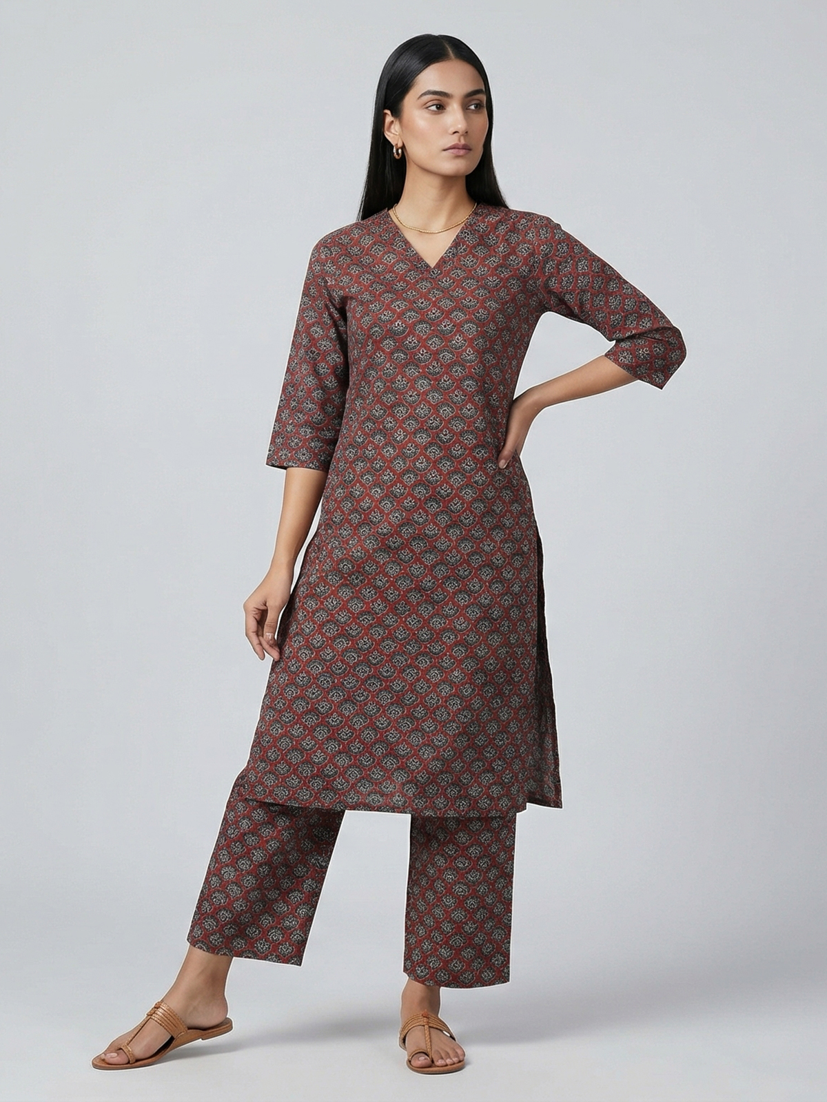 Warm maroon hues enrich this cotton kurti set adorned with simple prints. Styled in a straight cut silhouette with a V neckline and quarter sleeves, it offers effortless comfort. Paired with pants, it is ideal for daily casual wear.