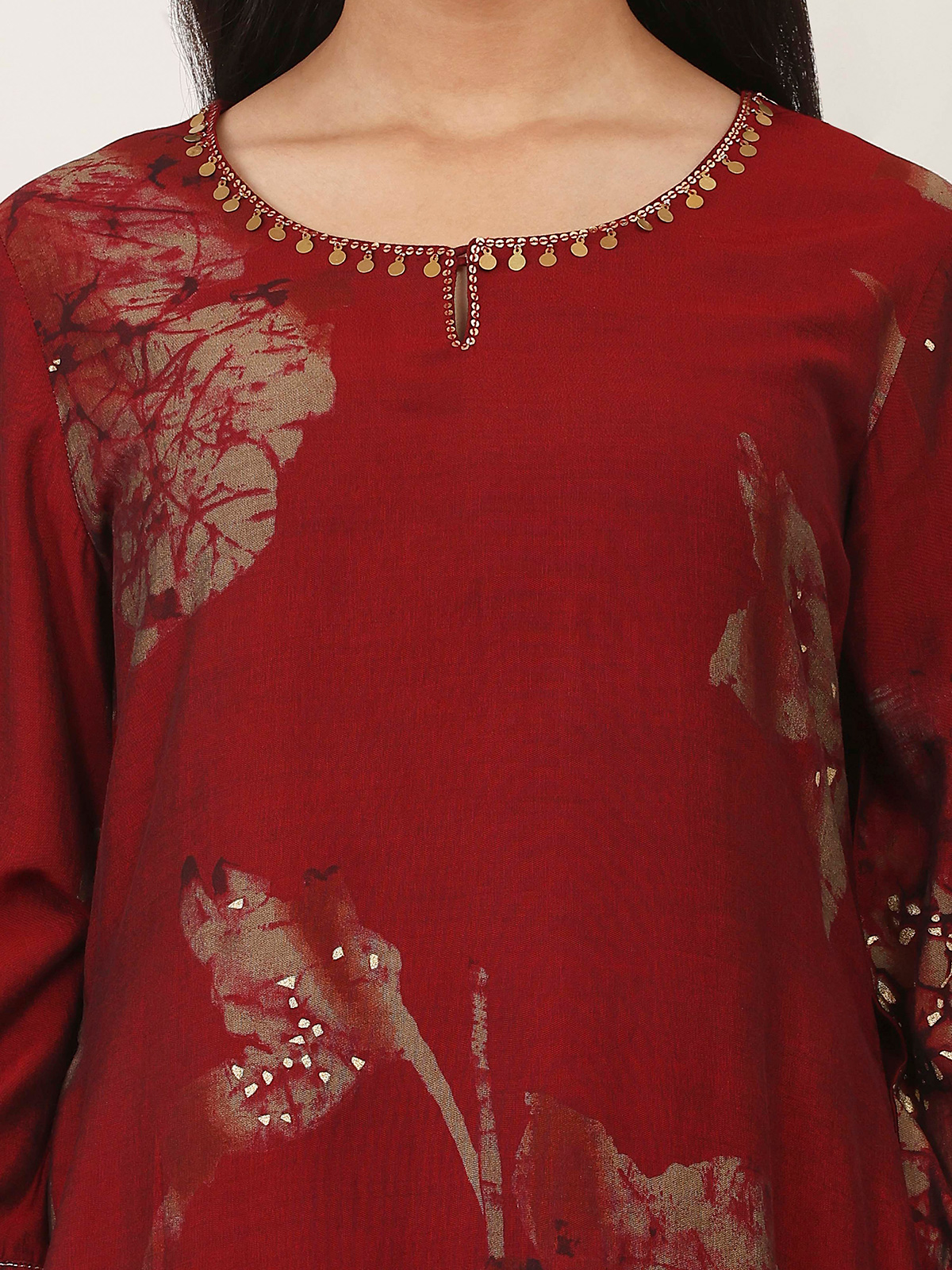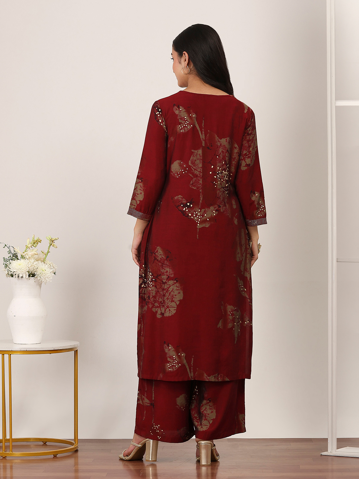 Deep maroon tones enrich the beauty of this cotton silk kurti set crafted for casual sophistication. Adorned with elegant prints, it features a keyhole neckline and quarter sleeves for a refined look. Paired with comfortable palazzo pants, this ensemble creates a balanced blend of style and ease, ideal for everyday wear and relaxed ethnic occasions.