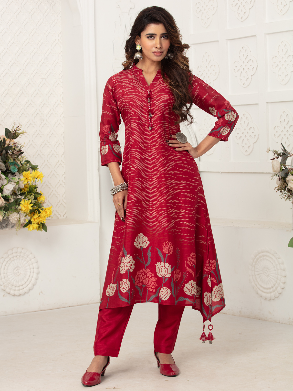An elegant maroon kurti set in russian silk, this ensemble showcases attractive prints, a mandarin collar, three quarter sleeves, and includes a dupatta and pants for a complete festive look.