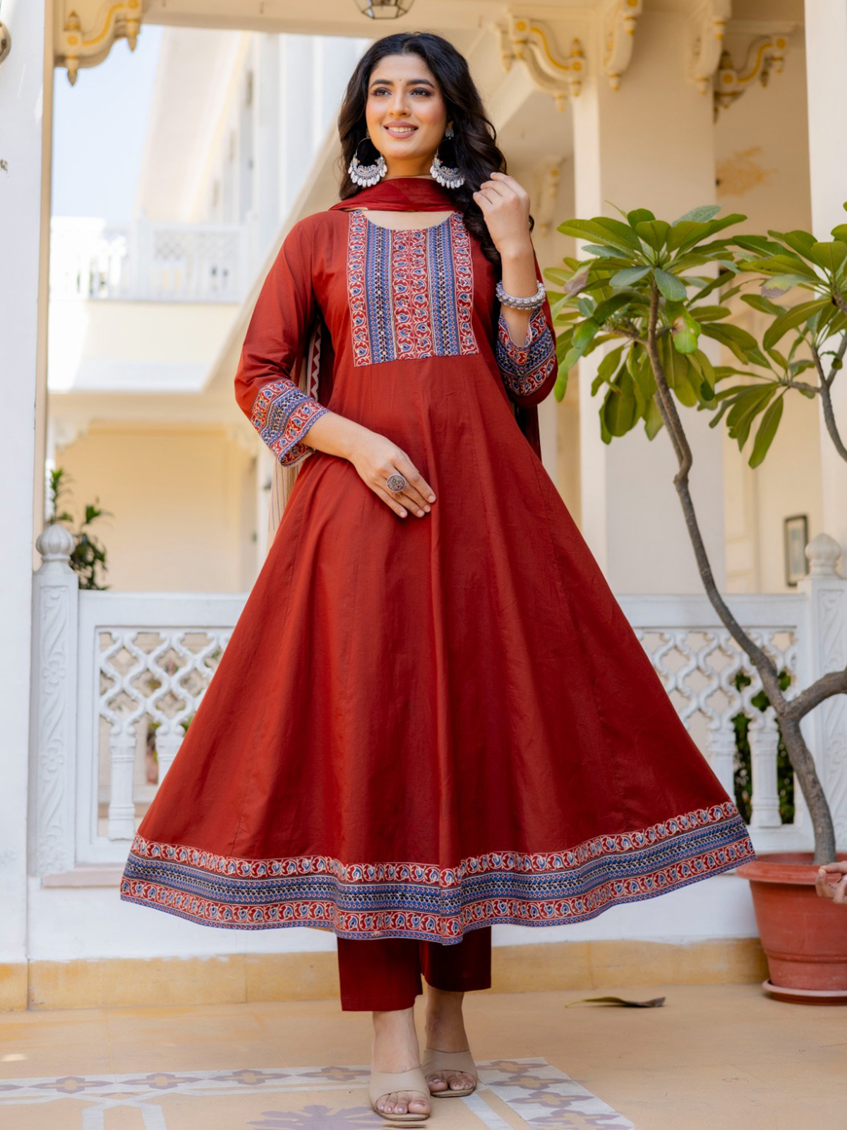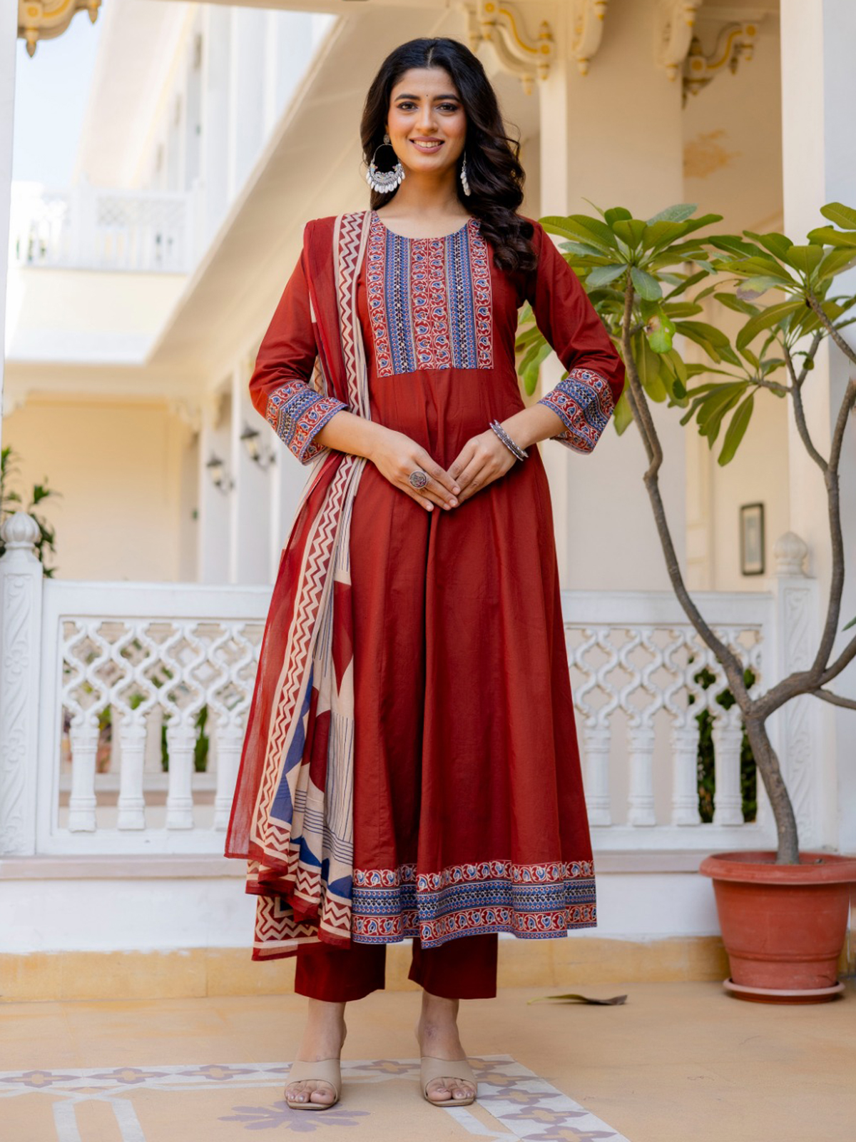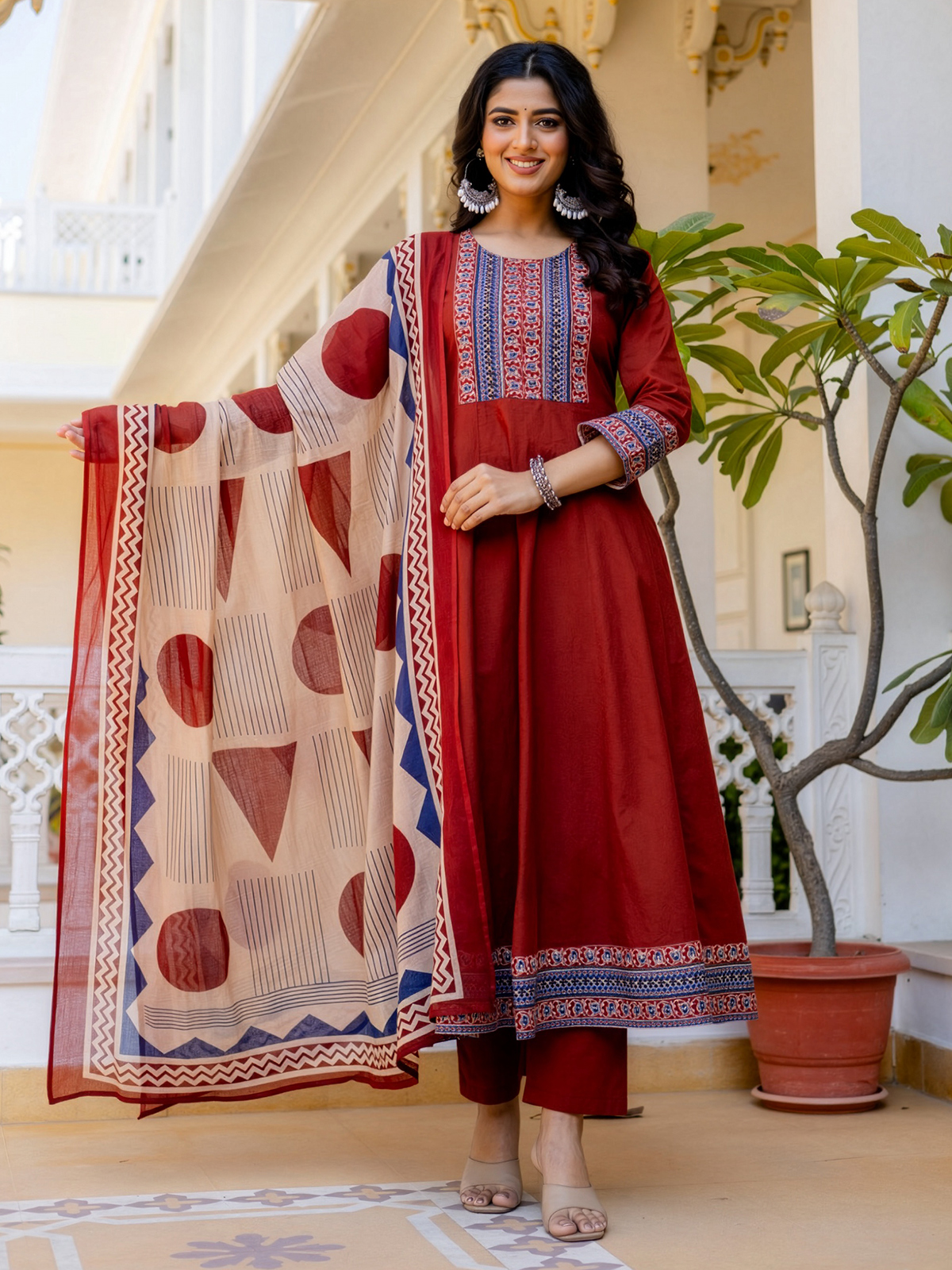 Celebrating festive grace, this printed maroon cotton kurti set adds refined charm to your elegant presence. Tailored with a round neckline and quarter sleeves, it is beautifully embellished with delicate beads and sequins for subtle shimmer. Perfect for festive occasions, it is paired with comfortable pants and a coordinated printed dupatta for a complete look.