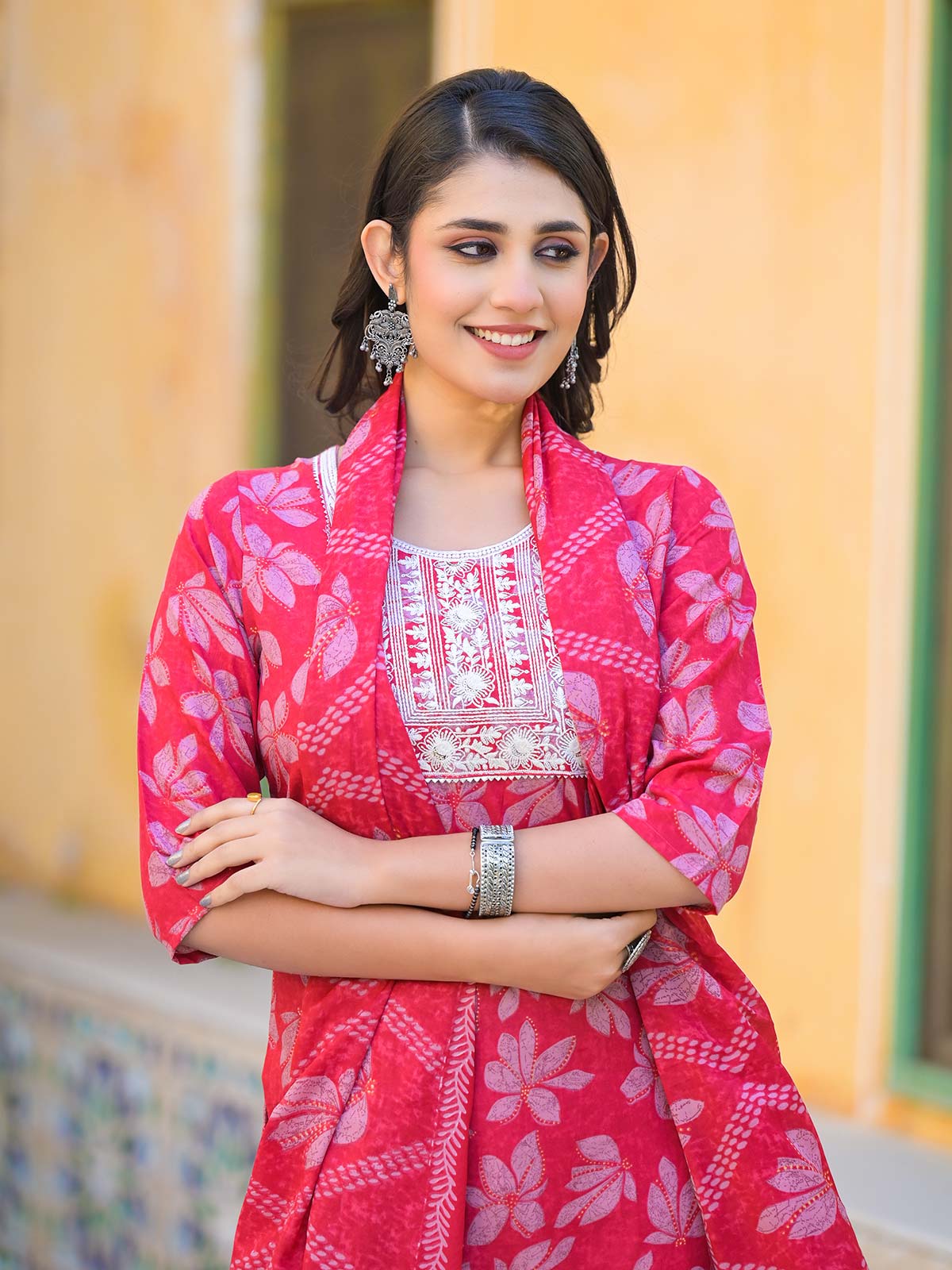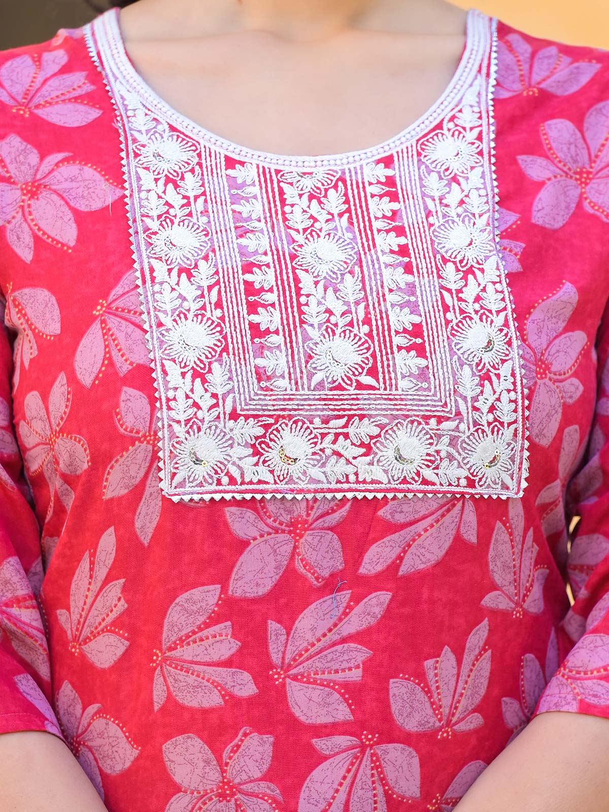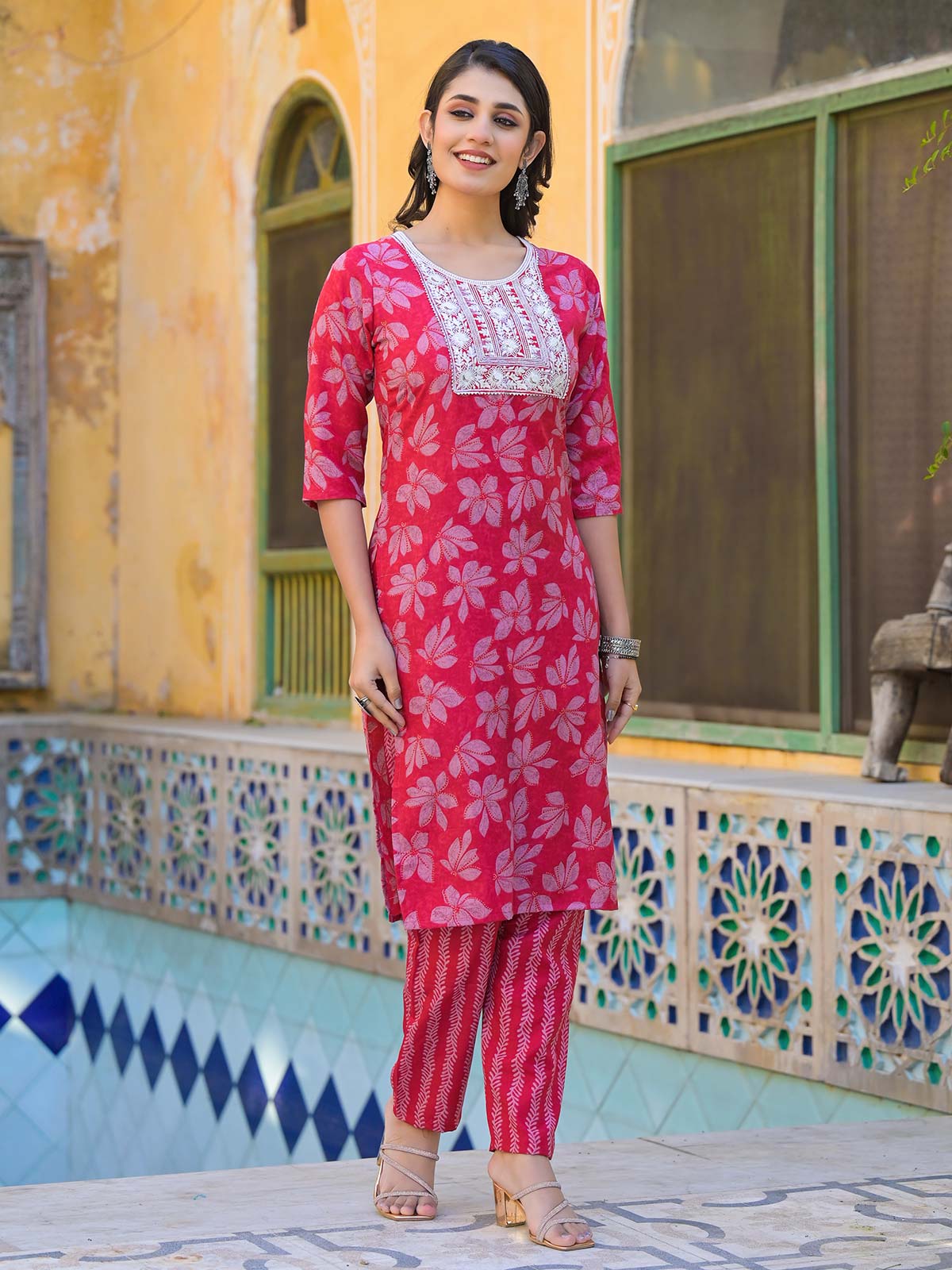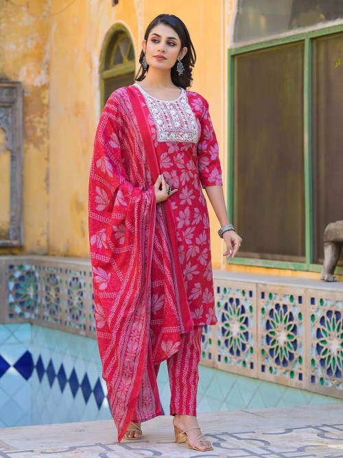 This maroon printed cotton silk kurti set is an ideal choice for festivals or traditional events. With a round neck and quarter sleeves, it offers a chic and stylish design.