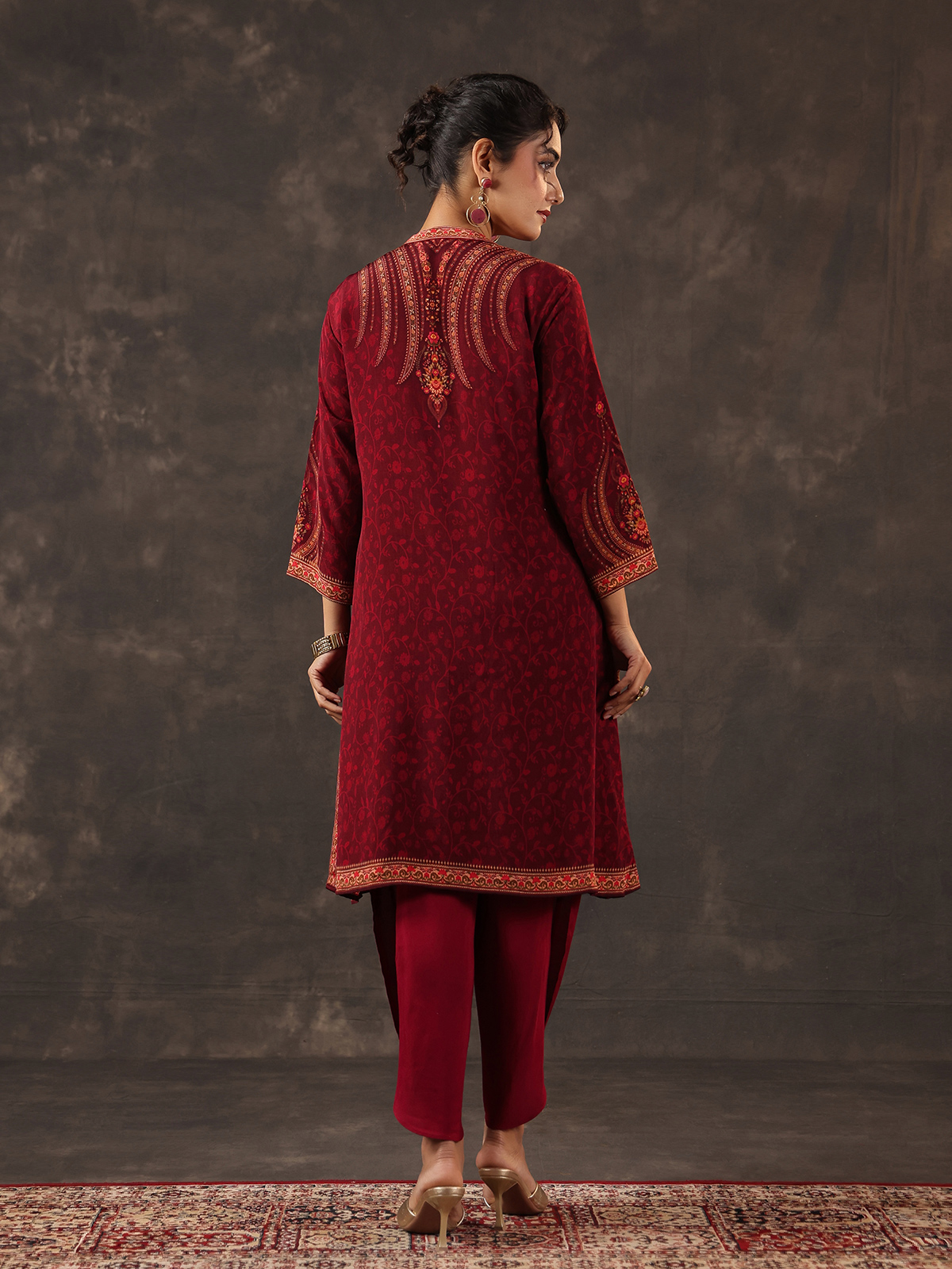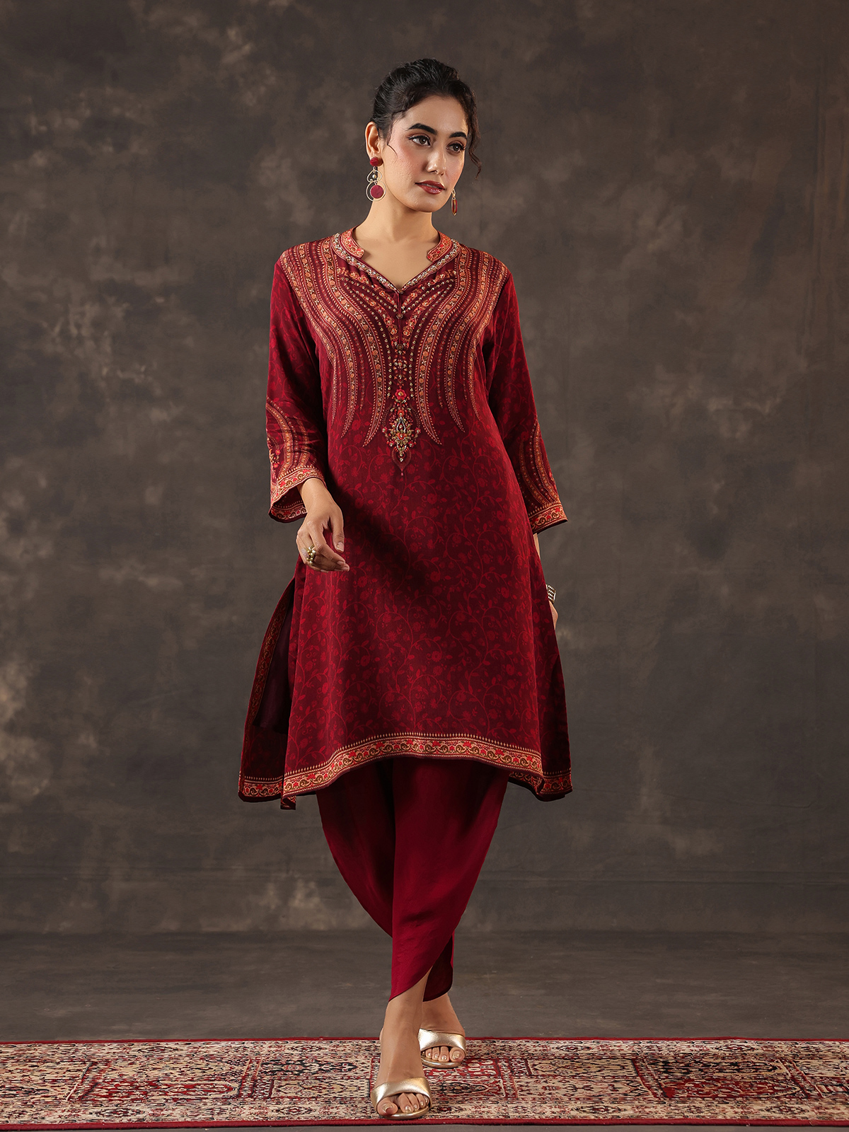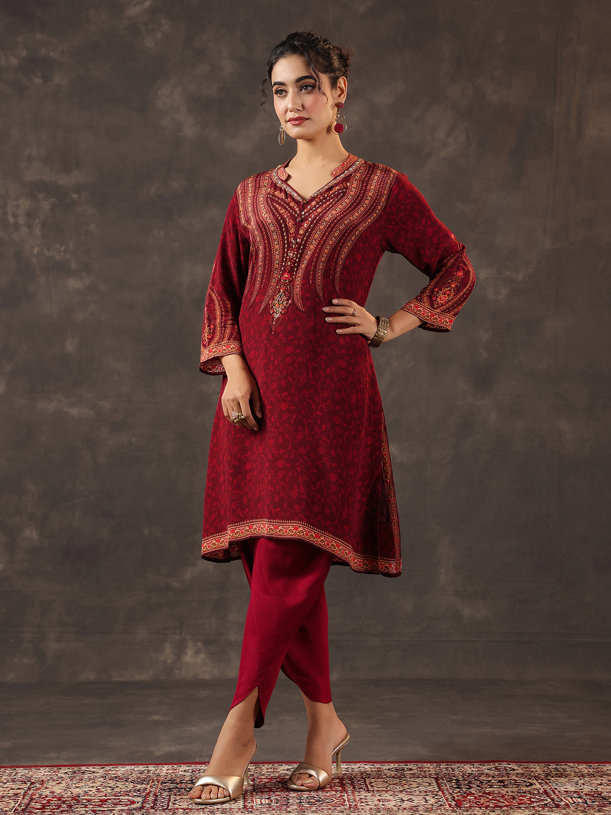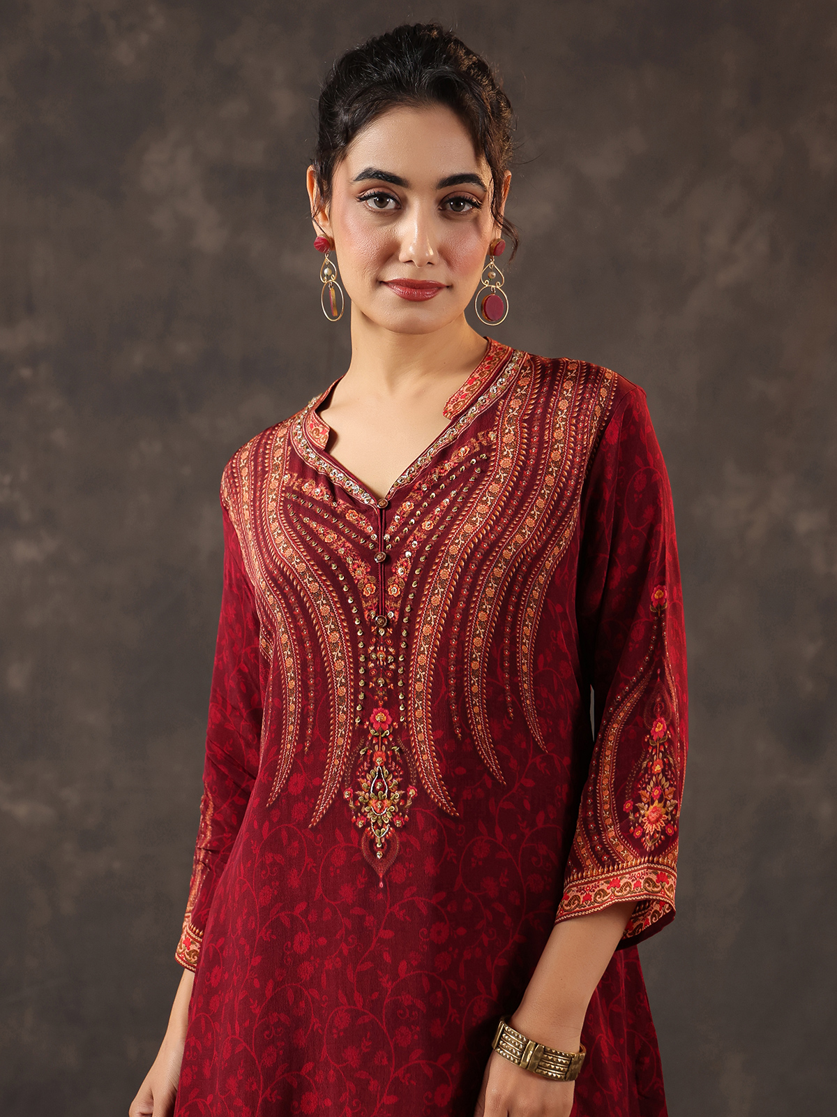Maroon Viscose Crepe Printed Kurti Set With Embellishments
