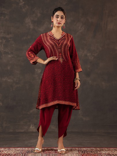 Rich festive hues define this maroon viscose crepe kurti set designed with traditional charm. The printed kurti features a stylish collar neckline and quarter sleeves, enhanced with thread, sequins, zardosi and bead embellishments. Styled with a fashionable dhoti bottom, the ensemble offers a graceful yet contemporary ethnic look perfect for casual gatherings and festive occasions.