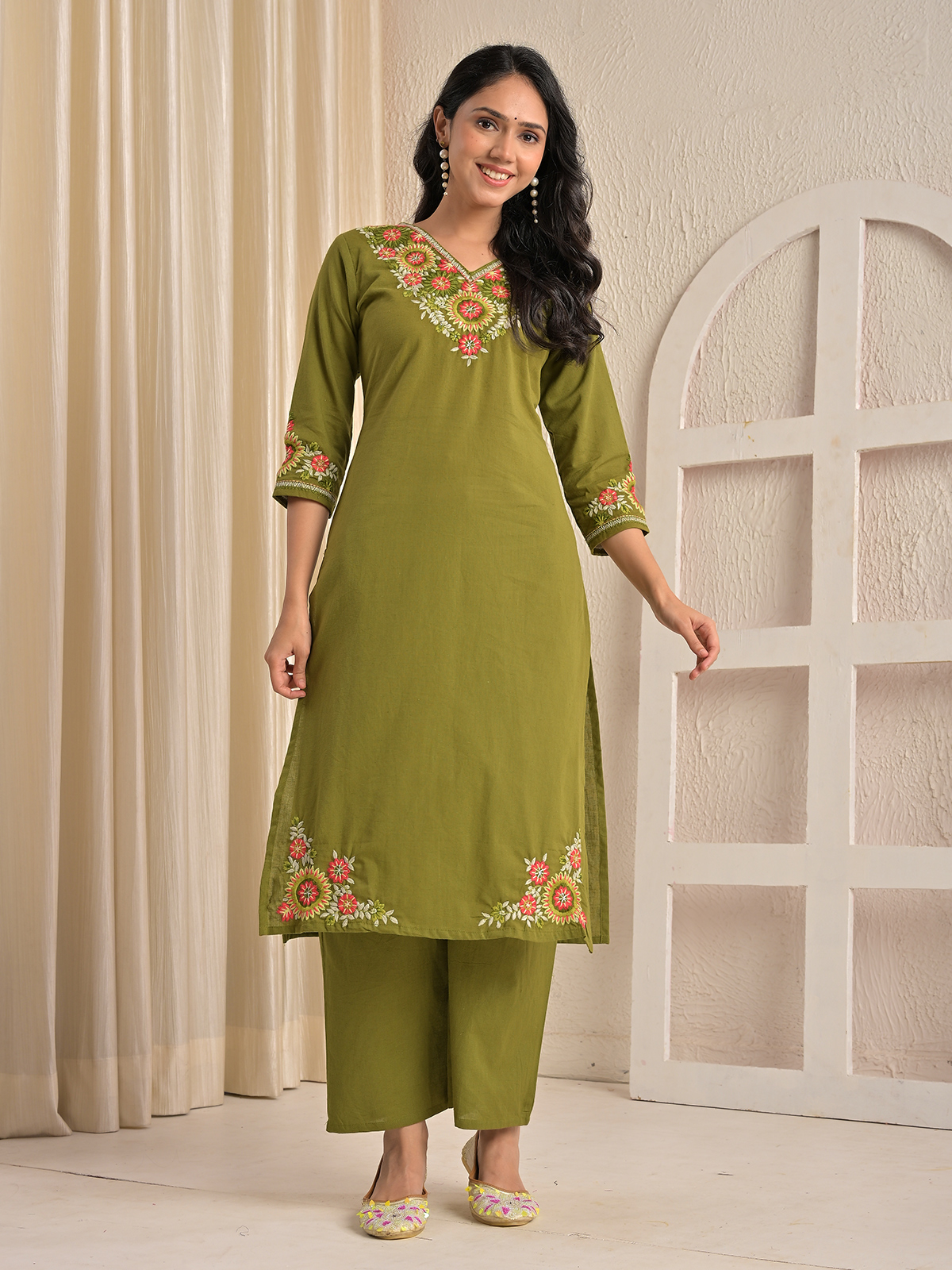 This mehendi green silk kurti set showcases graceful embroidery that enhances its straight-fit design. Styled with a V neckline and quarter sleeves, it comes with a coordinating pant, delivering a balanced blend of elegance and comfort for festive gatherings and casual ethnic occasions.