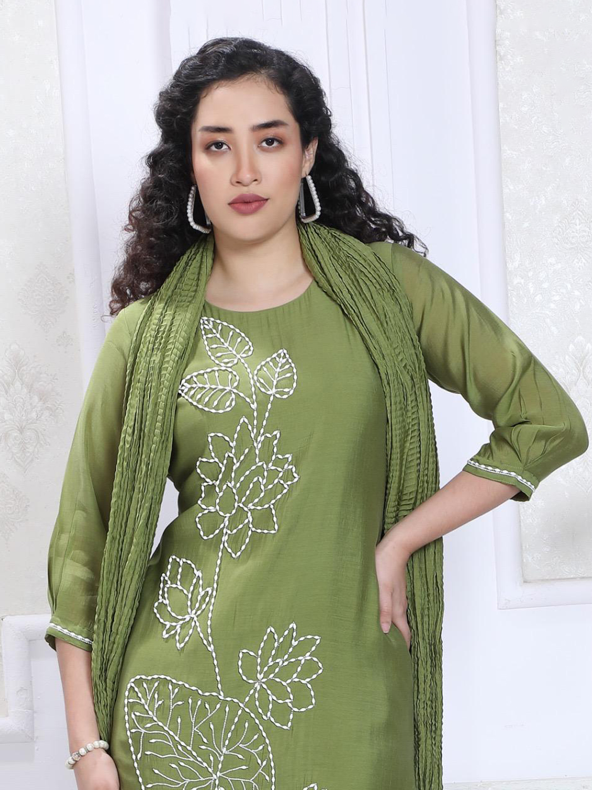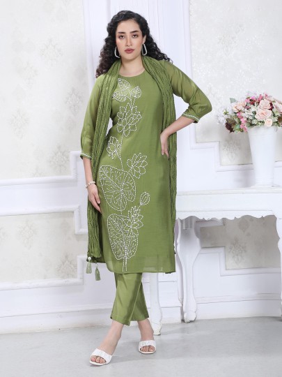 This mehendi green silk kurti set. Features a classic straight cut silhouette enhanced with delicate thread work. Styled with a round neckline and quarter sleeves, it is paired with comfortable pants and a dupatta. Perfect for festive occasions, offering elegance, comfort and timeless traditional charm.
