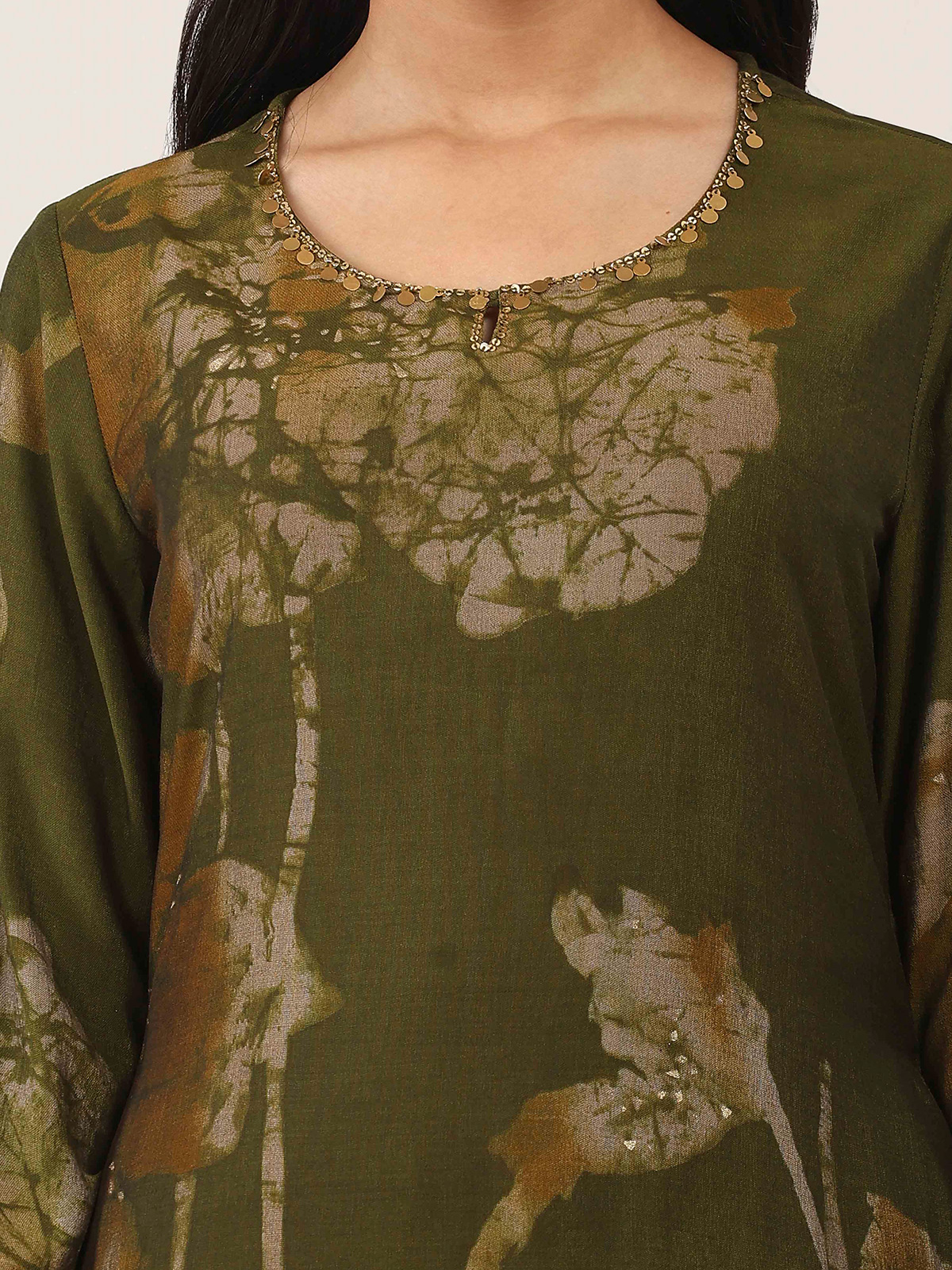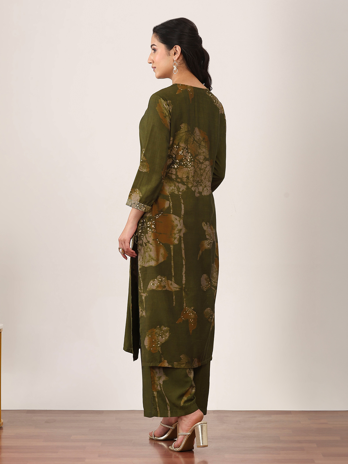Earthy mehendi olive hues define this cotton silk kurti set designed for relaxed elegance. Featuring subtle printed patterns, it is styled with a keyhole neckline and quarter sleeves for a graceful touch. Paired with flowing palazzo bottoms, this ensemble offers effortless comfort and charm, making it perfect for casual outings and easy festive moments.