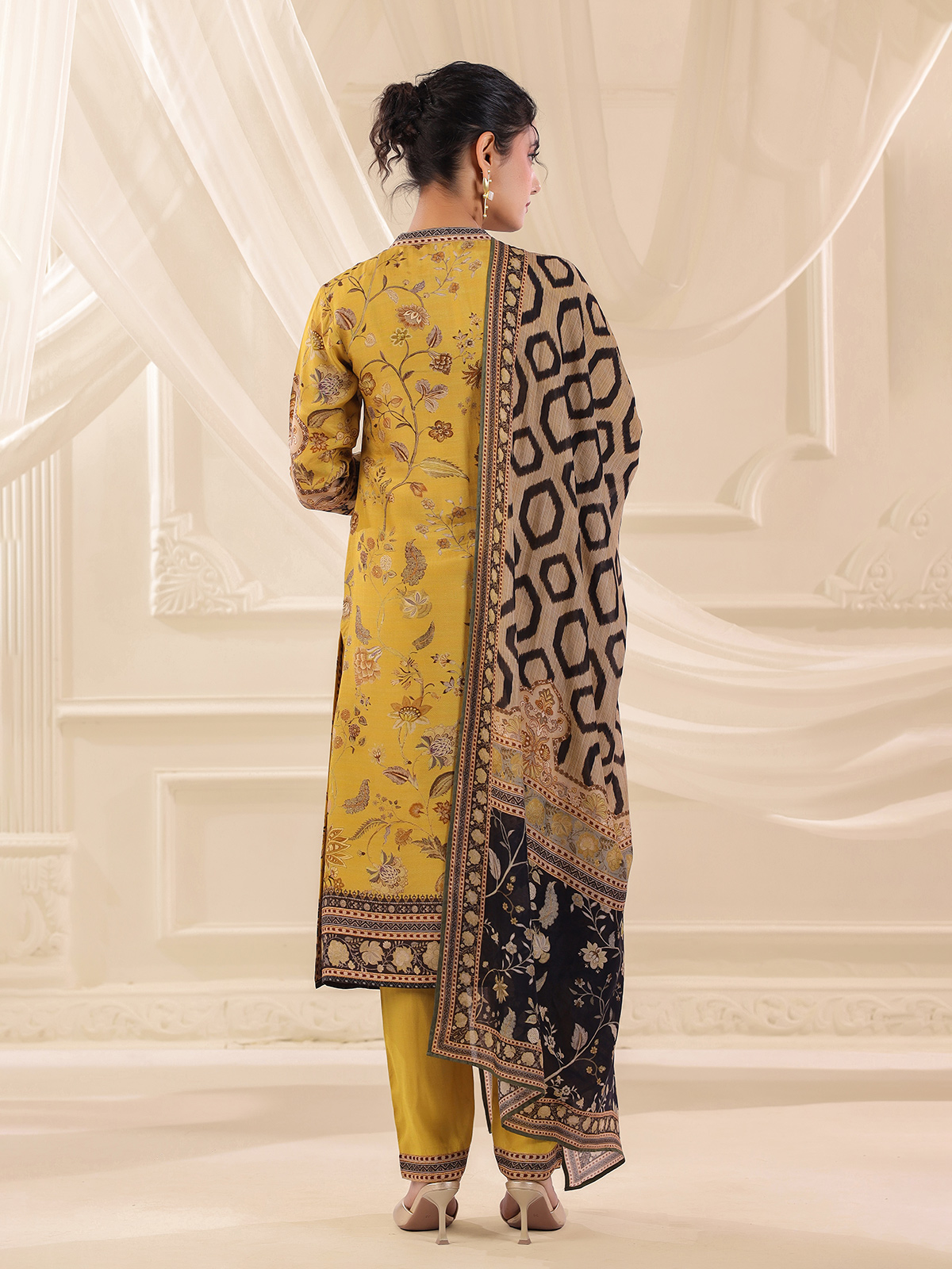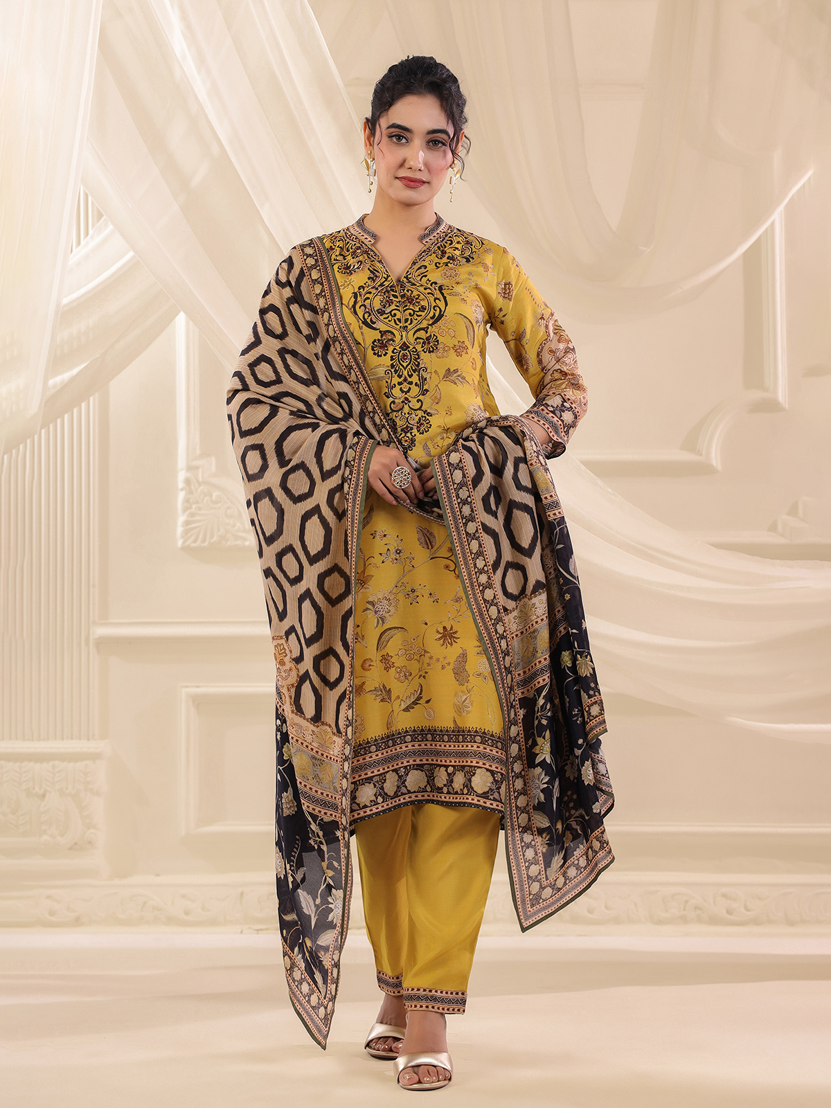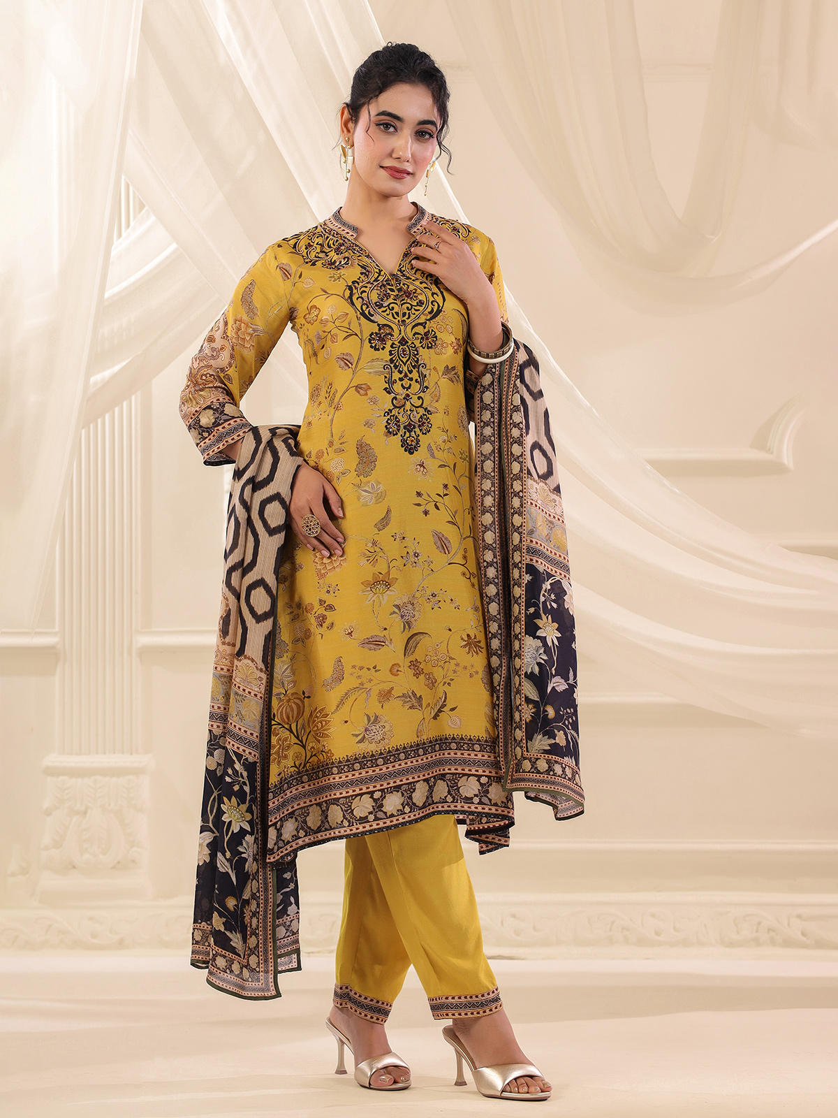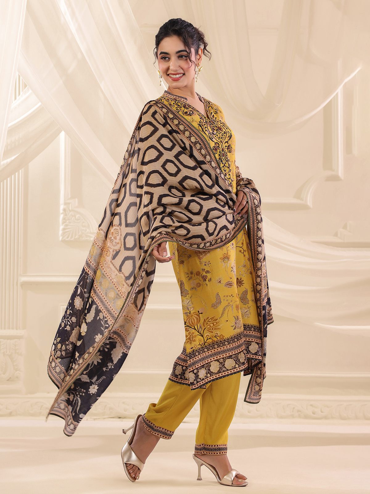 Earthy festive hues enhance the charm of this mehendi yellow dola silk kurti set. The printed kurti features a stylish collar neckline and quarter sleeves. Highlighted with sequins, beads and thread embellishments that add subtle sparkle. Paired with pants and a flowing dupatta, the ensemble creates a graceful ethnic look for festive gatherings.