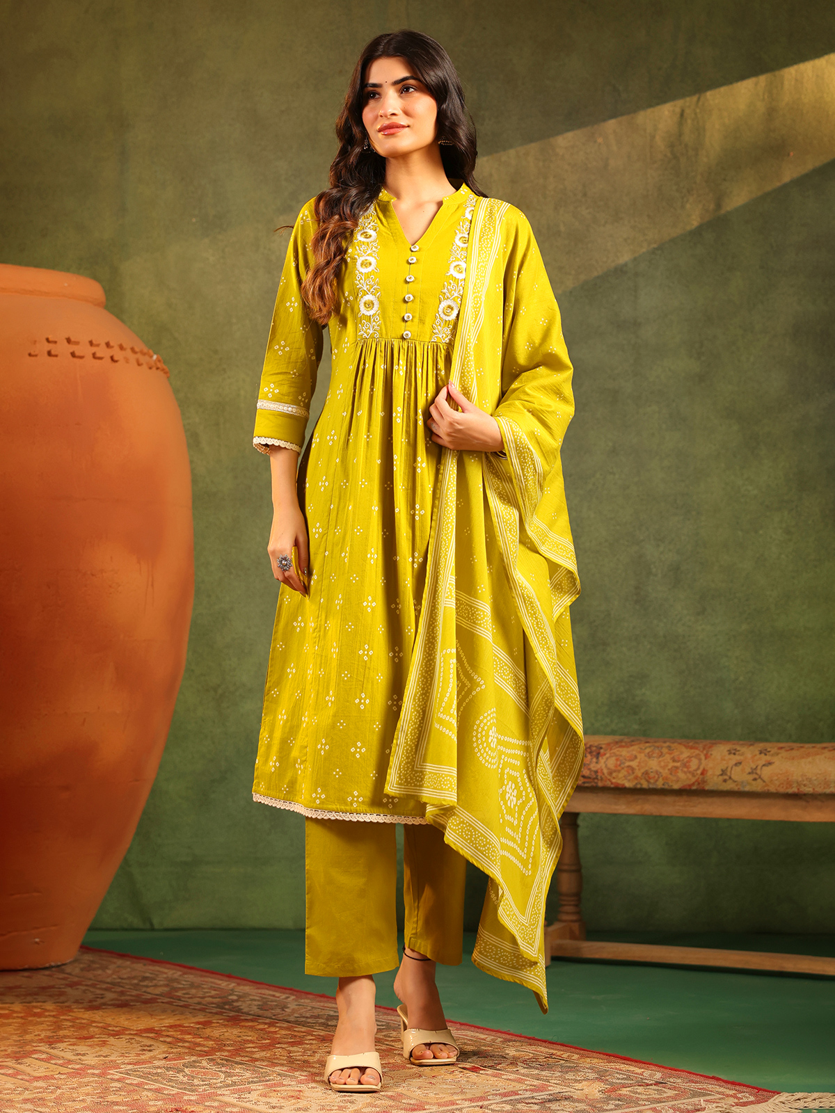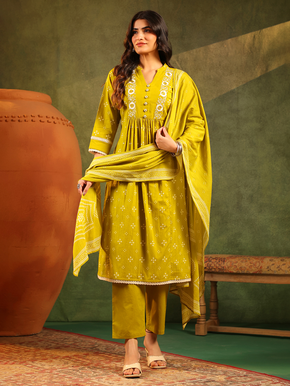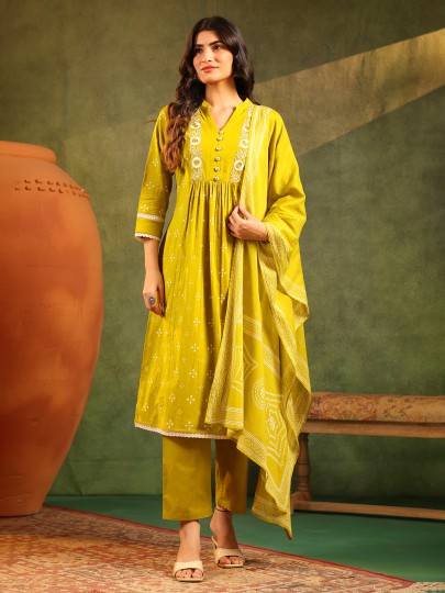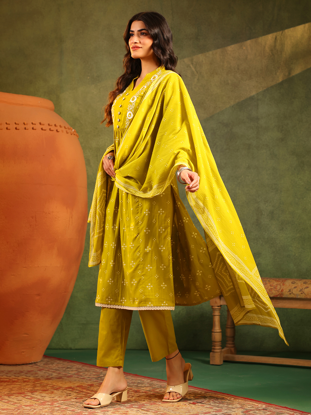 Enhancing your festive glow, this mehendi yellow cotton silk kurti set exudes fresh elegance and charm. Crafted with a stand neckline and quarter sleeves, featuring printed patterns along with mirror and embroidery work. Perfect for festive occasions, it is paired with a pant and a printed dupatta for a refined and stylish ensemble.